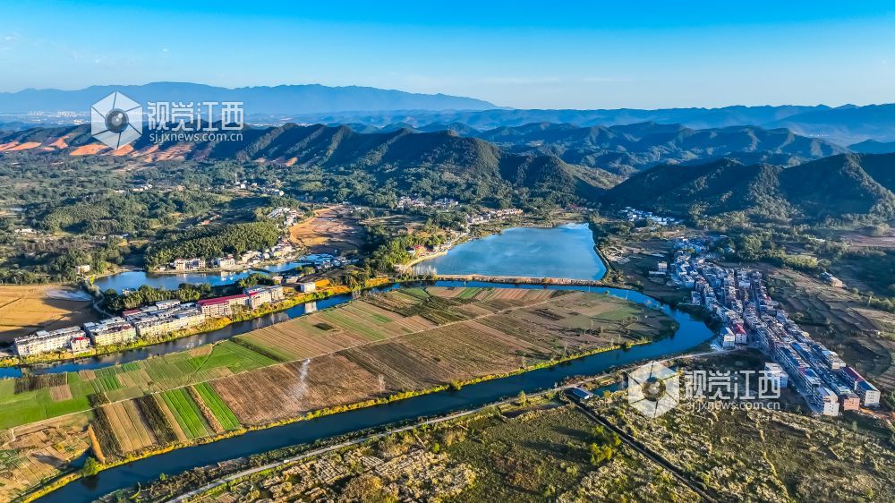 2023年11月7日,江西省九江市柴桑区新塘乡四华村,错落有致的村庄与青山、河流、田园等构成一幅多姿多彩的秋日乡村画卷。
