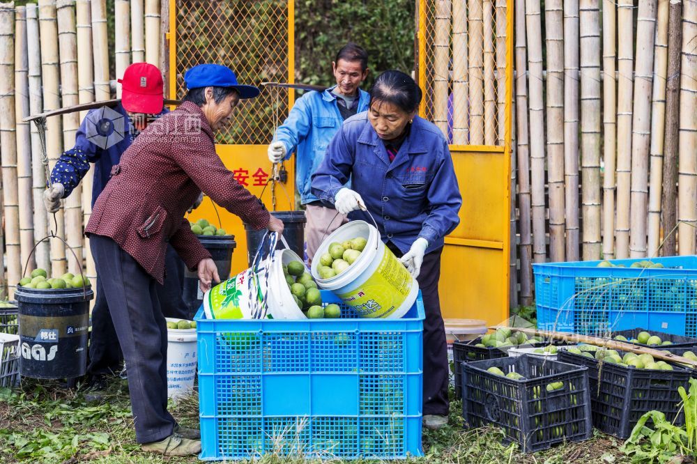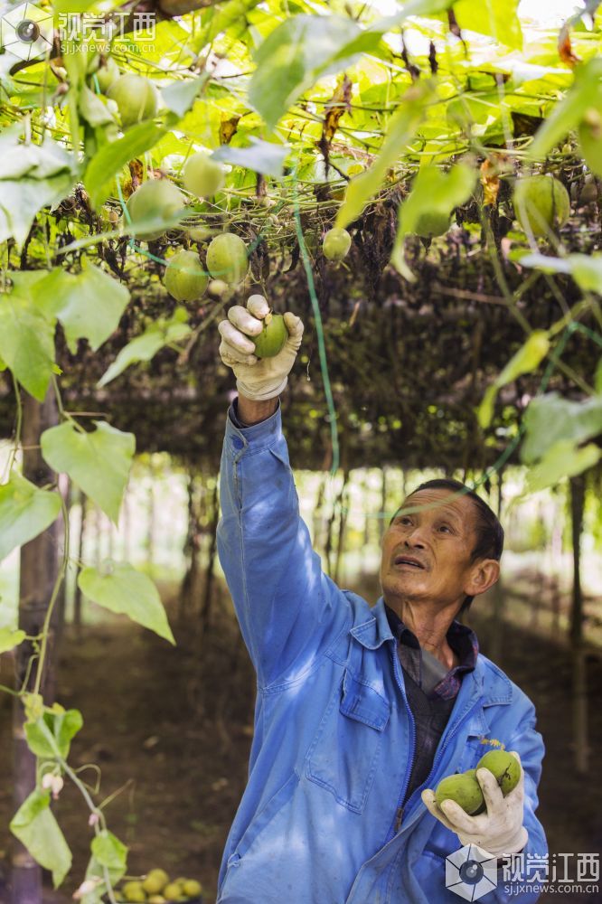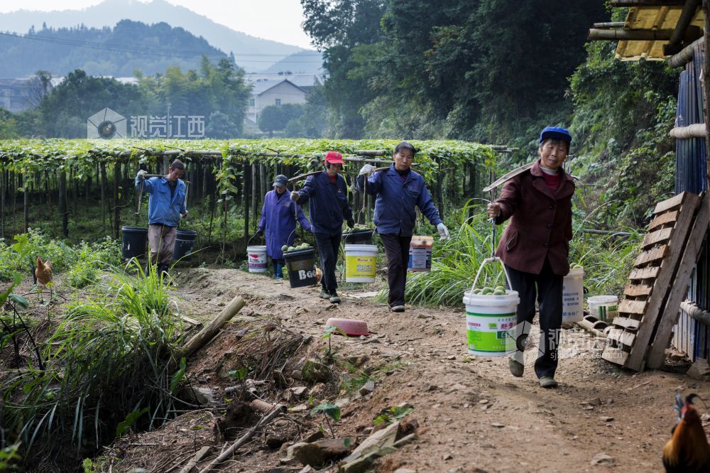 11月14日,在江西新余渝水区良山镇黄虎村的罗汉果种植基地,村民们拿着塑料桶在采摘、分拣、搬运罗汉果,一片忙碌的丰收景象。