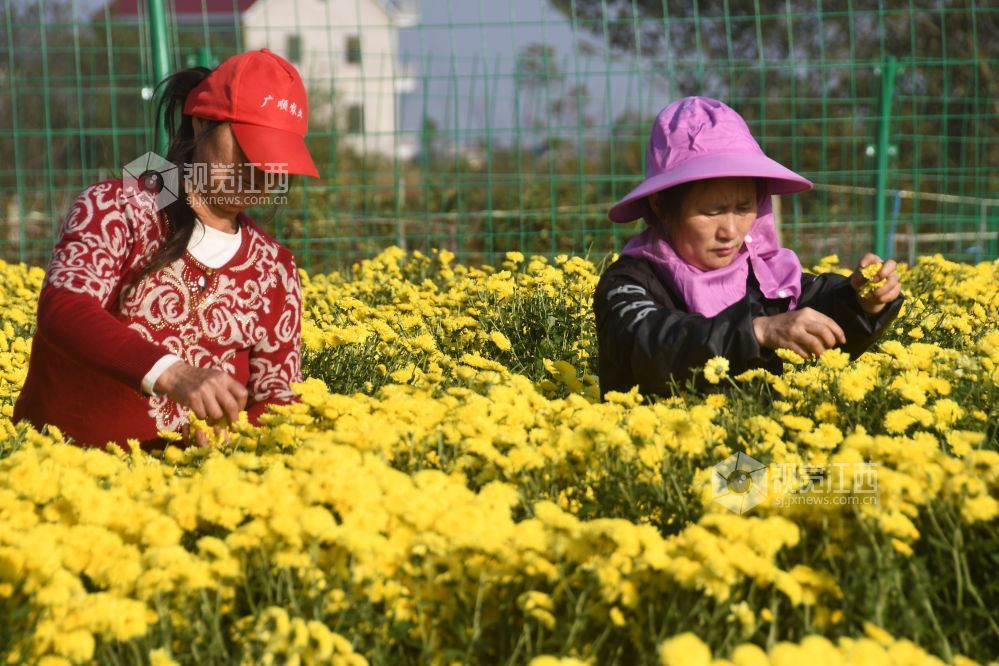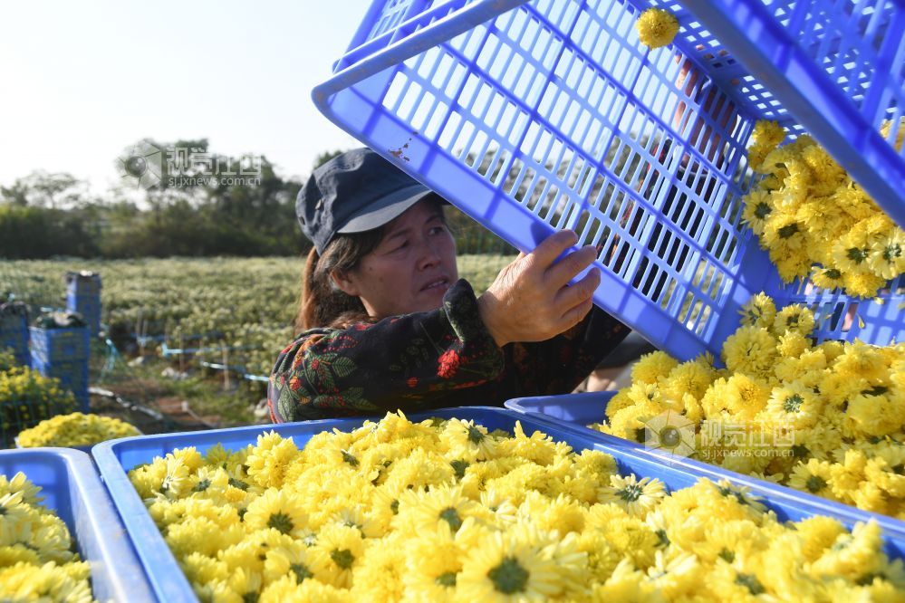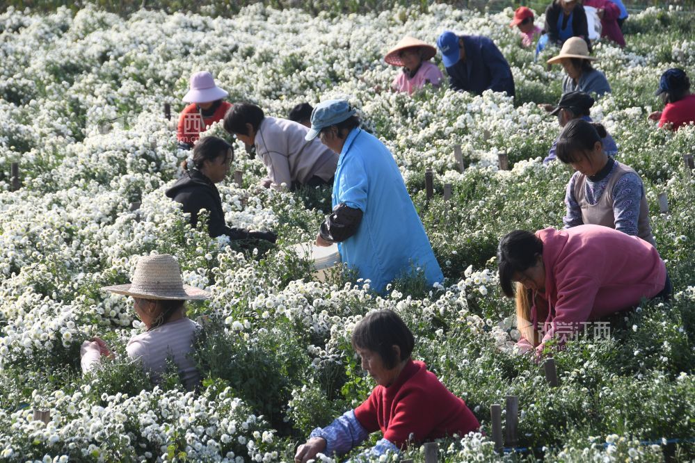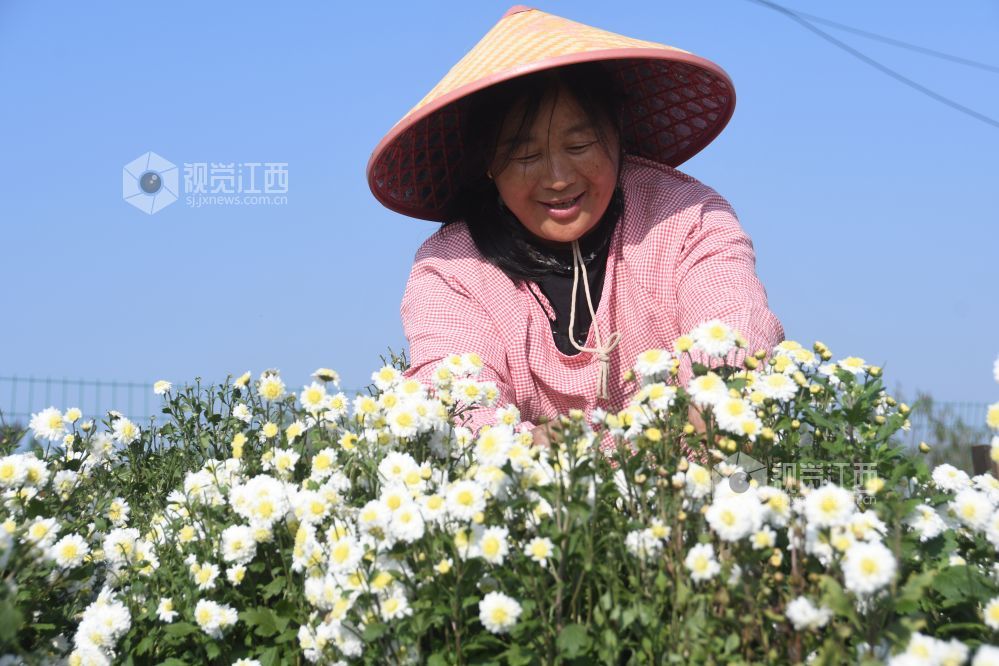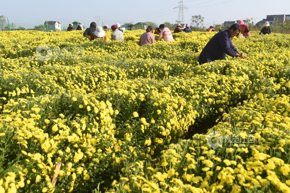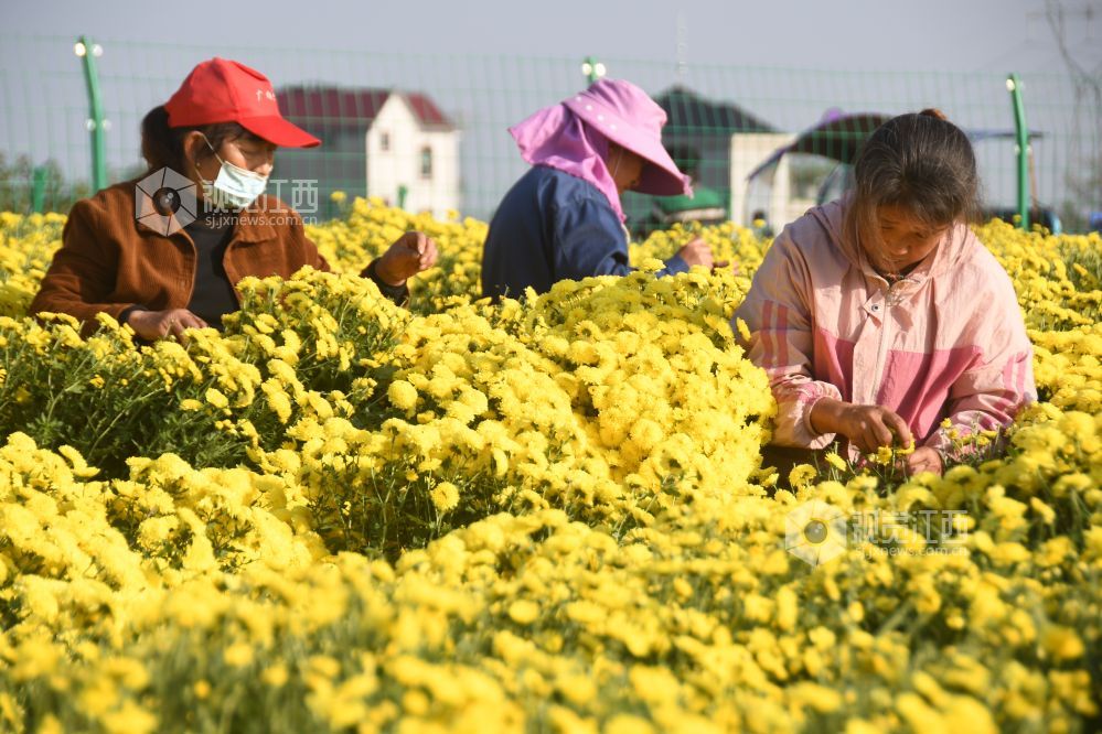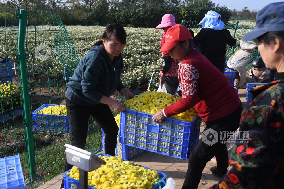 2023年11月14日,初冬的江西省鄱阳县鄱阳镇道汊村乡村振兴产业基地菊花飘香,黄菊、白菊以及各色菊花争相开放,村民们抓住晴好天气进行采摘和烘干。基地内一派繁忙景象。
