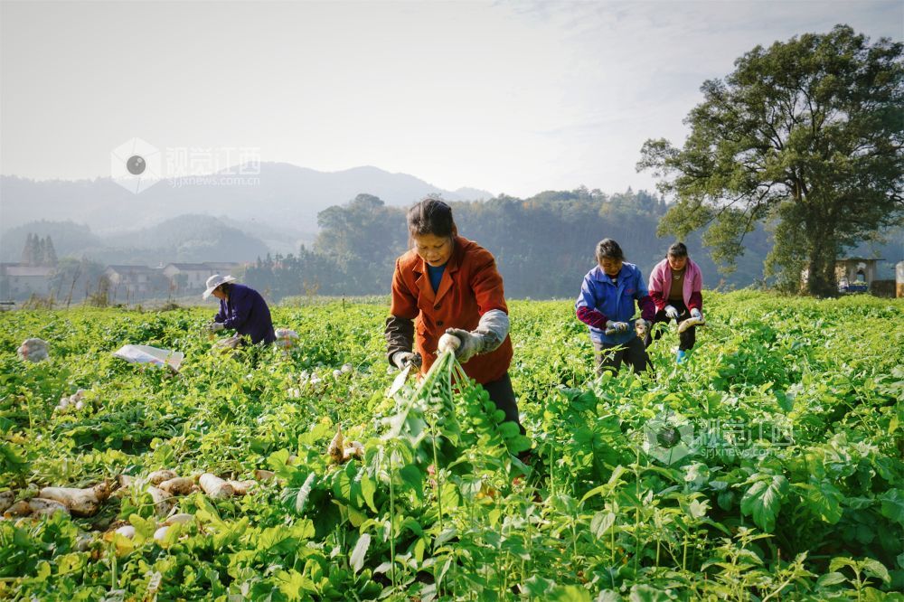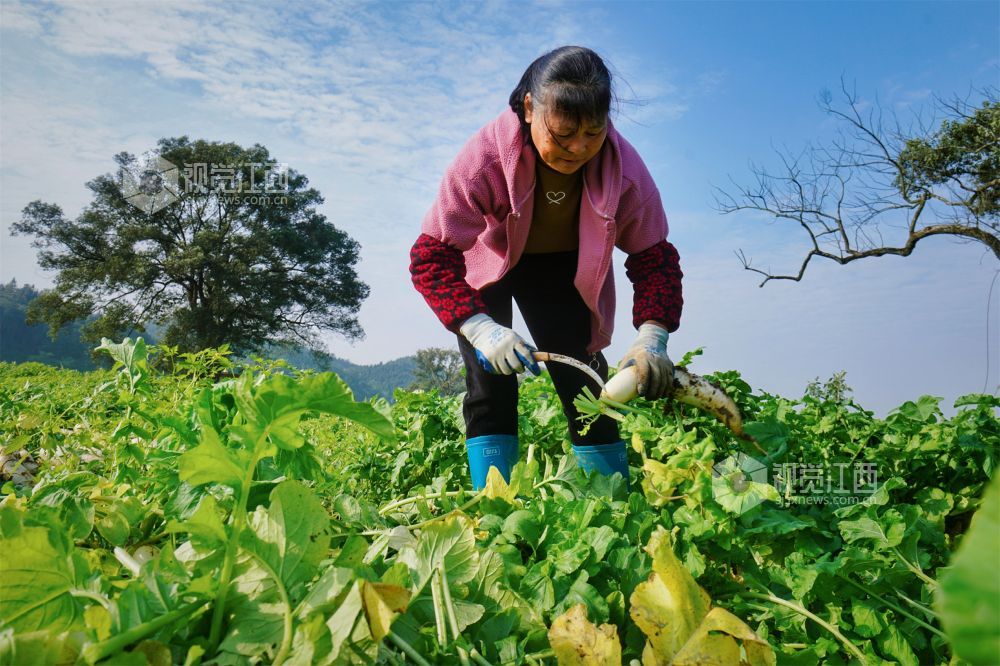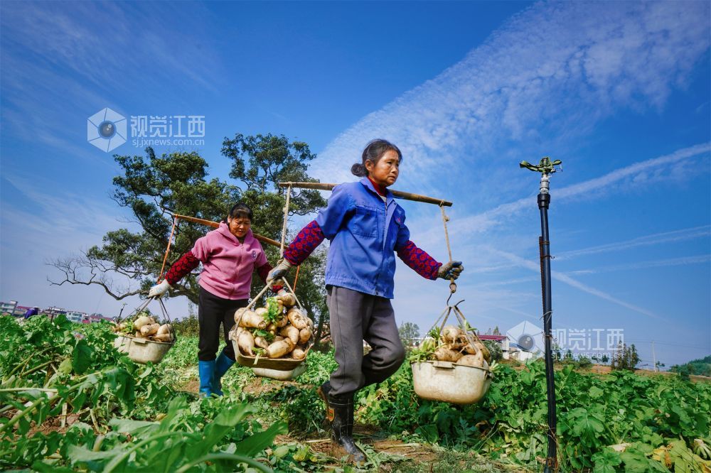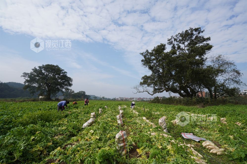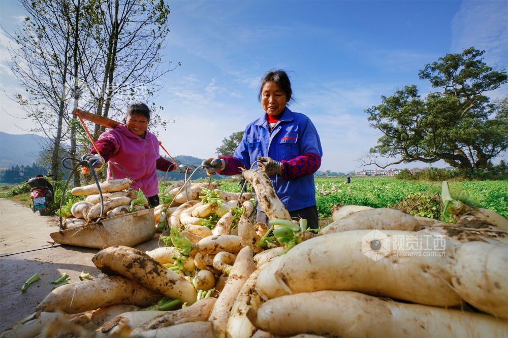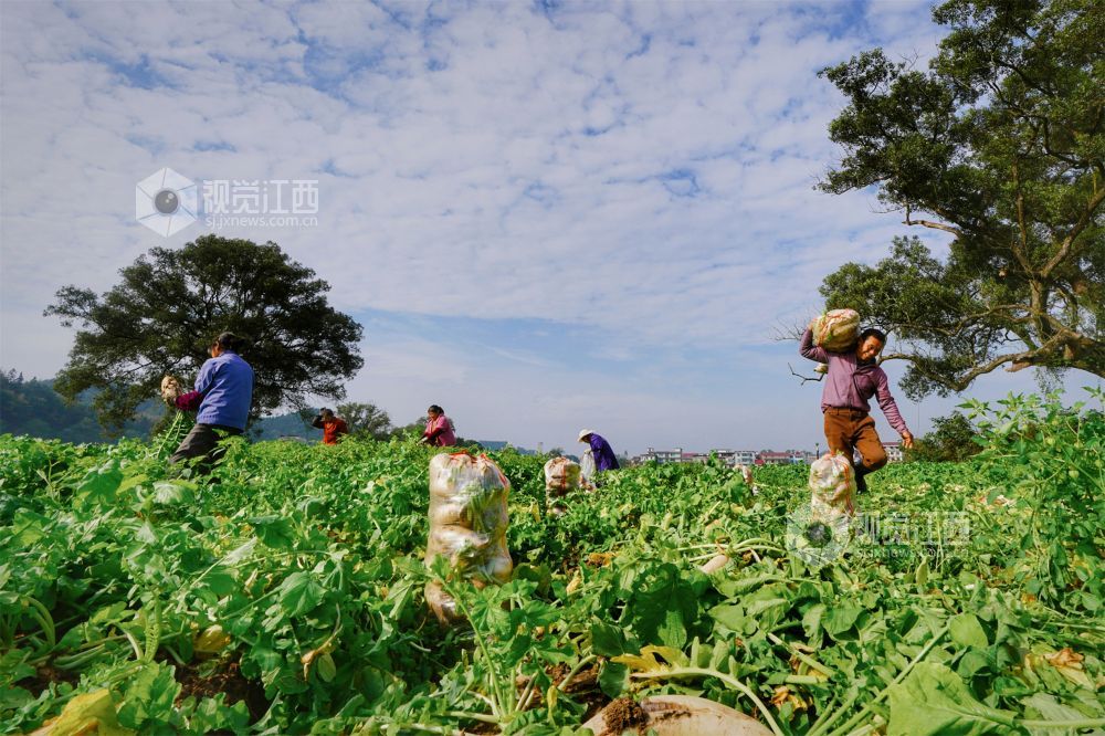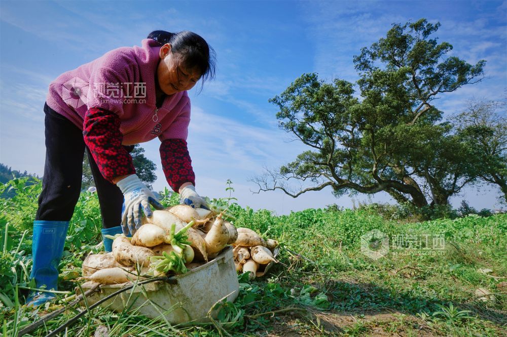 11月15日,江西省新余市分宜县洋江镇车田村萝卜基地,村民正在地里忙着采收萝卜、挑拣装袋。