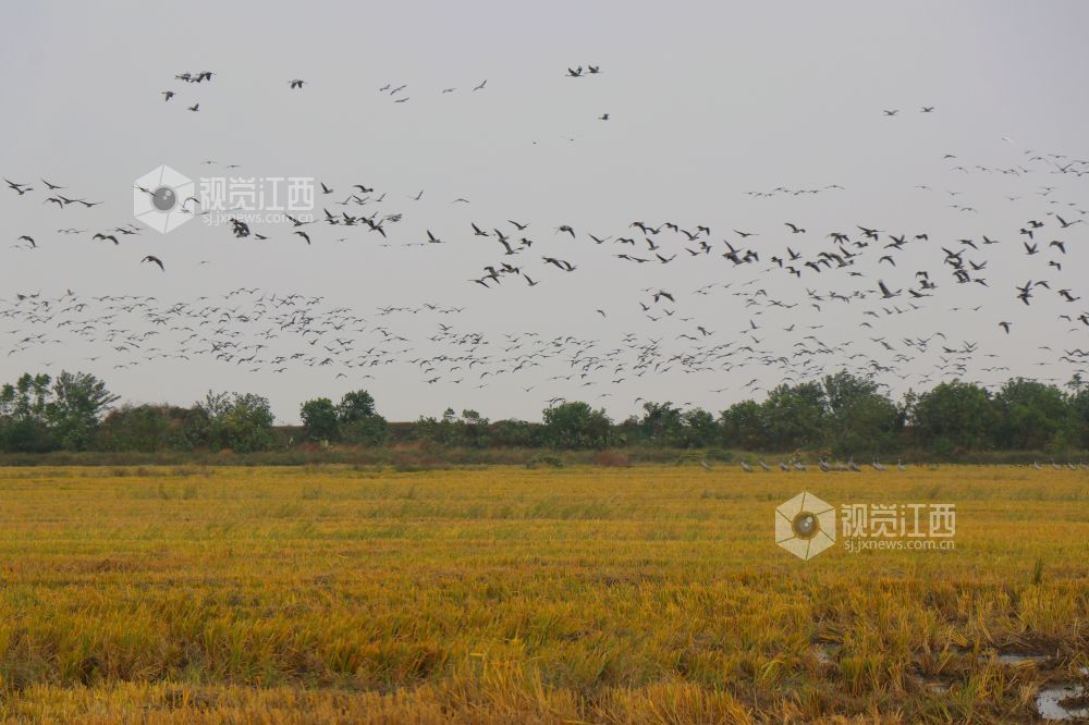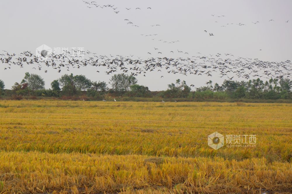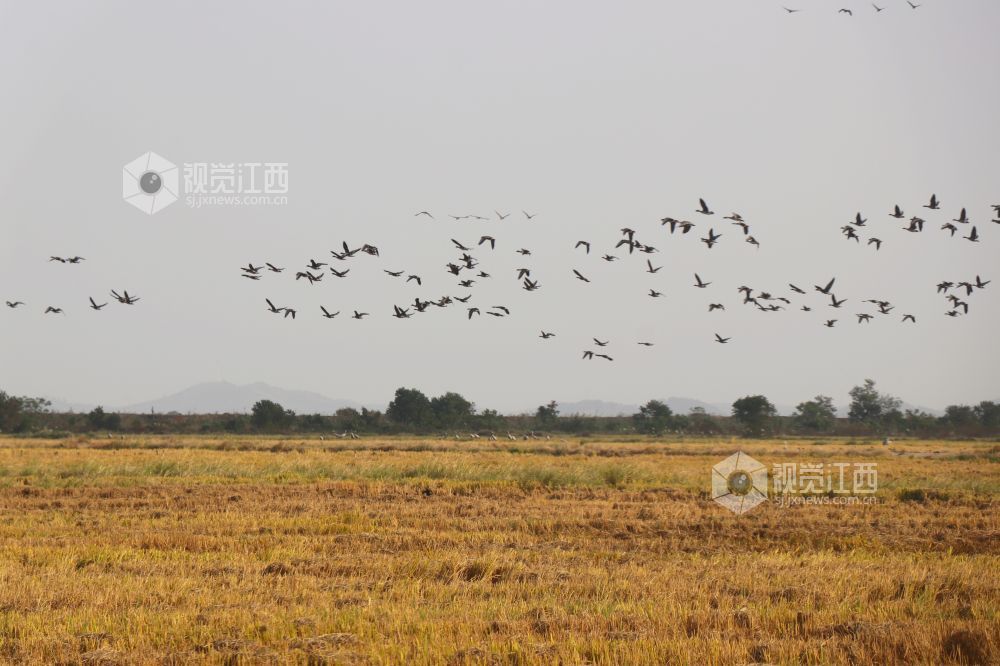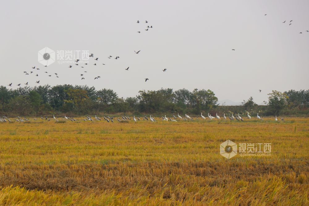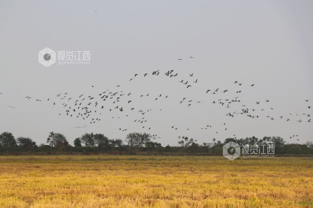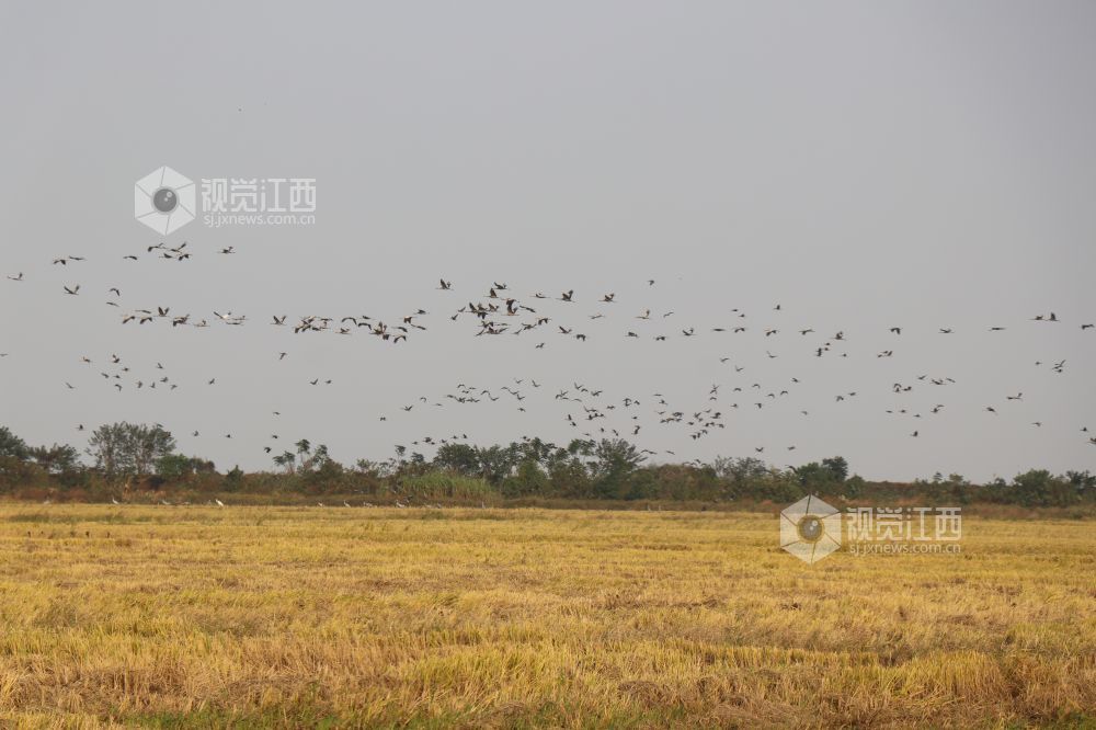 2023年11月16日,江西省余干县康山垦殖场插旗洲分场候鸟?;で?,成群的越冬候鸟在田园鹤谷栖息觅食、嬉戏飞舞,蔚为壮观。