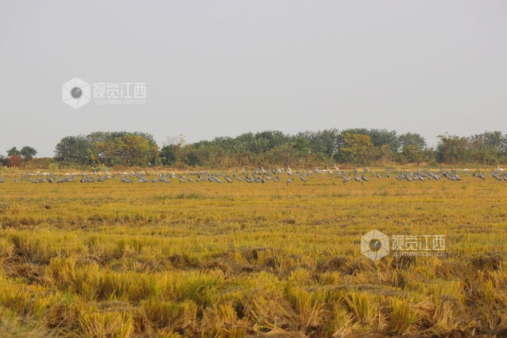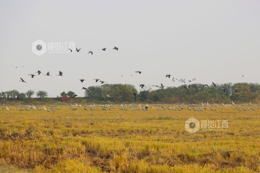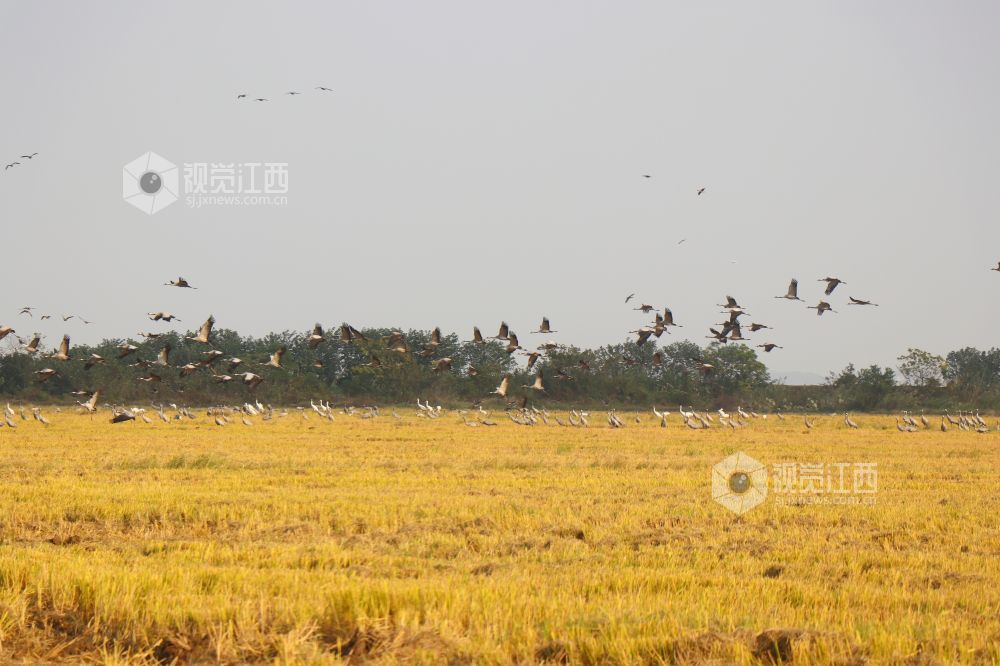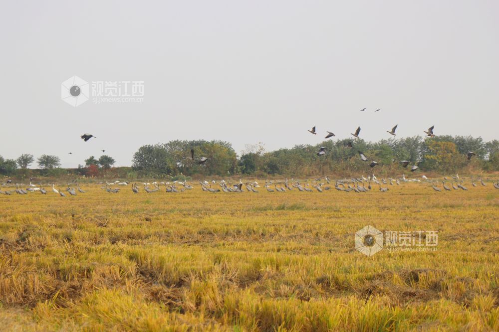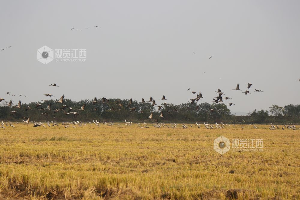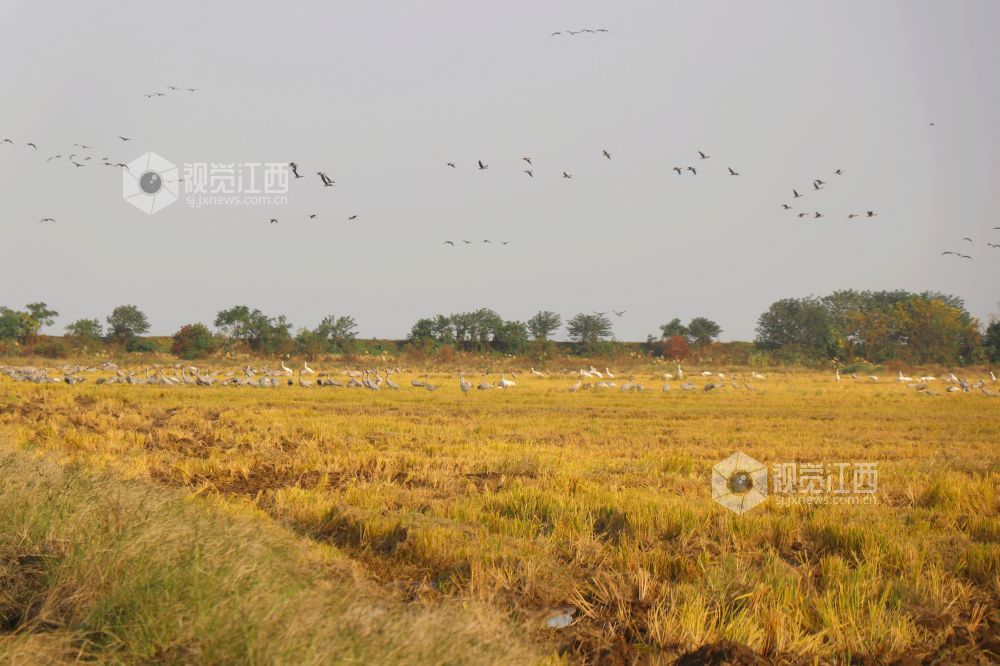 2023年11月16日,江西省余干县康山垦殖场插旗洲分场候鸟?;で?,成群的越冬候鸟在田园鹤谷栖息觅食、嬉戏飞舞,蔚为壮观。