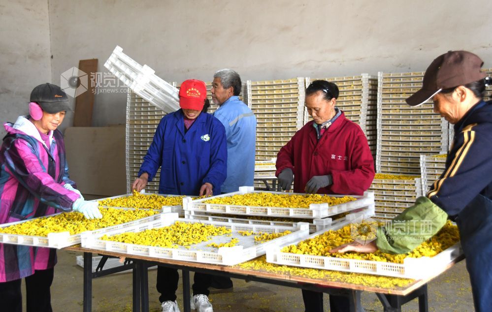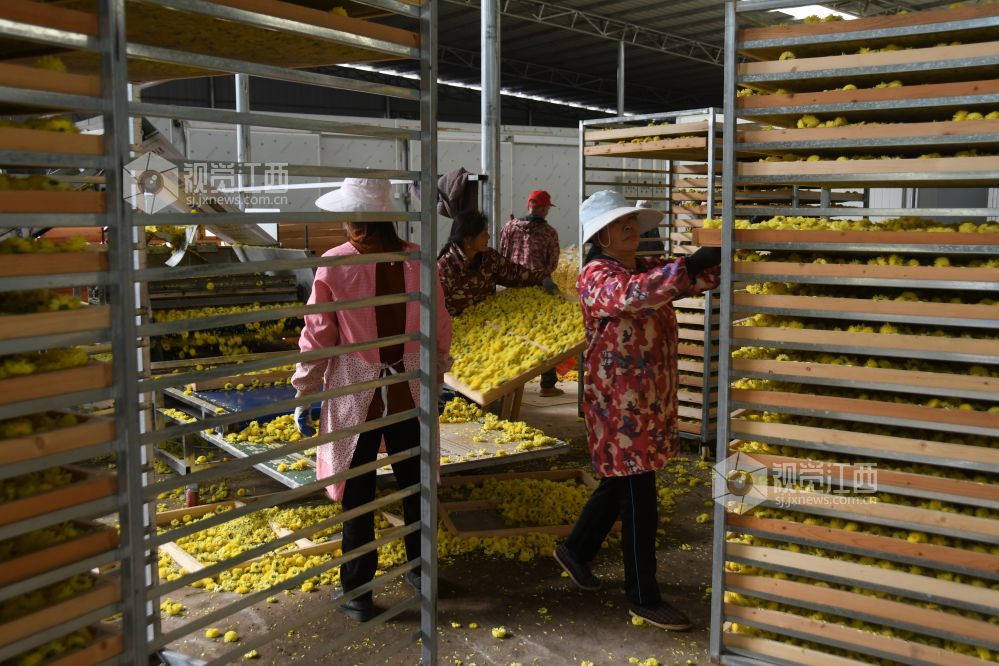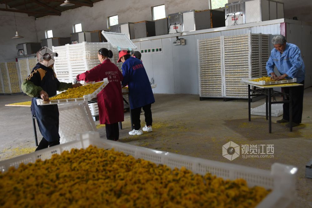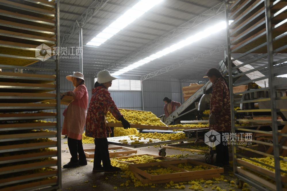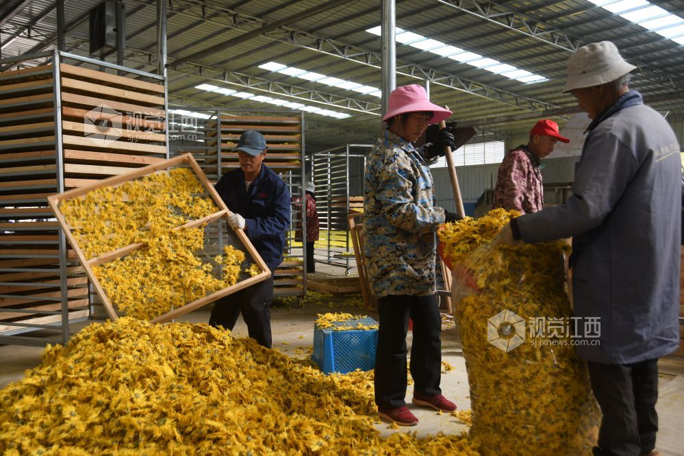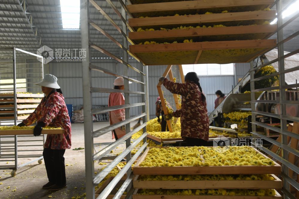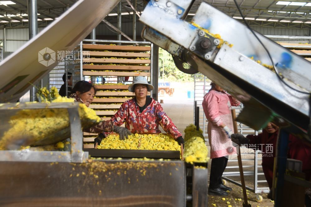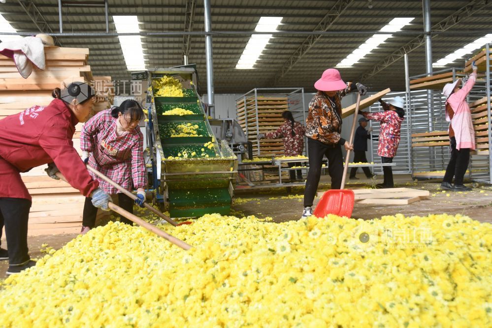 2023年11月17日,坐落于江西省鄱阳县谢家滩镇元宝山乡村振兴中药材种植基地千余亩各种菊花丰产丰收,基地加工生产车间正加班加点对现釆摘的菊花进行烘干加工,制成各种饮品,药材,生产车间ー片繁忙。据悉,每天加工烘干菊花万余斤,销往各地。