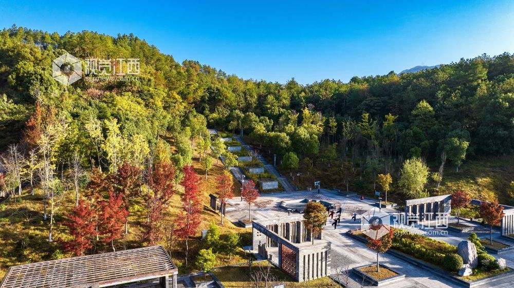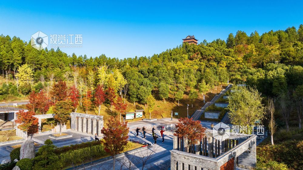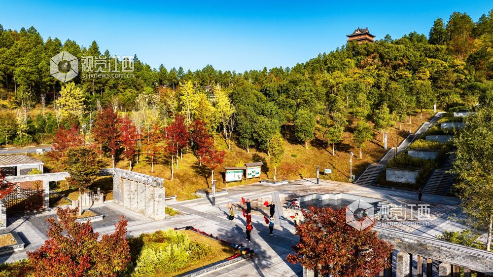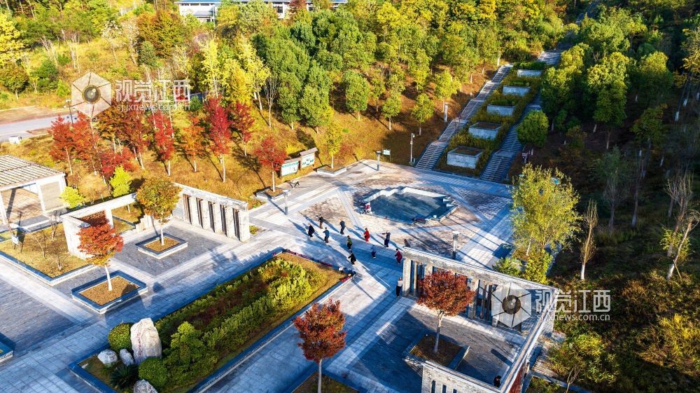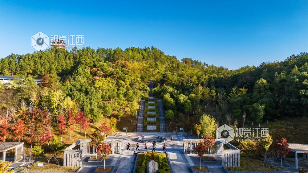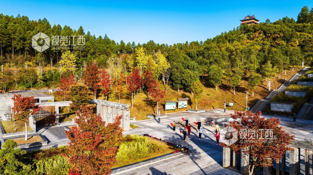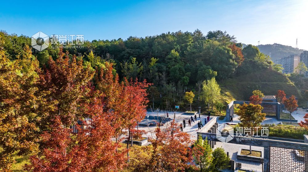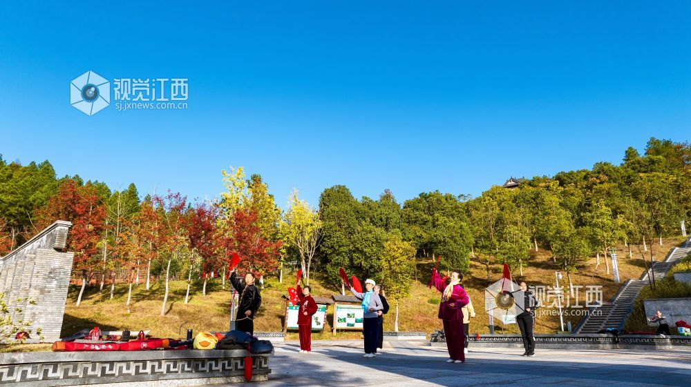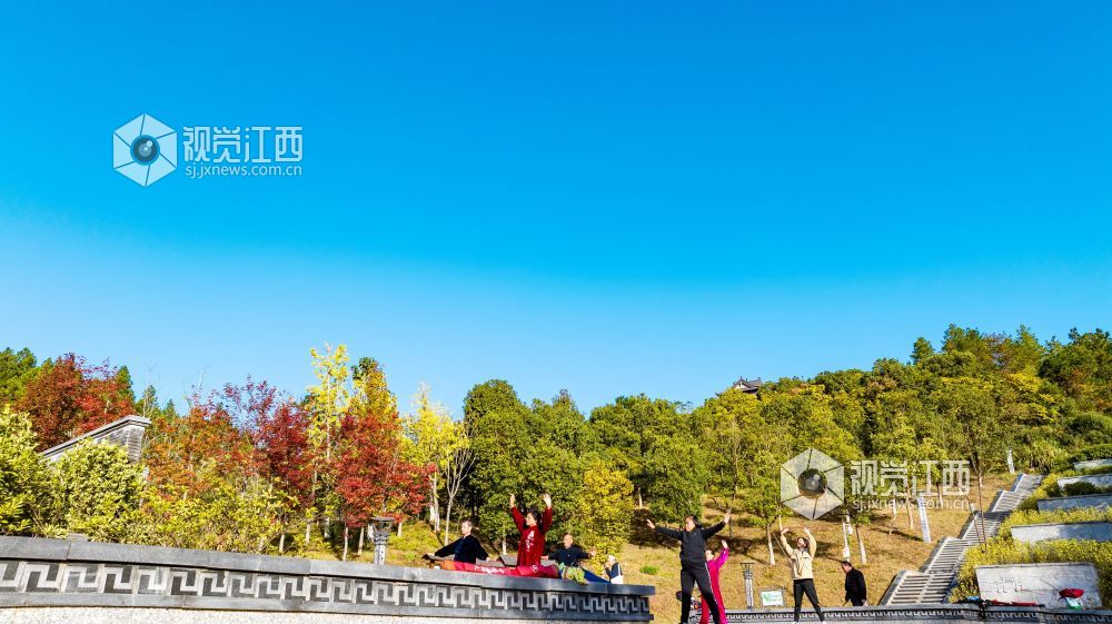 2023年11月18日,江西省吉安市吉水县杨万里公园枫红杏黄,层林尽染,市民正在晨练,构成一幅和谐秀美的江南初冬画卷。