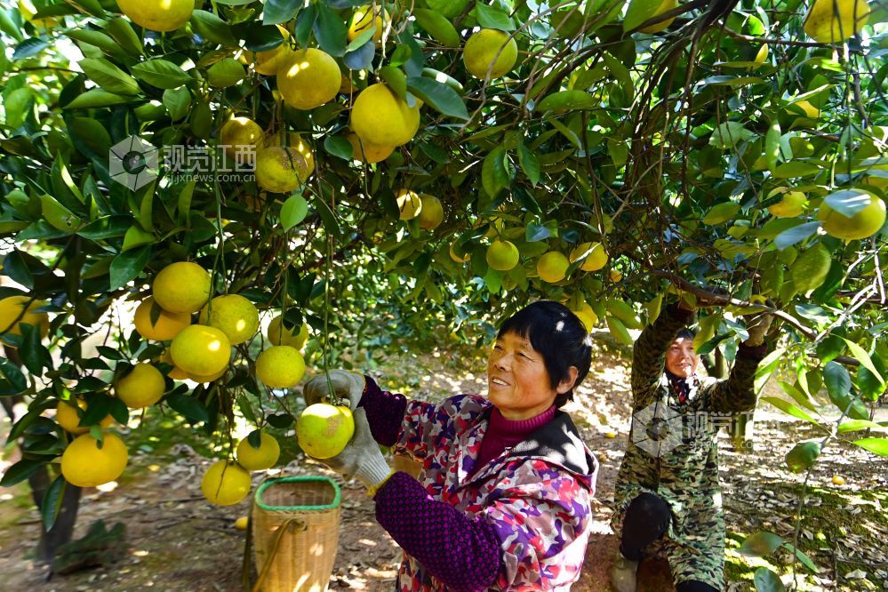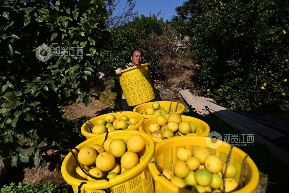 2023年11月20日,江西省宜春市万载县白良镇红壤开发办果园场胡柚种植基地的胡柚进入集中采摘期,当地果农抢抓晴好天气,忙着采摘、挑运、包装、窖藏。