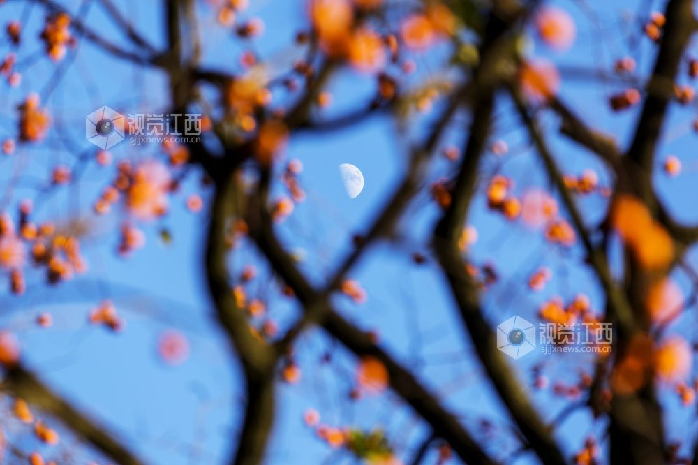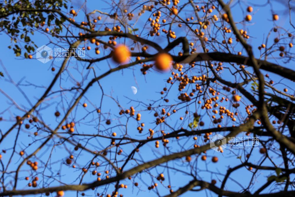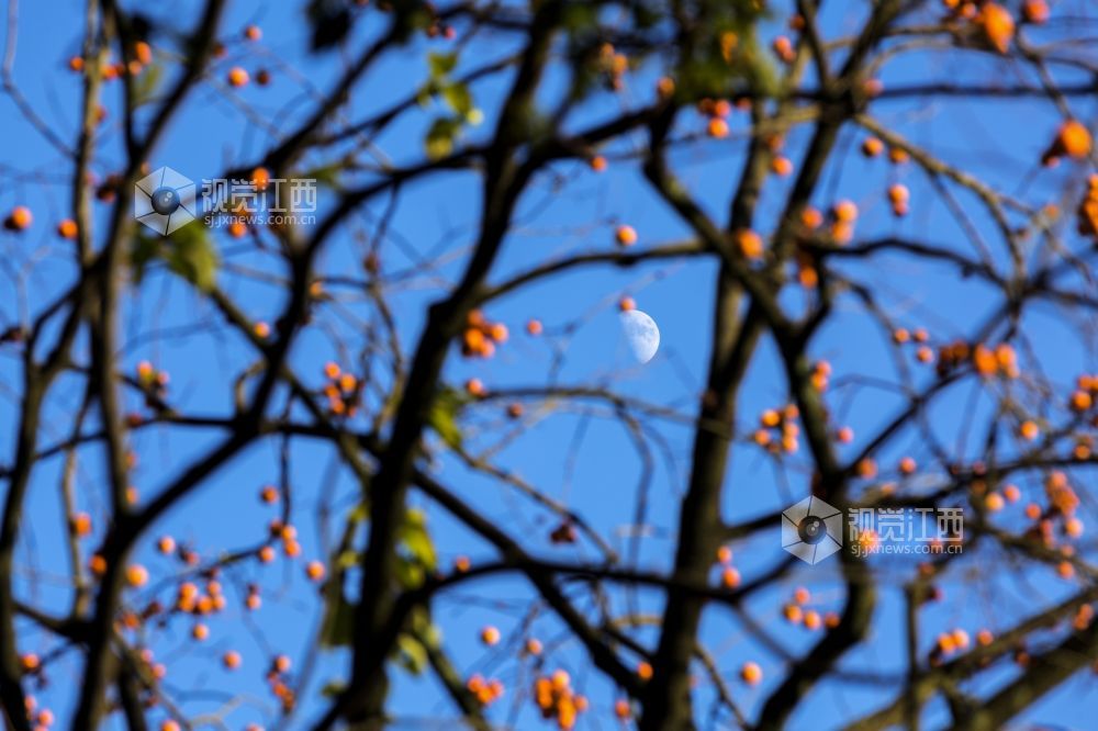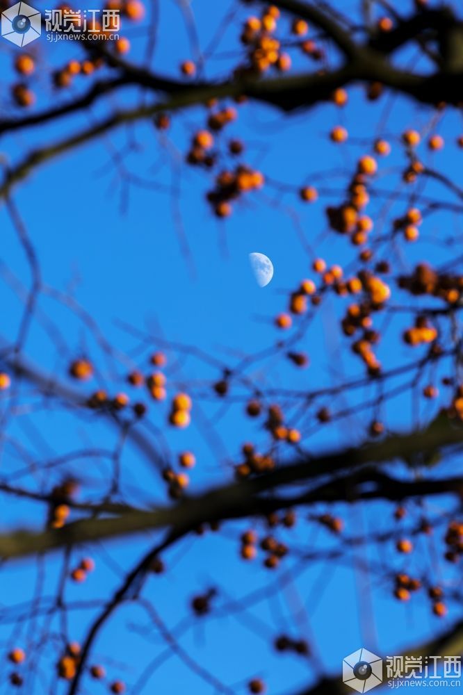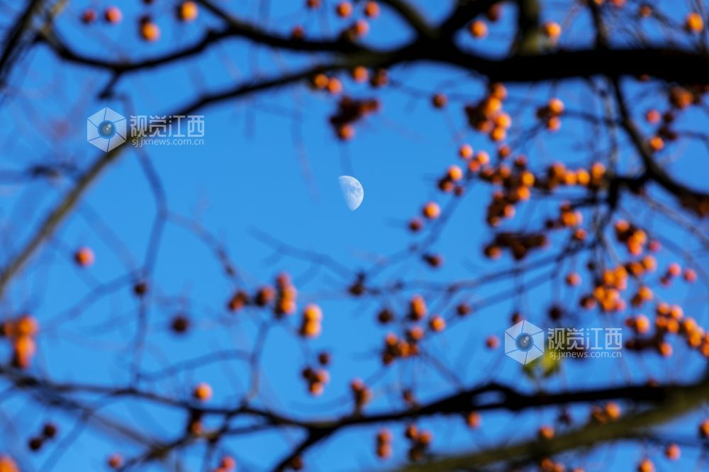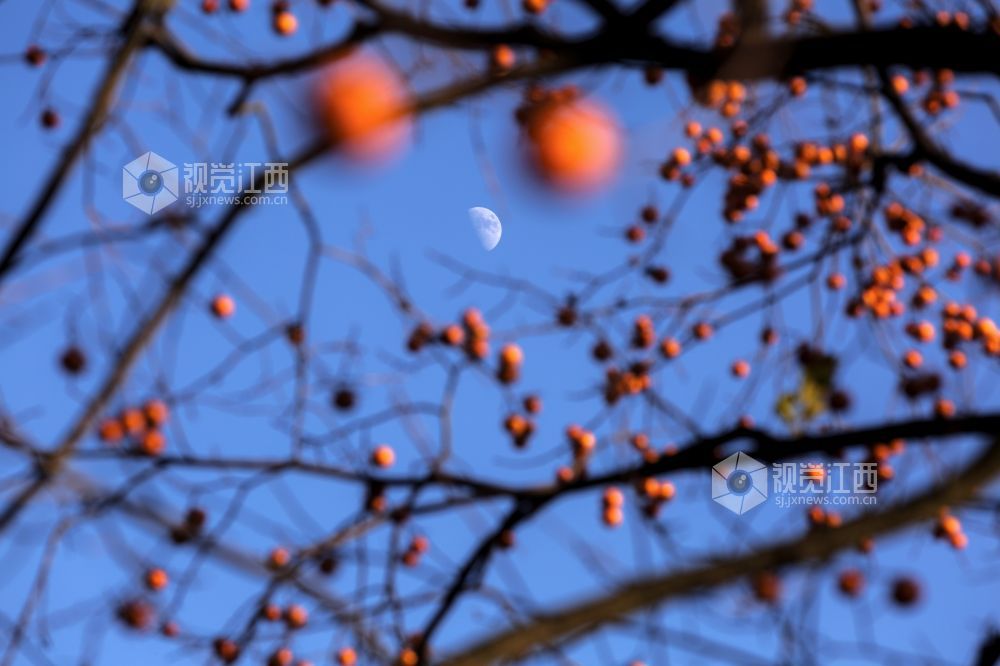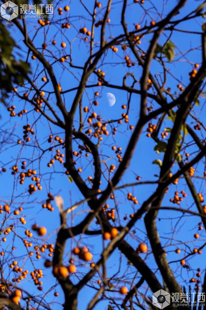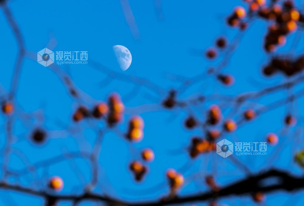 11月21日,在江西新余渝水区良山镇黄虎村,柿子树的枝头挂满了红橙橙的柿子,像一颗颗大眼睛,红彤彤的大眼睛,在欣赏着一弯明月,犹如一幅迷人的图画,令人如醉如梦,留连忘返。