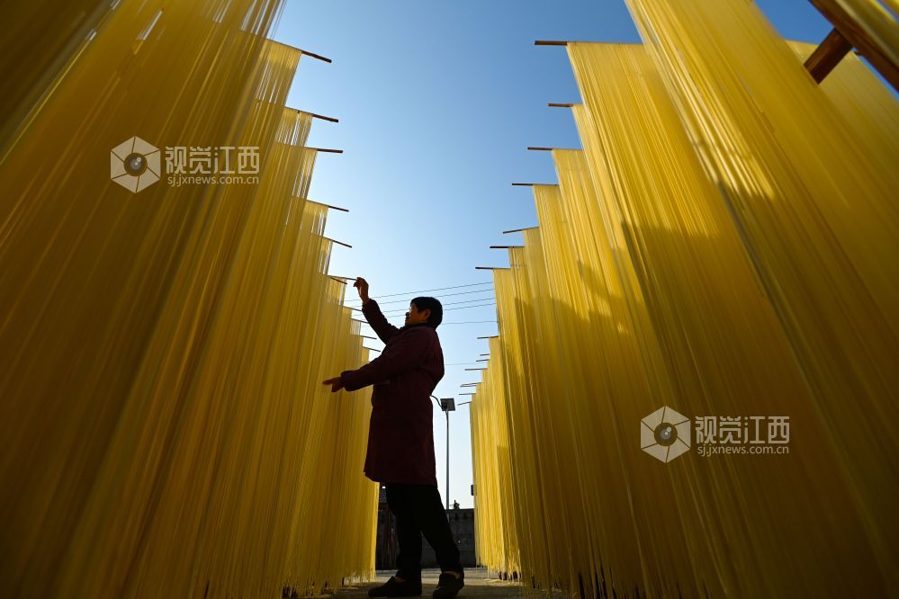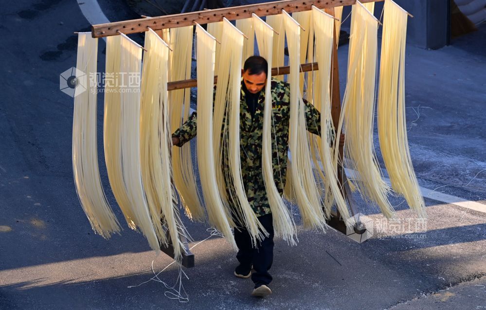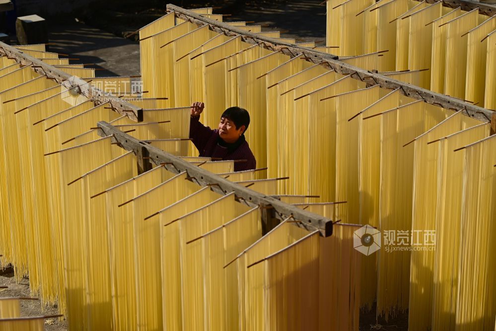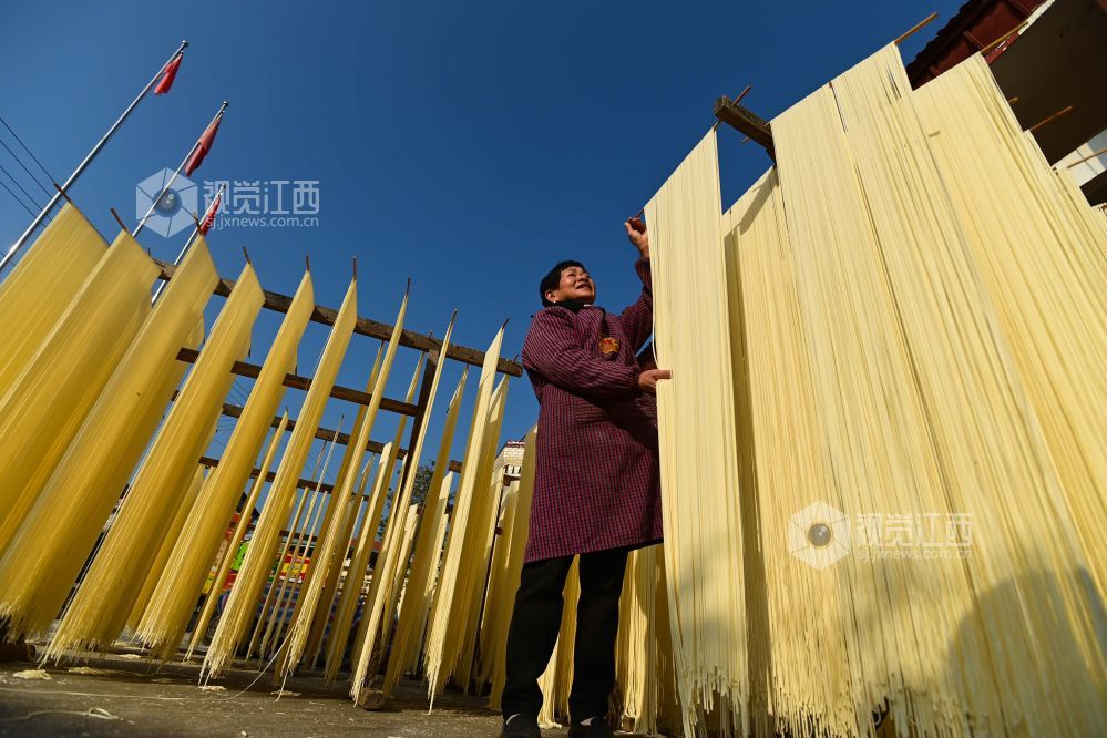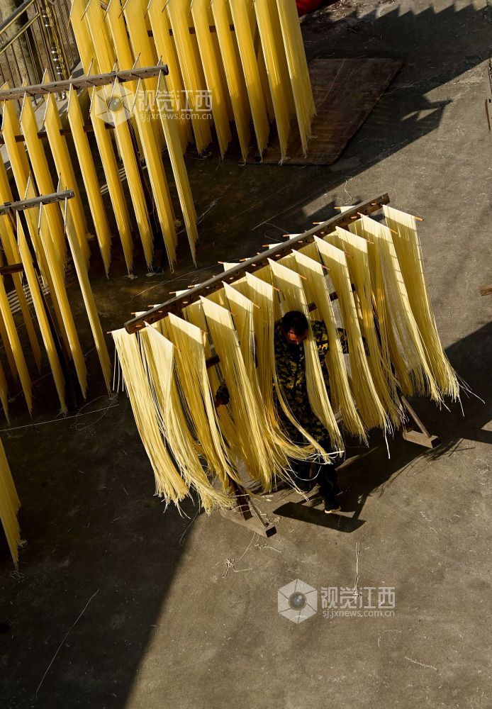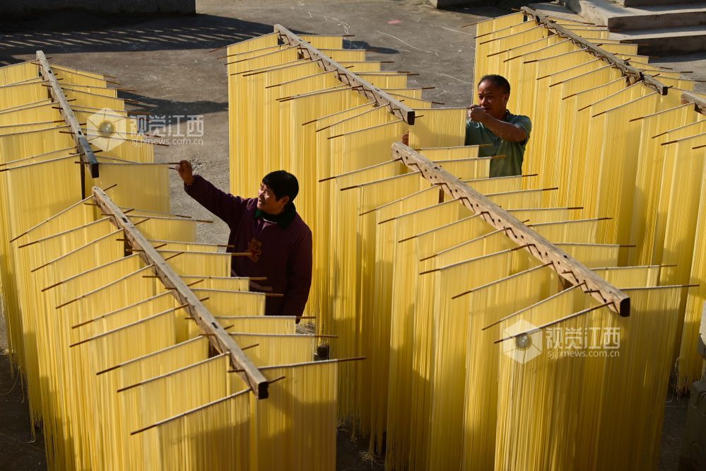 进入初冬时节,江西省宜春市万载县黄茅镇永安村传统手工面制作进入繁忙时节,当地村民趁着天气晴好,忙着制面、晾晒,保障市场需求。