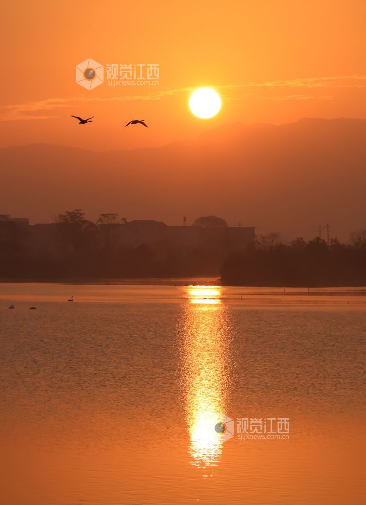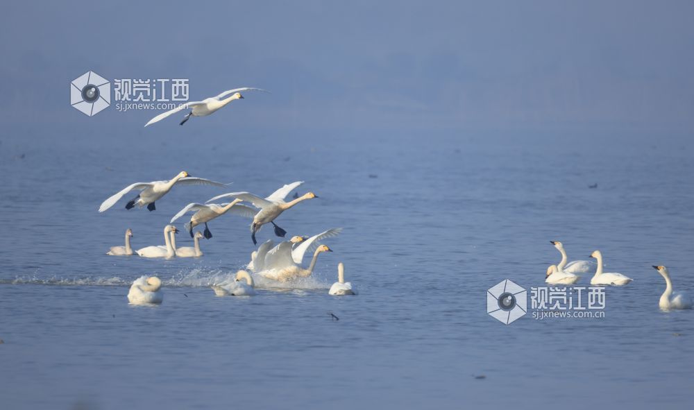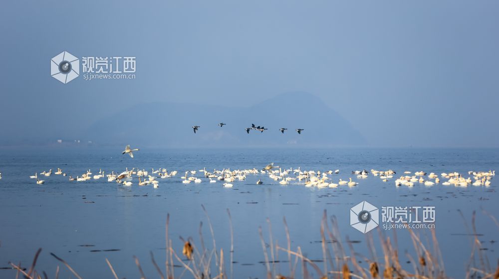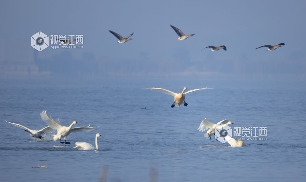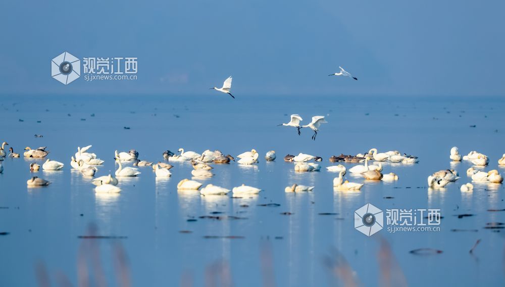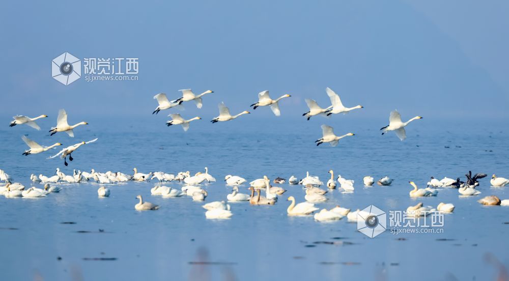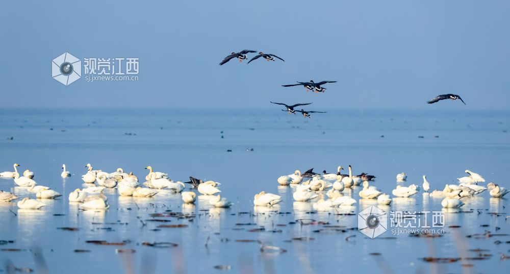 2023年11月29日,江西省九江市柴桑区,成群越冬候鸟在东湖和赤湖湿地飞翔、觅食。