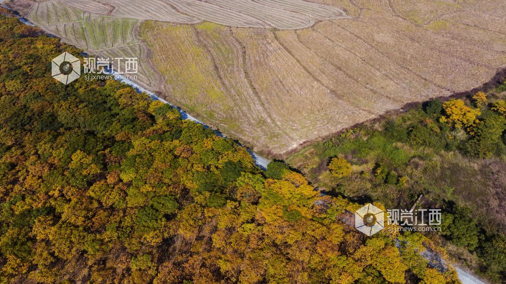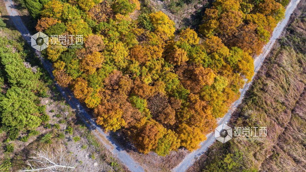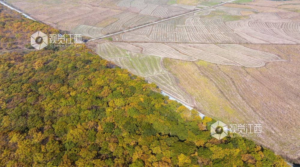 11月29日,航拍江西新余仙女湖区观巢镇京桥村附近的树木层林尽染、色彩斑澜,与房屋、田园、道路、远山相映成趣,组成了初冬一幅乡村美图。