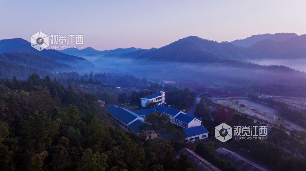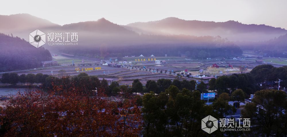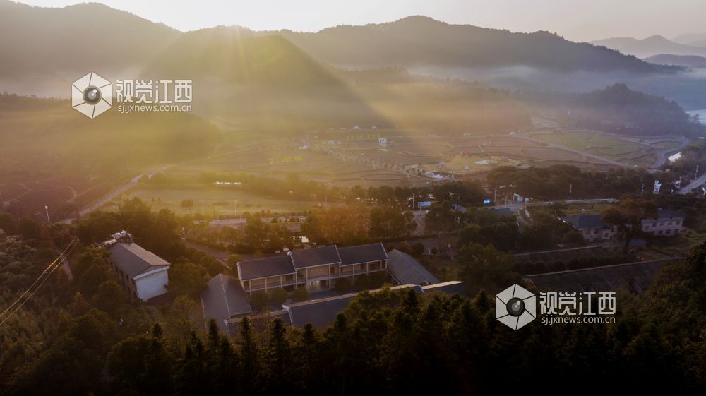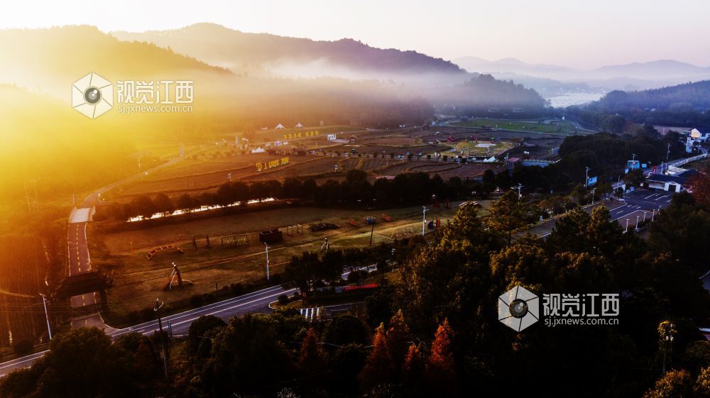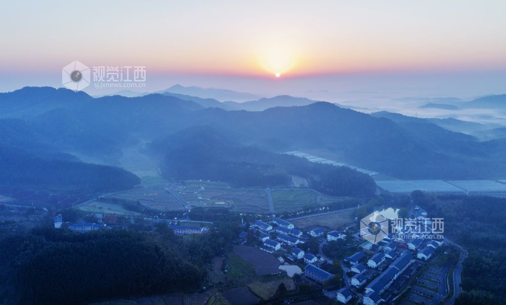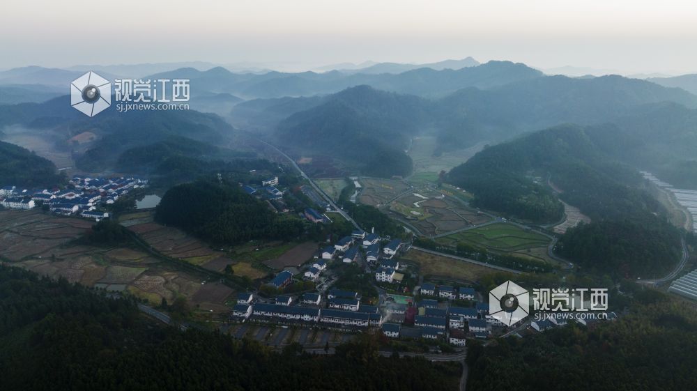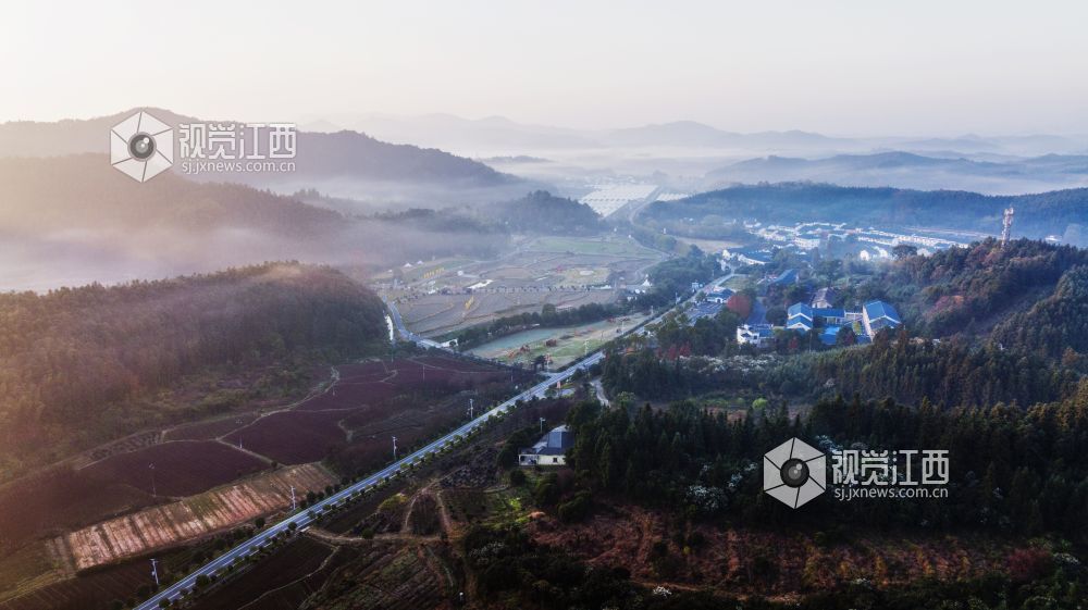 12月7日,航拍江西新余渝水区良山镇下保村,青山环绕、村庄靓丽、道路宽畅、田园整齐、云雾缭绕,青山、道路、田园在云雾下若隐若现,在晨光的照射下美如仙境。