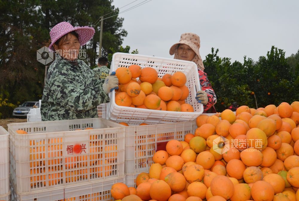 12月11日,在江西省永新县石桥镇炎春农场脐橙种植基地,村民忙着采收、分拣、搬运脐橙,供应市场。