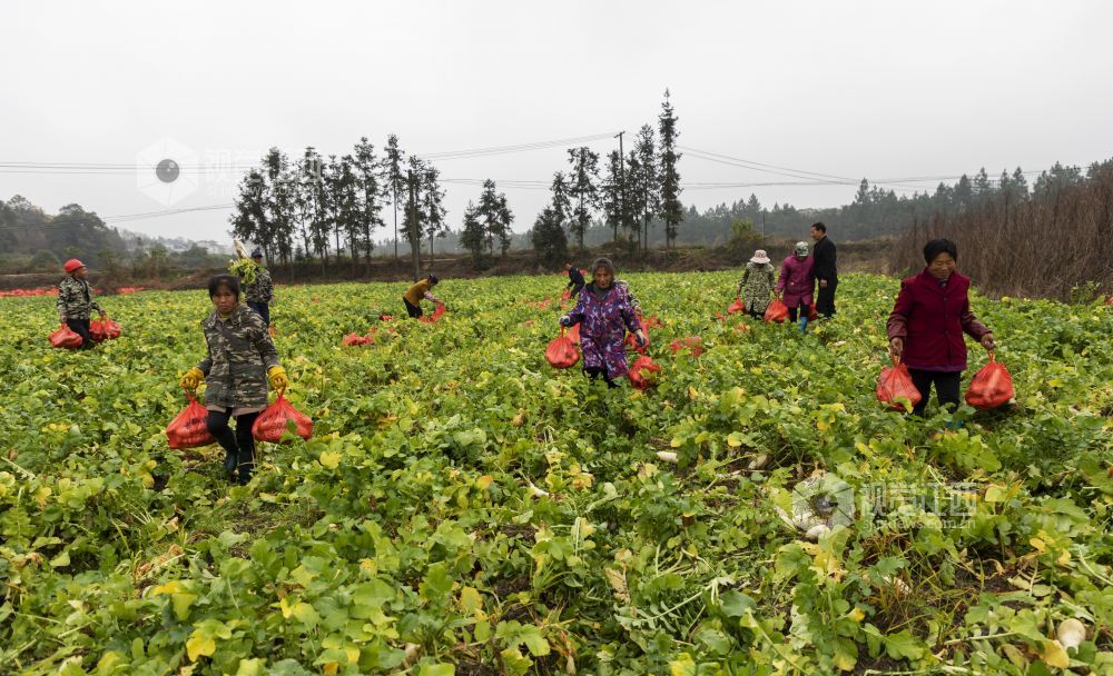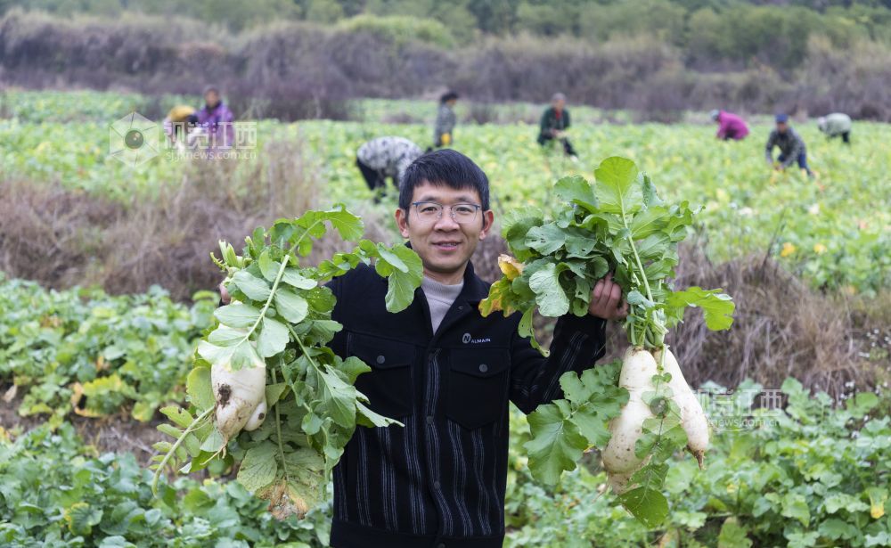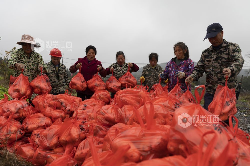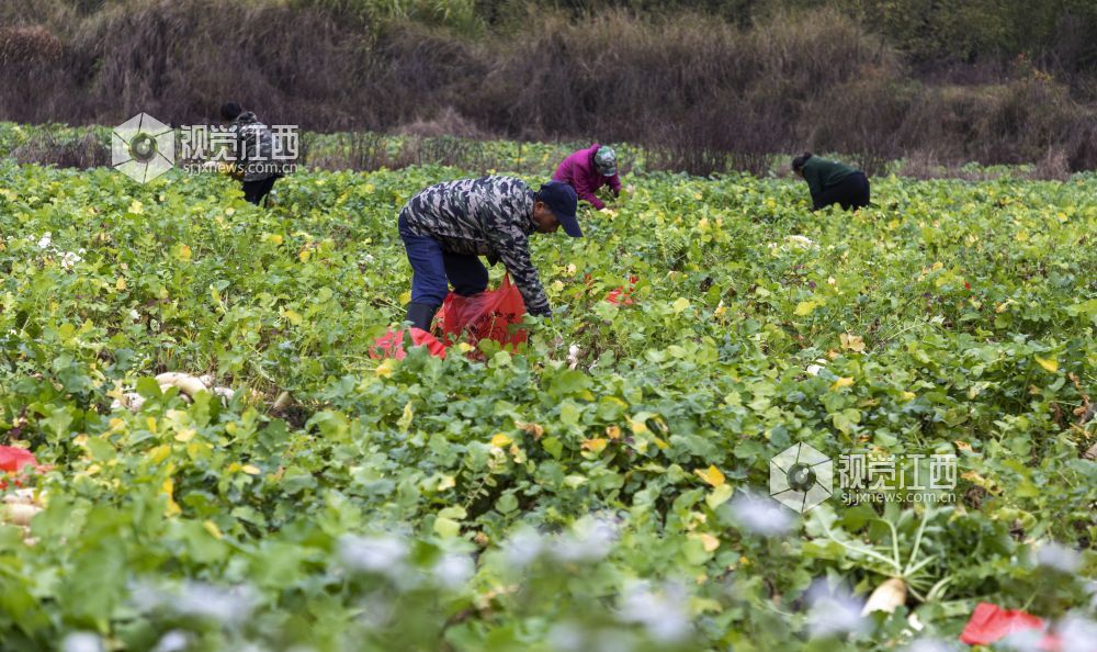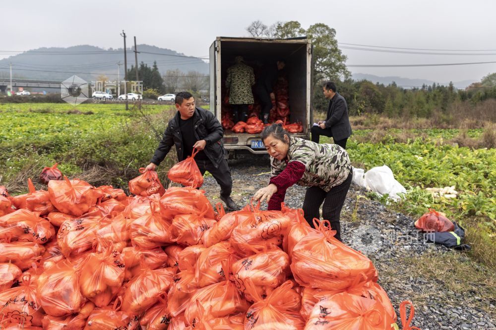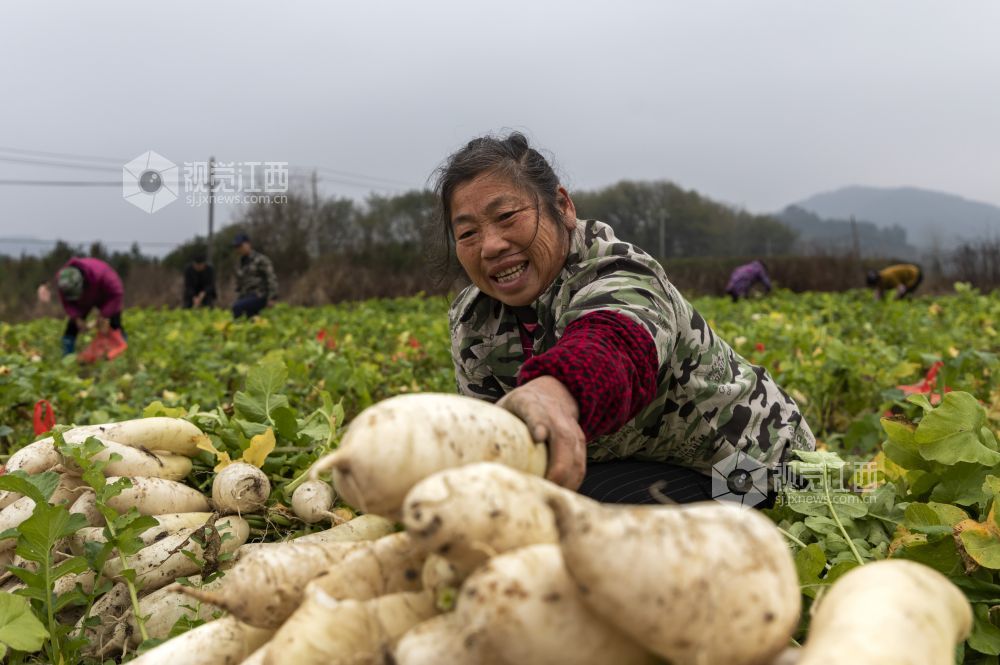 2023年12月13日,江西省新余市分宜县洋江镇辑睦桥村萝卜种植基地的400余亩萝卜陆续成熟上市,村民正在田间拔萝卜,有的分拣,有的装袋、有的搬运,有的装车,呈现一片火热的劳动场景。