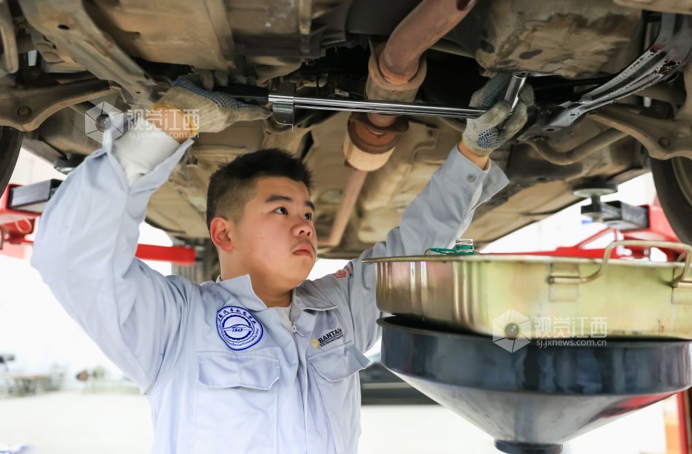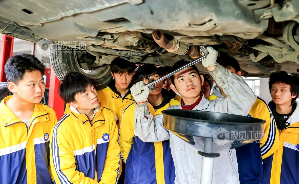 2023年12月14日,江西省瑞昌中等专业学校,学生在汽车应用与维修实训室实操。