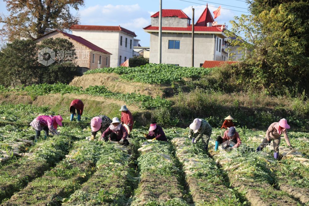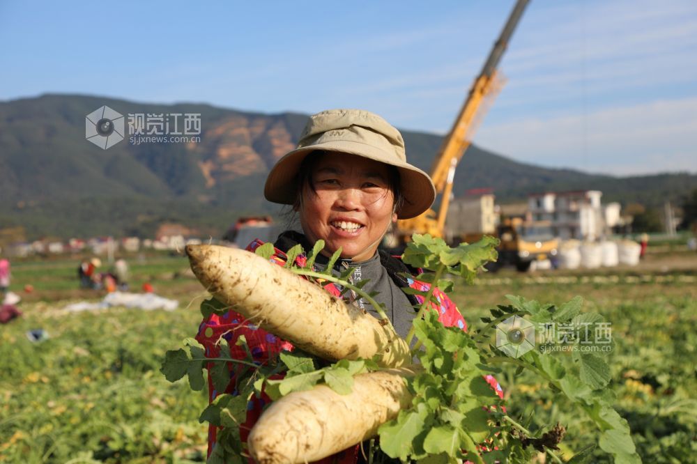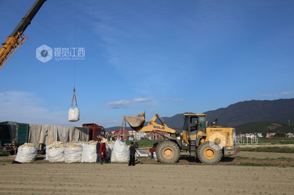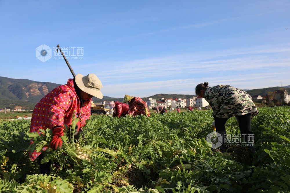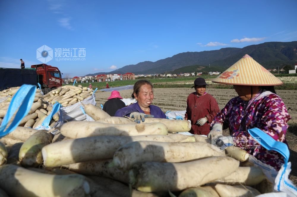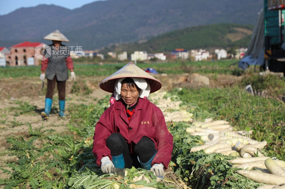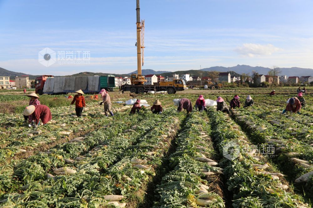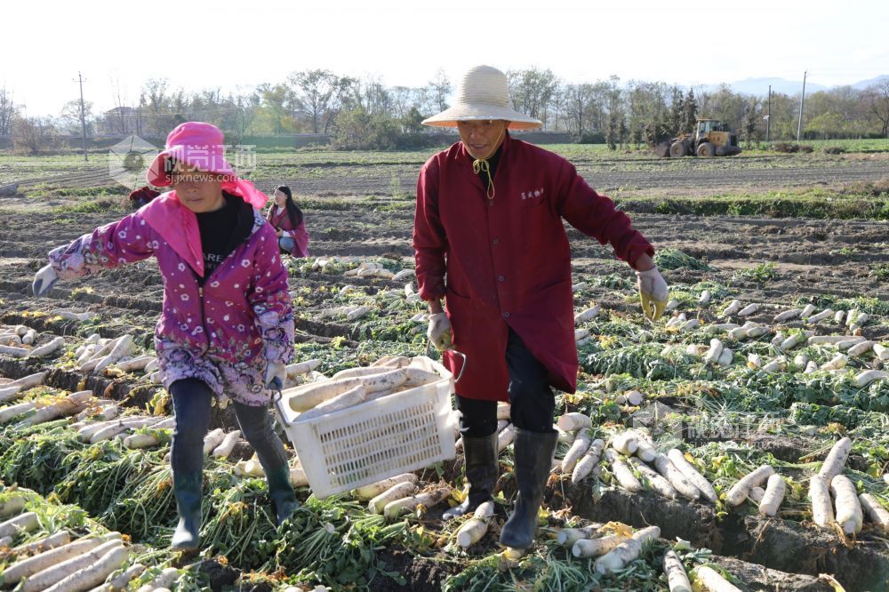 12月14日,在江西省萍乡市莲花县升坊镇石江村500亩萝卜种植基地,几十个村民正在地里拔萝卜,给新出土的萝卜去泥;铲车忙着转运萝卜;吊车将萝卜吊装到大货车里,准备运往山东;整个基地一派繁忙景象。该基地利用当地沙质土壤优势,引进优良萝卜品种,采用集约化生产经营和订单种植模式,实现从生产、加工、销售全产业链发展。