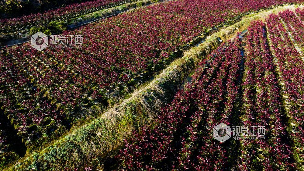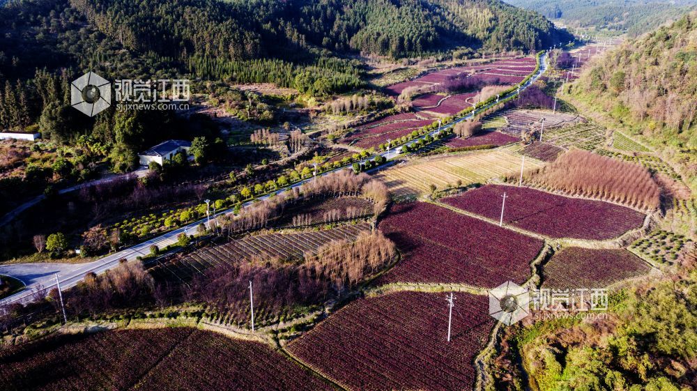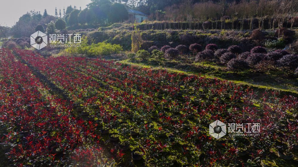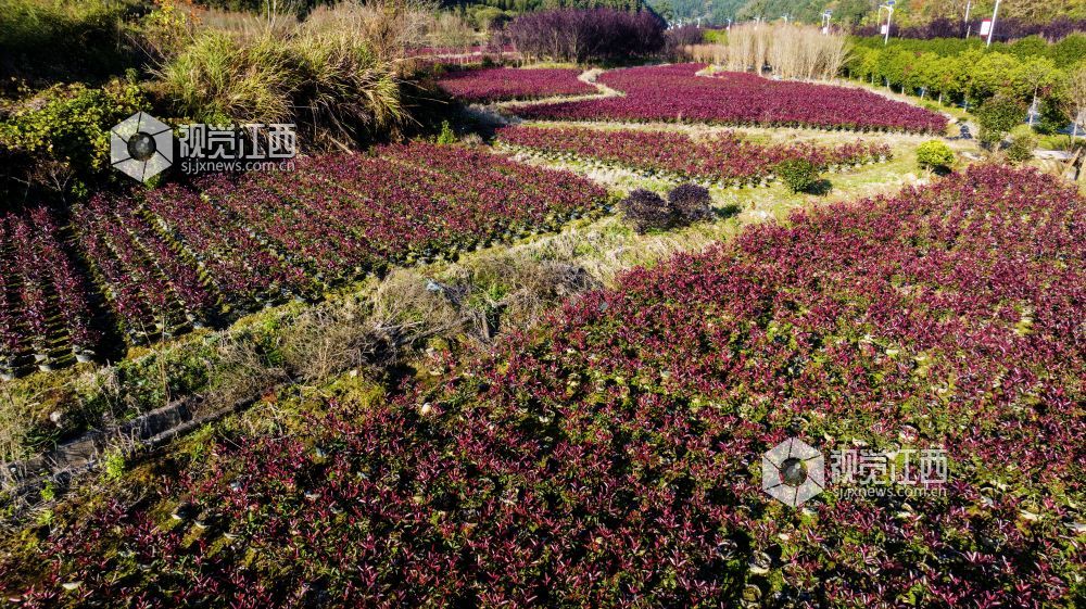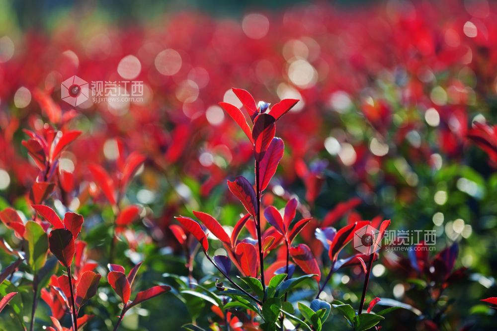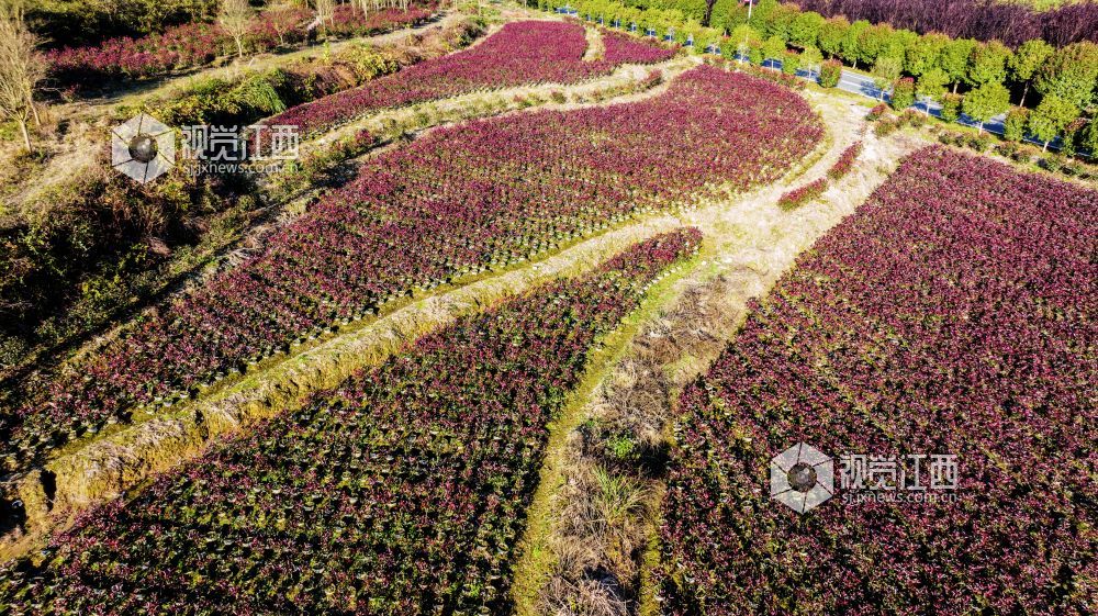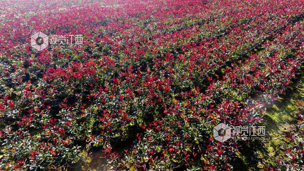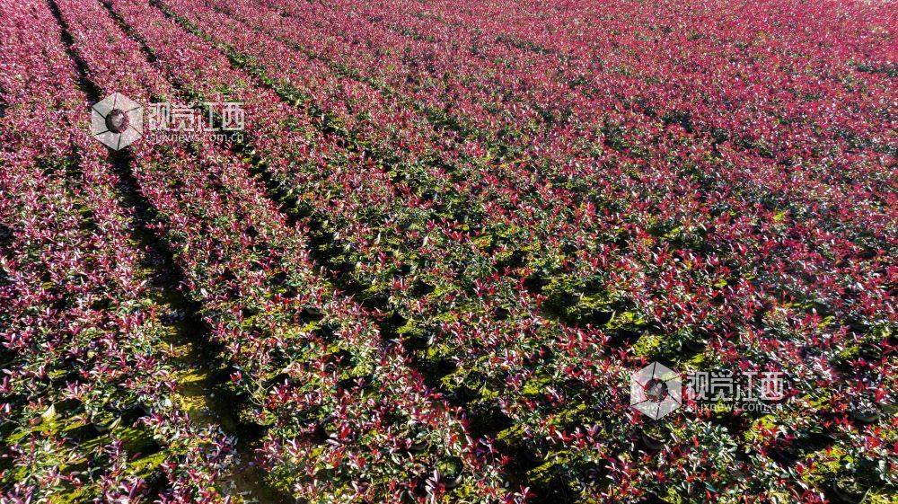 12月14日,在江西新余渝水区良山镇下保村苗木产业基地,200多亩红叶石楠火红盛放,宛如大自然打翻了调色板,令人沉醉。