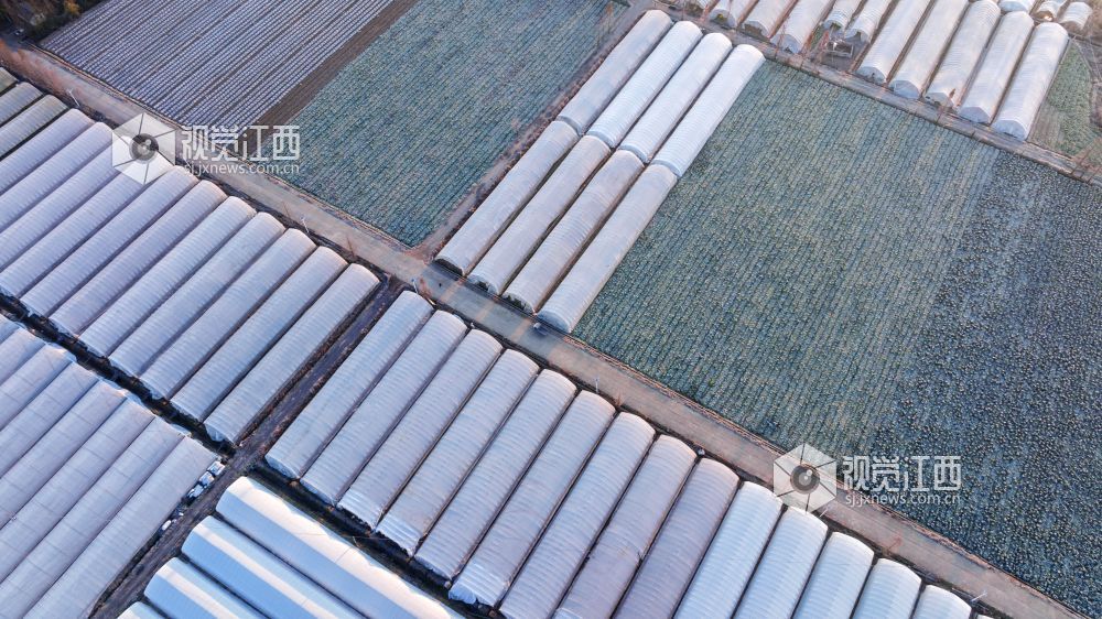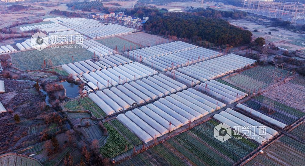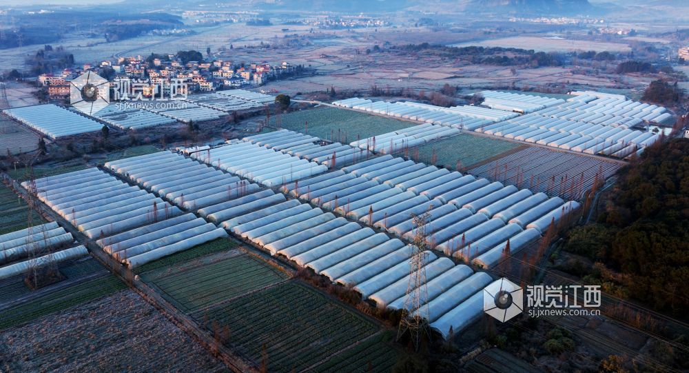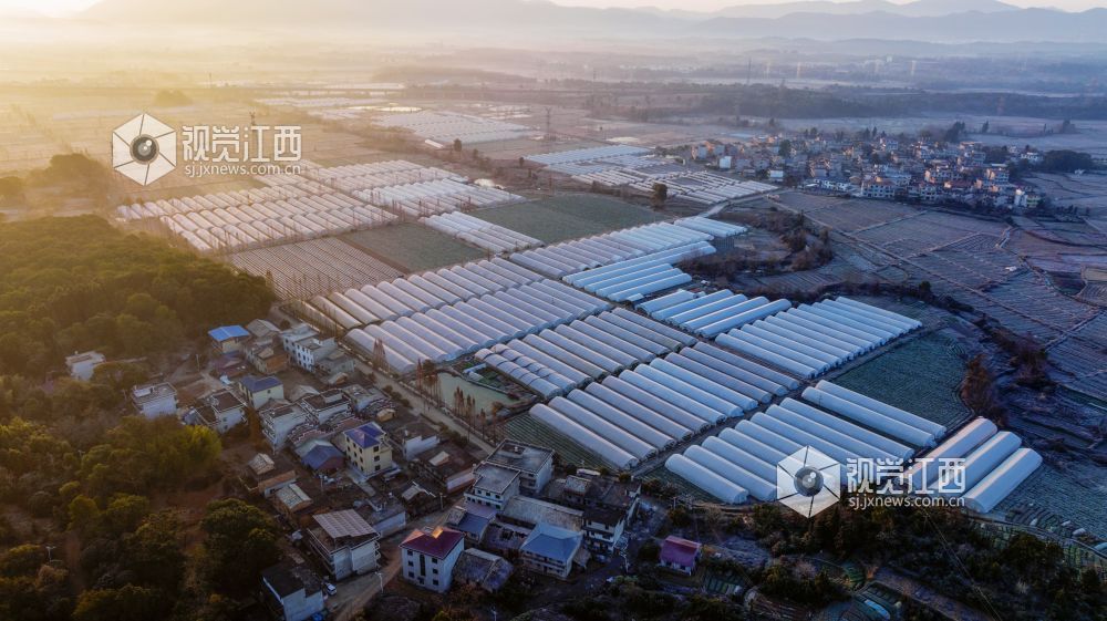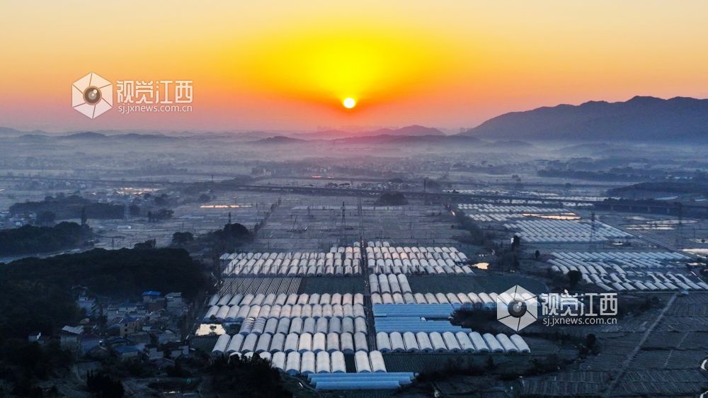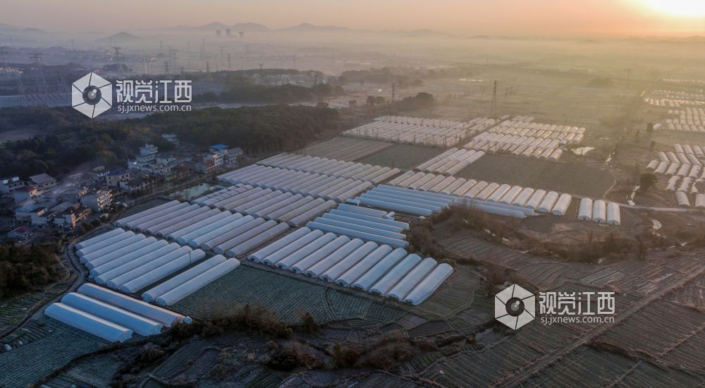 12月23日,晨拍日出中的江西新余仙女湖观巢镇京桥村大棚蔬菜基地,尽管近期出现了近年来少有的低温冰冻天气,但由于有了大棚设施,大棚内的有机蔬菜安然无恙,大棚成为农作物度过寒潮的“保护神”。