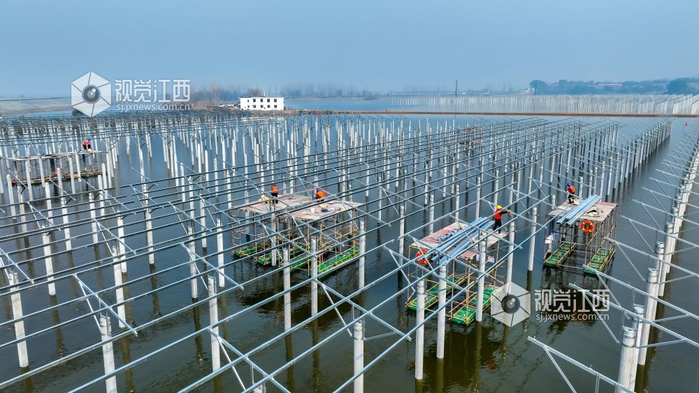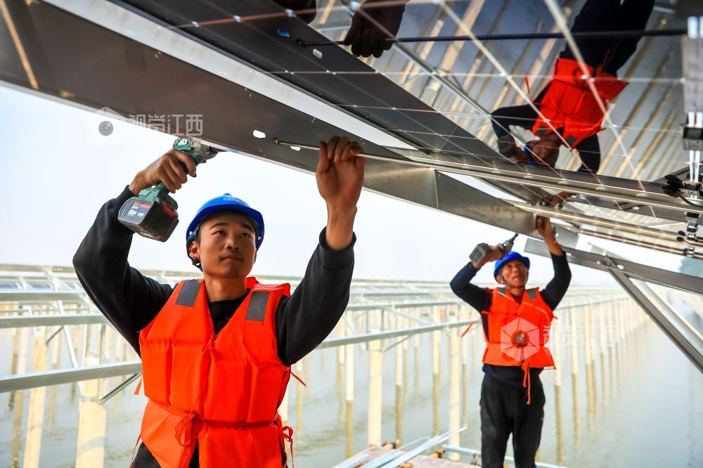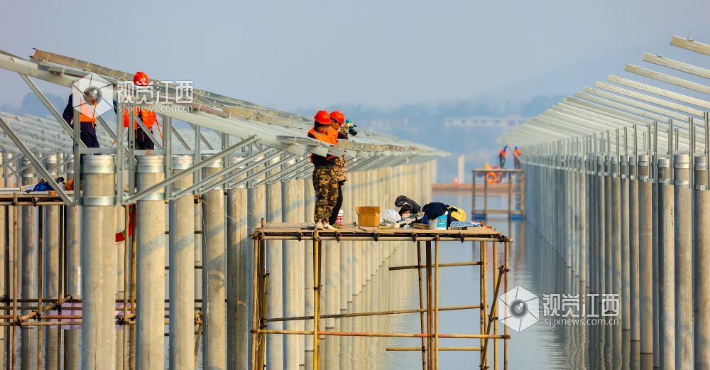 2023年12月28日,江西省九江市柴桑区新塘乡紫荆村麦西湖102兆瓦渔光互补光伏发电项目工地上,工人正在加快项目建设,现场一派繁忙。