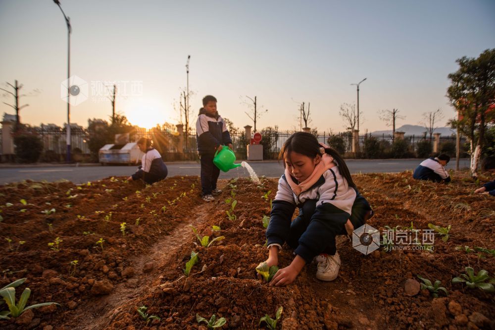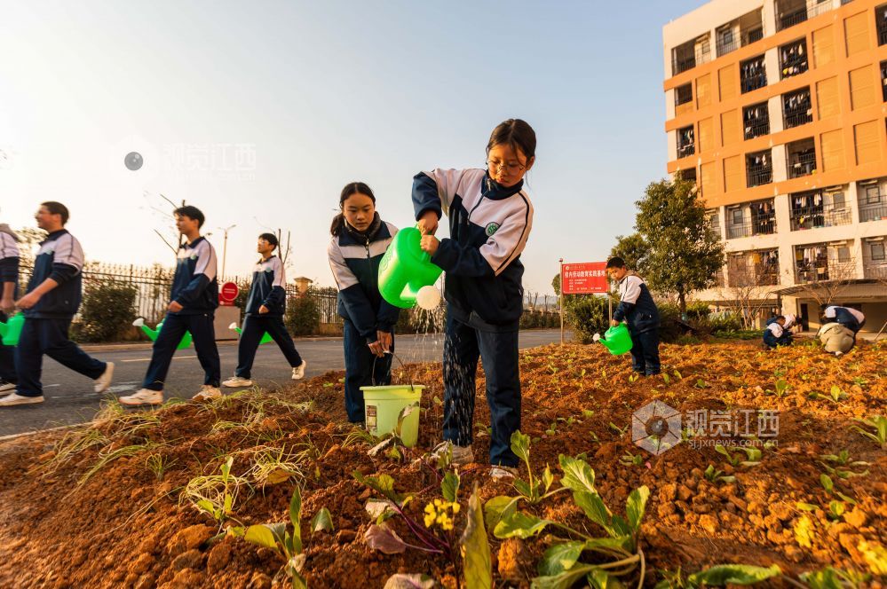 12月28日,江西省永新县永新中学七年级(5)班的学生在劳动教育基地开展“种菜浇菜”实践活动,让学生在劳动中接受锻炼、磨炼意志,体验劳动的快乐,促进学生全面发展,推动“双减”政策落地落实。