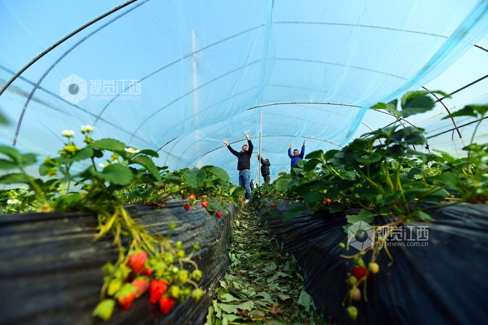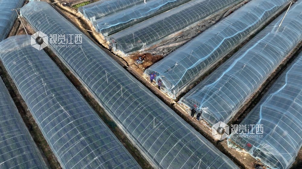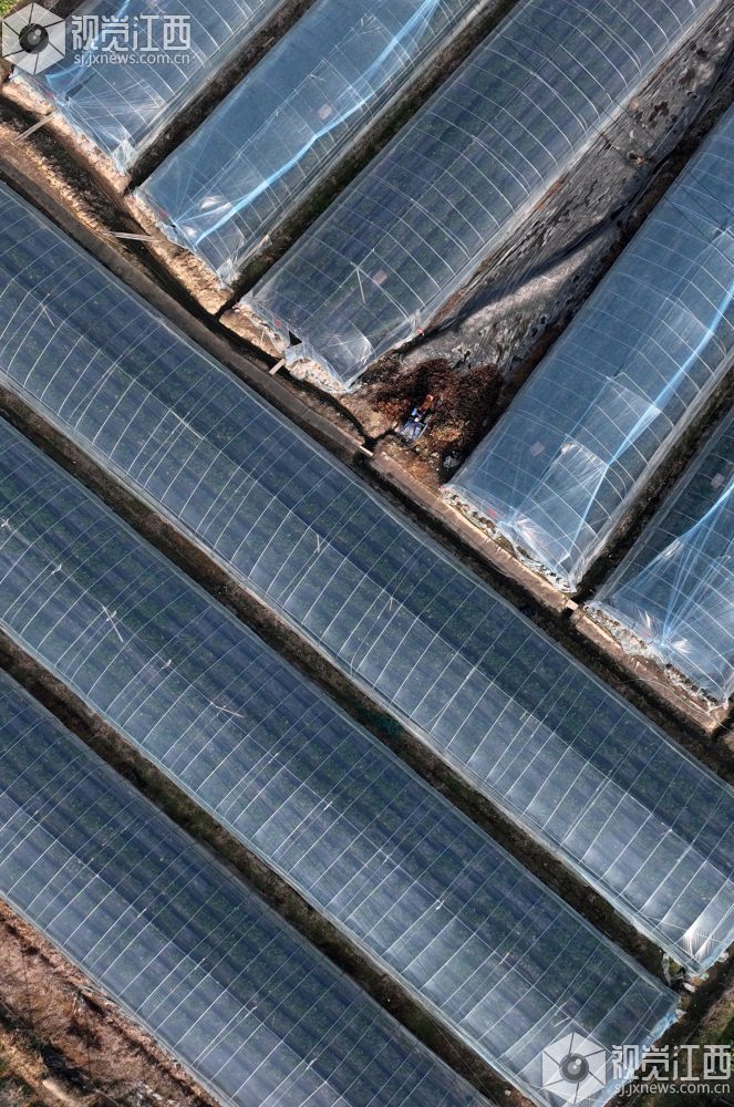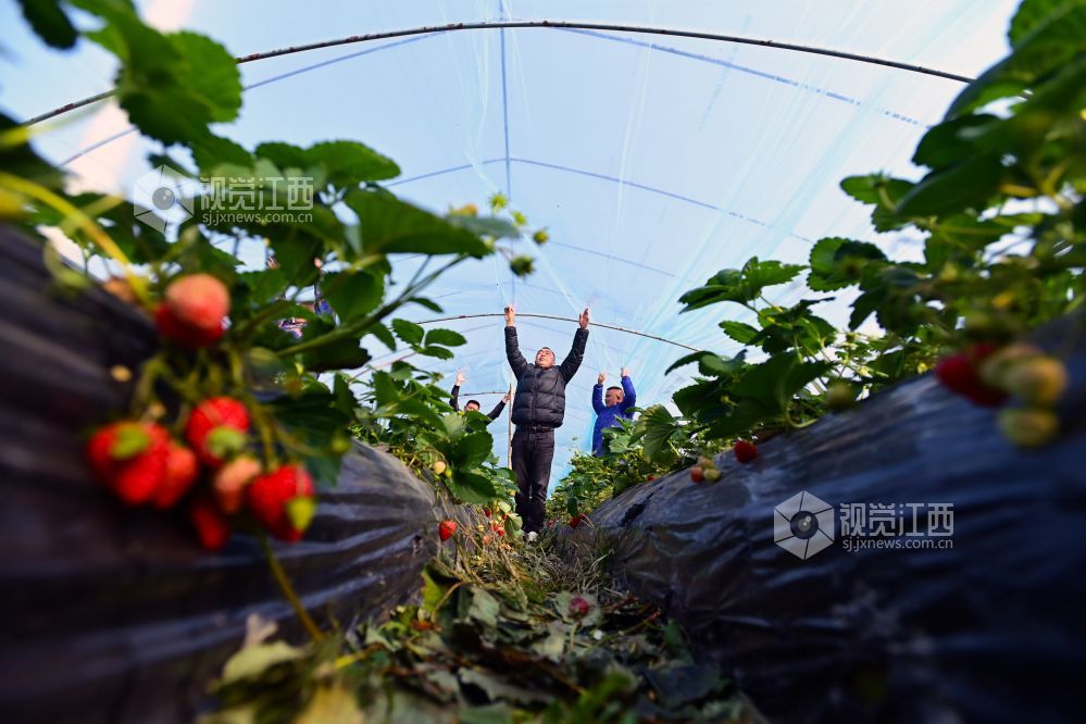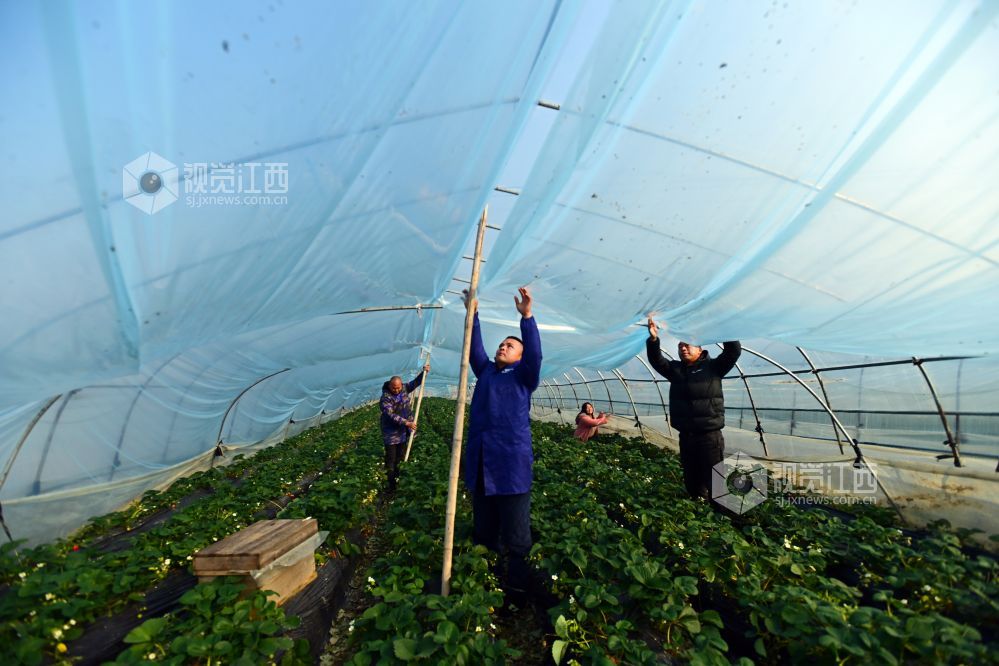 小寒将至,江西省宜春市万载县康乐街道东升村香飘飘草莓园种植户和专业覆膜人员加盖草莓大棚膜,让草莓住进“温暖之家”,免遭低温冻害。