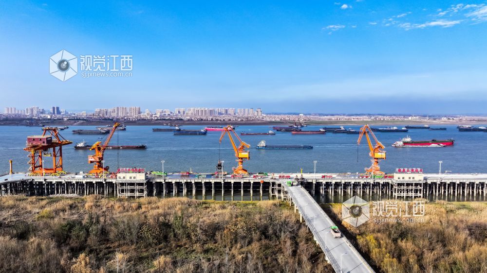 2024年1月4日,江西省九江港瑞昌港区公用码头,船舶和车辆正在进行装卸作业,现场一片繁忙。