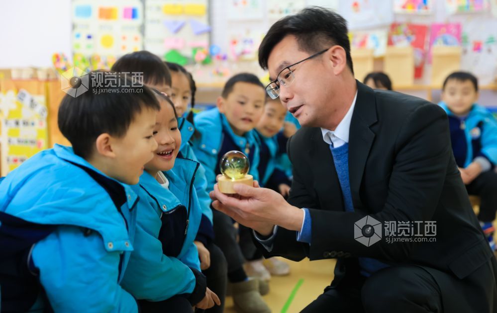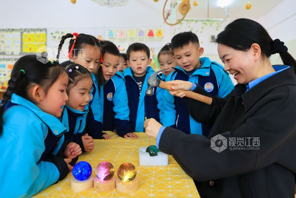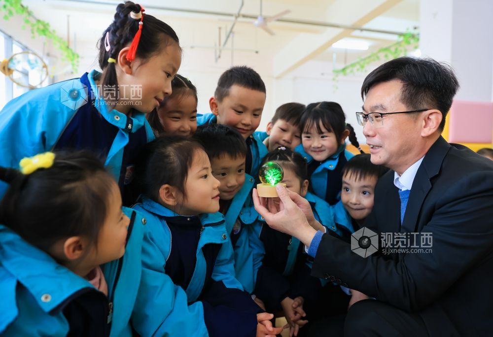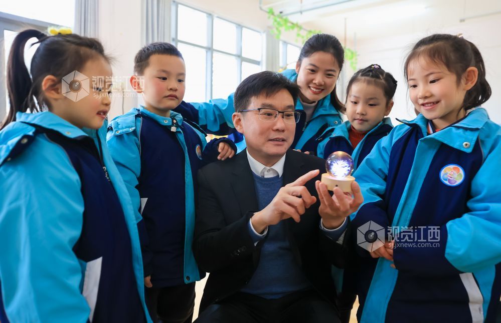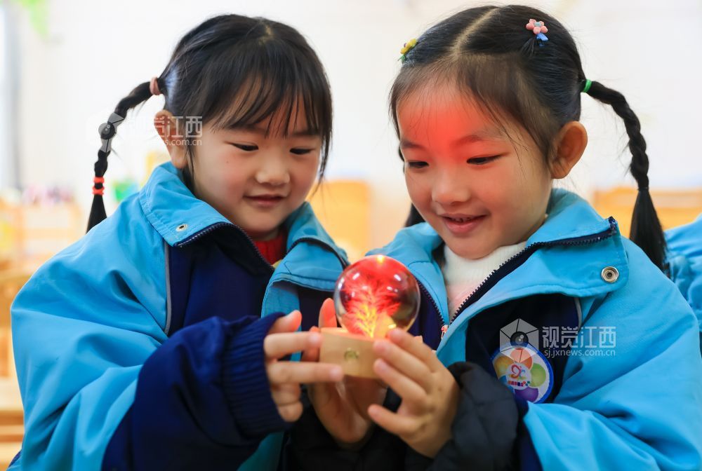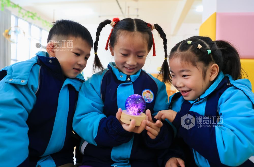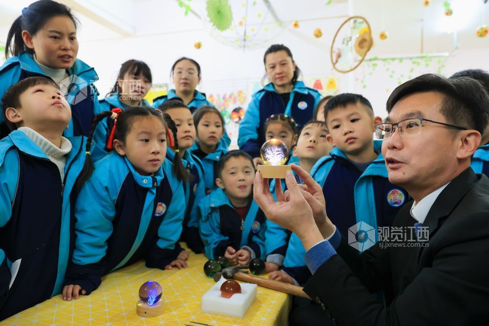 2024年1月5日,江西省瑞昌市第一幼儿园教室内,瑞昌核物理应用研究院工作人员向小朋友赠送科技玩具并演示玻璃球放电现象。