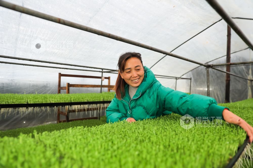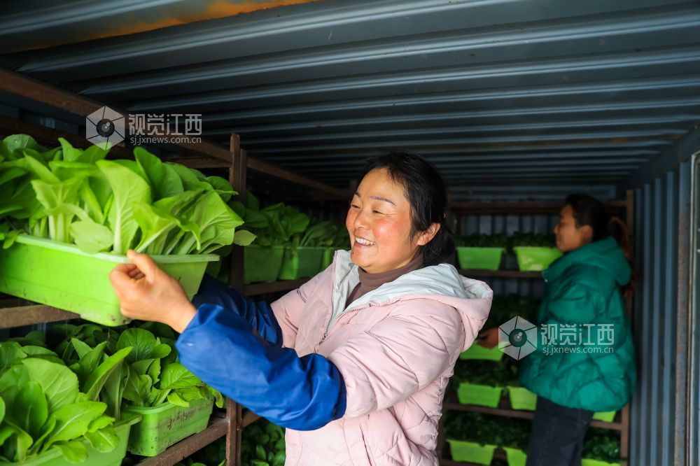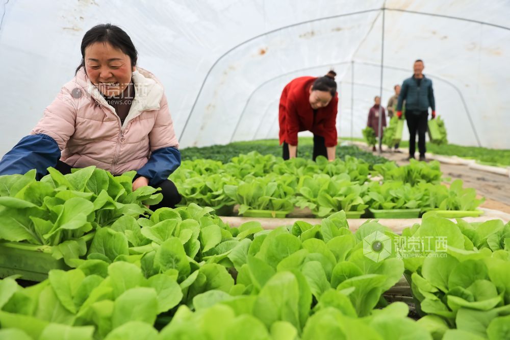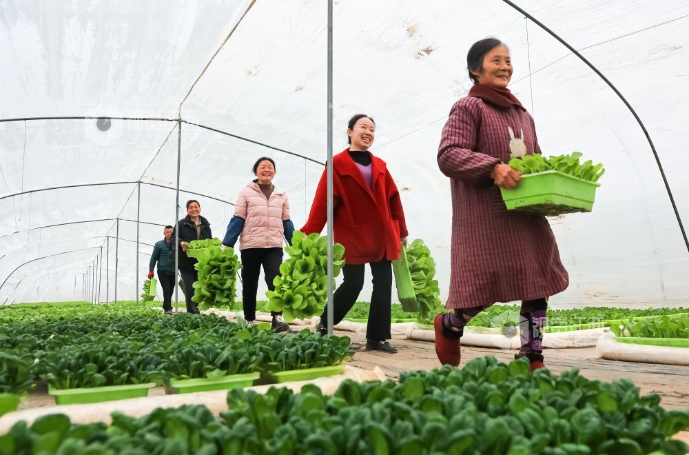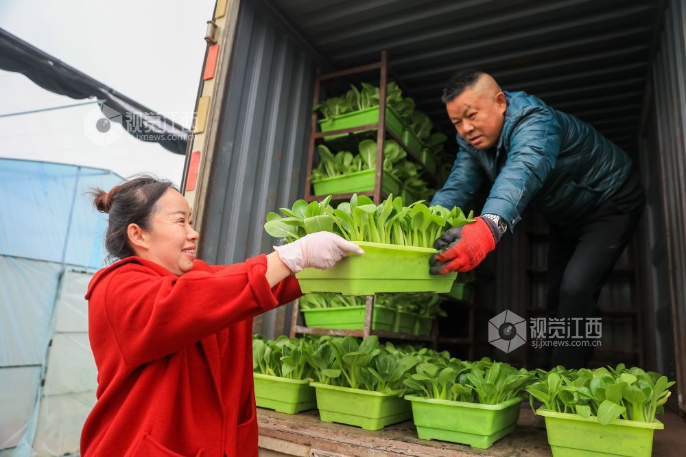 2024年1月7日,江西省瑞昌市高丰镇高丰村盆栽活体蔬菜基地内,村民们正在采收、装运盆栽有机蔬菜。