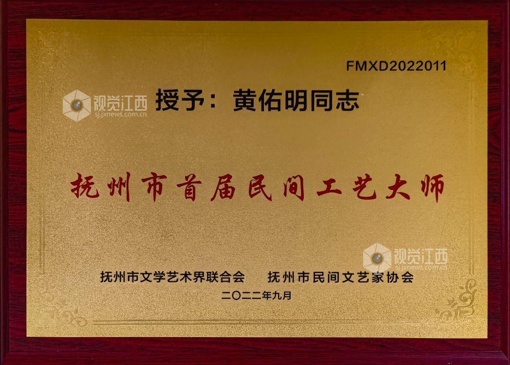 一分耕耘,一分收获。2022年9月,他被抚州市文学艺术界联合会、抚州市民间文艺家协会授予“抚州市首届民间艺术大师”荣誉称号;2023年12月,他被县文化广电新闻出版旅游局评定为第五批县级非物质文化遗产项目竹编技艺代表性传承人。