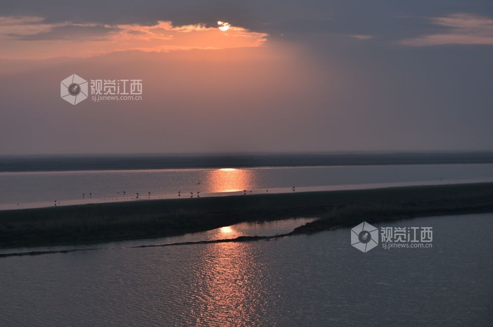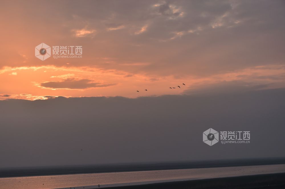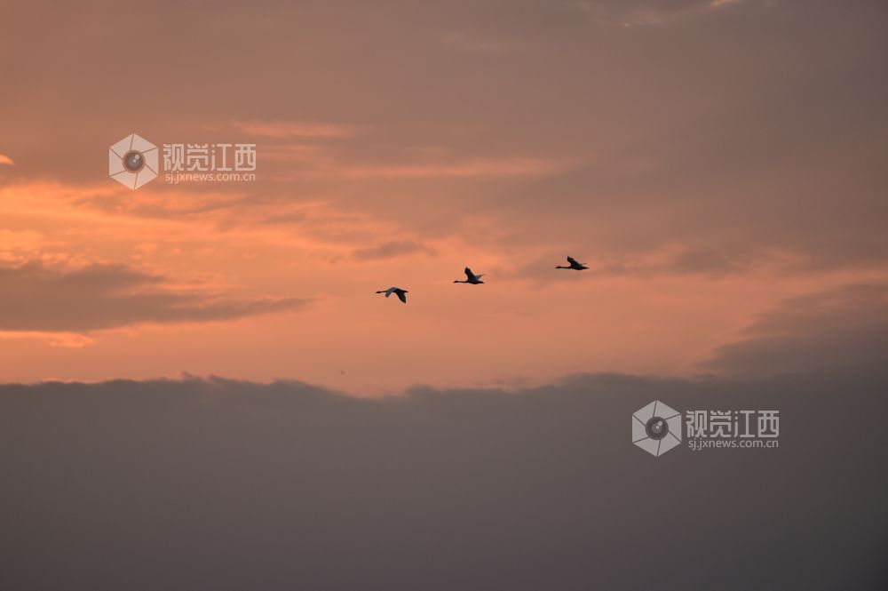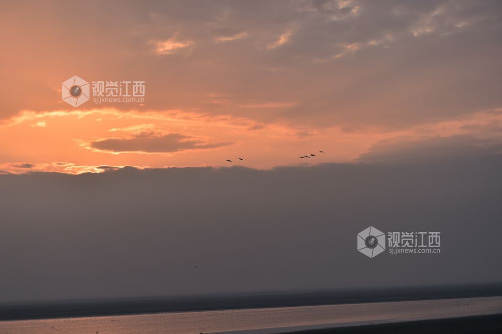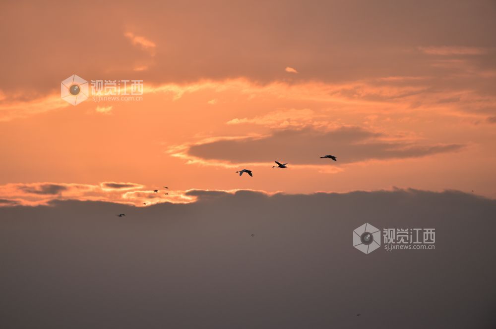 2023年1月,乘着天气晴好,在江西南昌高新区鲤鱼洲管理处白鹤小镇的圩堤上,一轮朝阳在天边的浮云之上冉冉升起,穿越浮云,把温暖的阳光播撒到湖泊滩涂草甸,流下一波波美丽的光影。不时有早起的雁鹤从天边飞过,穿越初升的云霞,流下道道美丽的倩影,呈现出一幅“朝霞与雁鹤齐飞,鄱水共长天一色”的绝美生态画卷。