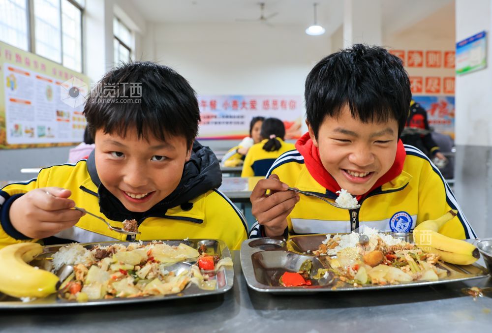 2024年1月18日,江西省瑞昌市横立山学校学生正在开心地吃免费午餐。