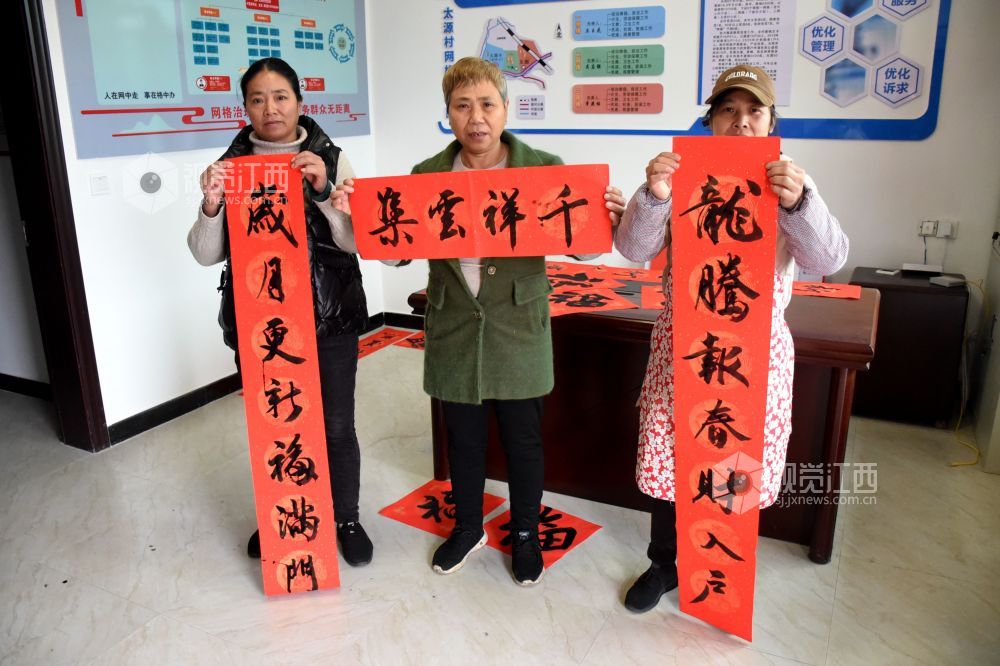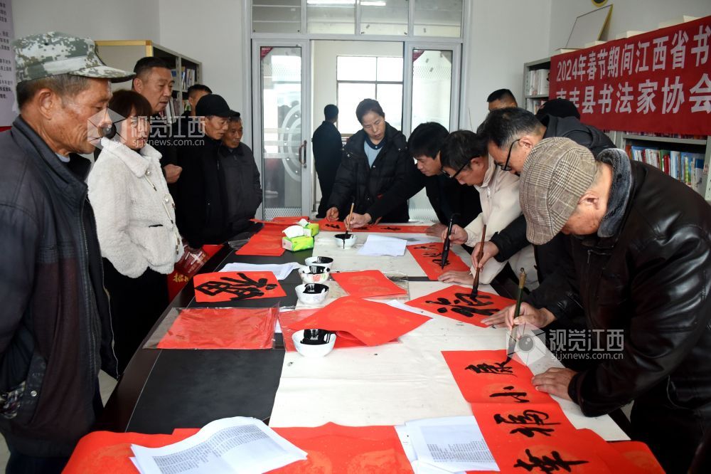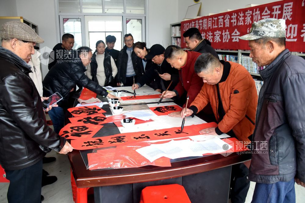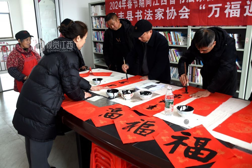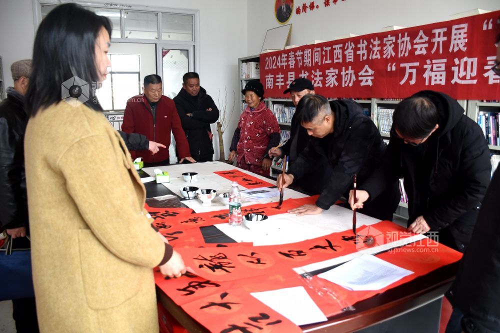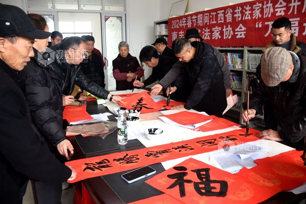 2024年1月19日,在江西省抚州市南丰县太源乡太源村三楼会议室,书法家们正在挥毫泼墨为村民免费书写春联,营造文明、健康、团结、和谐的新春气氛。
