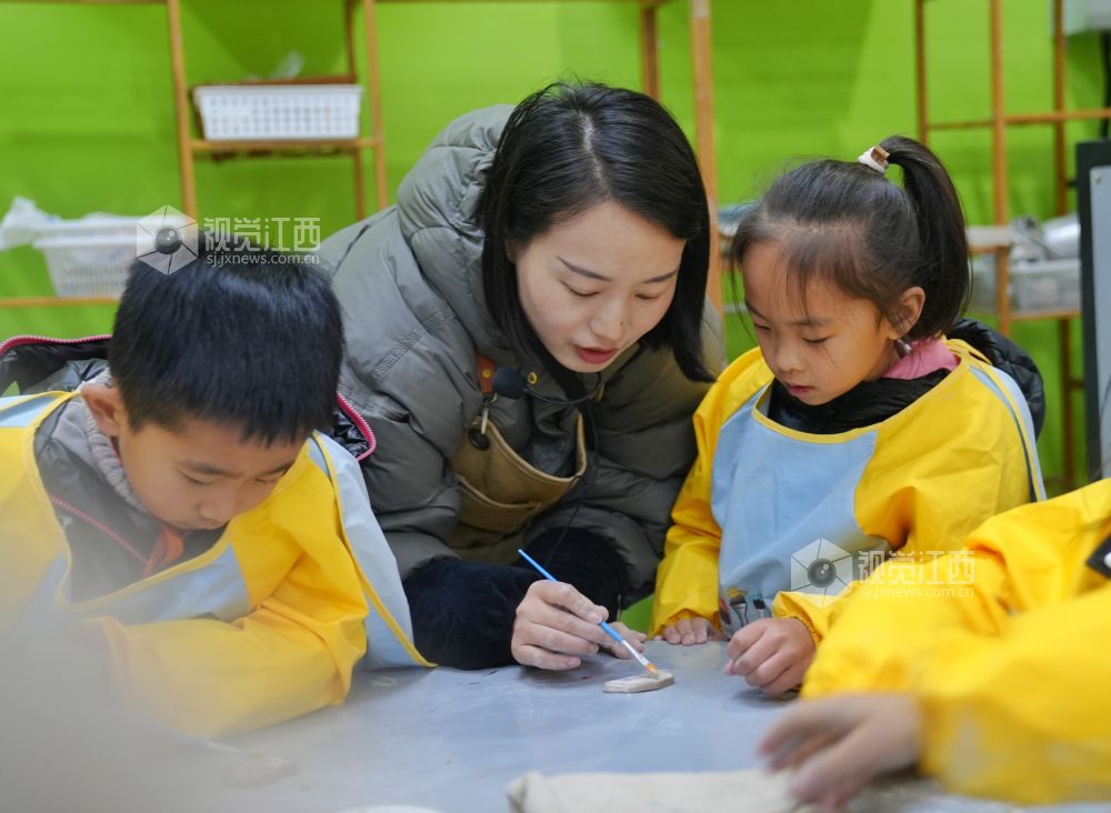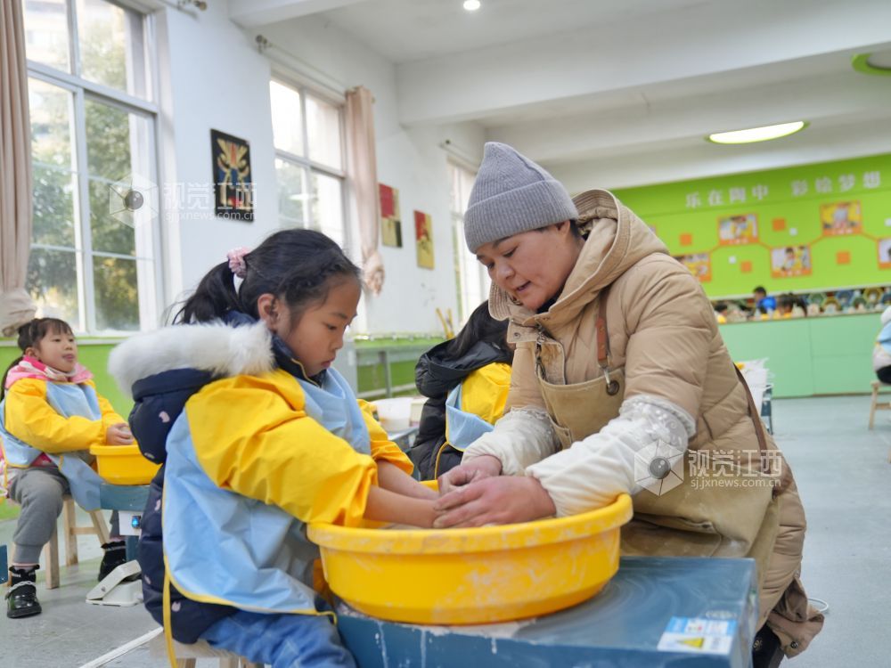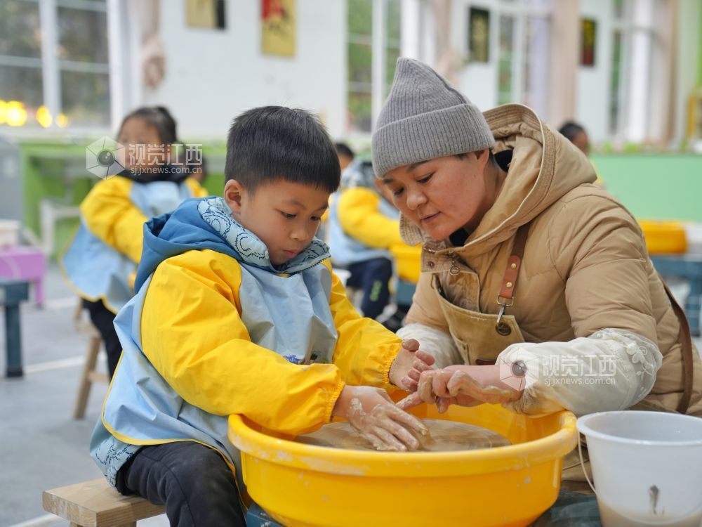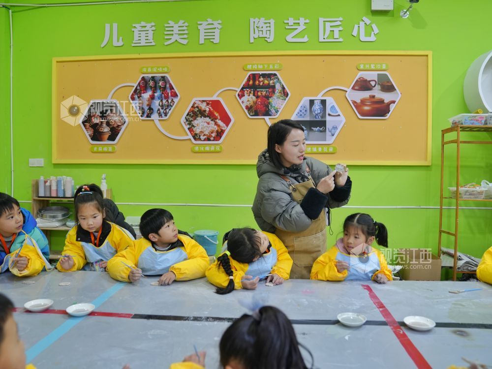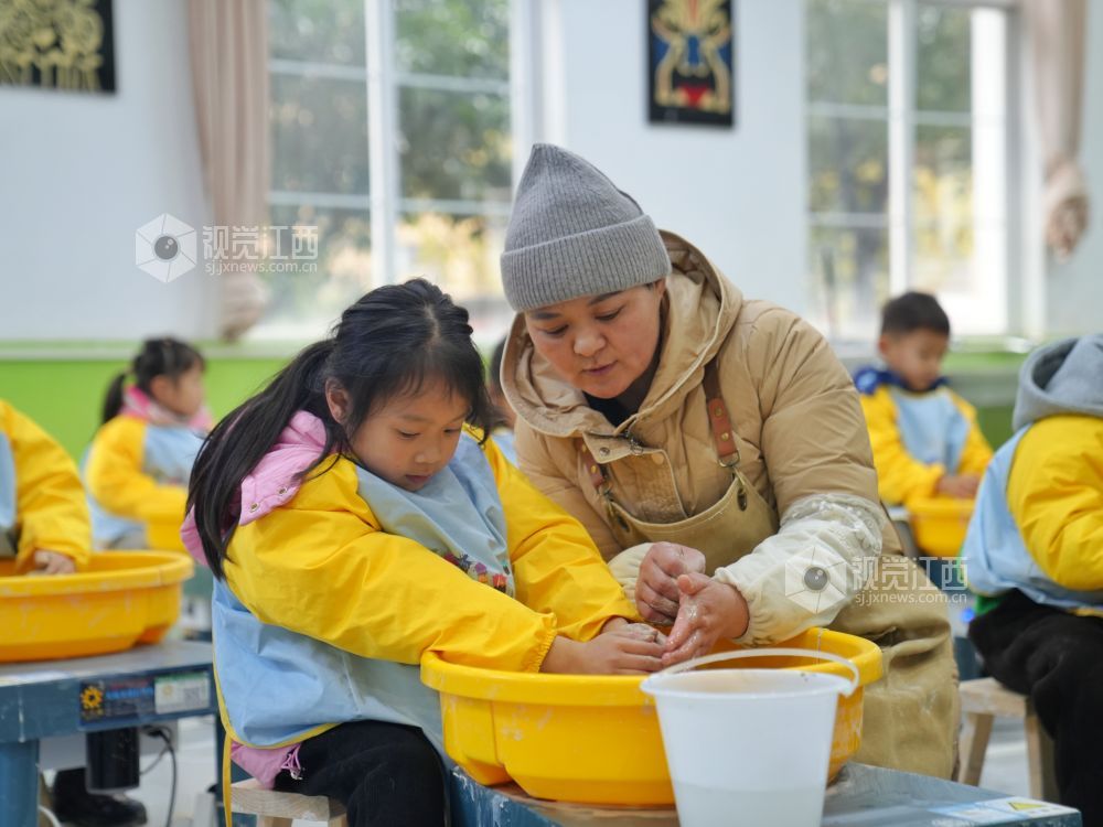 2024年1月19日,在江西省萍乡市芦溪县芦溪镇第四中心学校陶艺课上,陶艺专业老师正在指导学生制作陶艺作品。