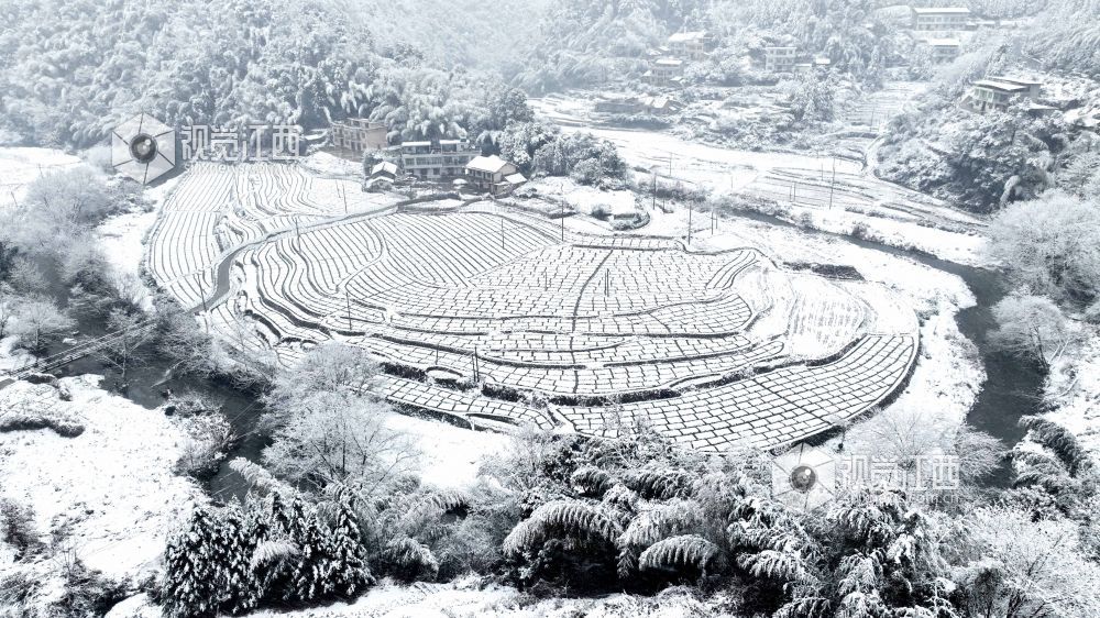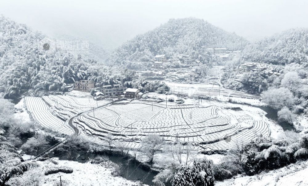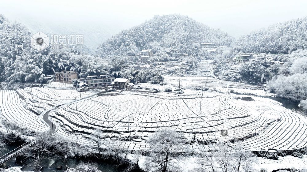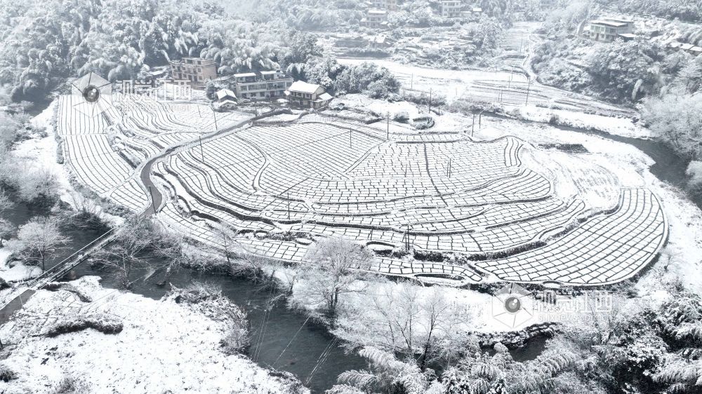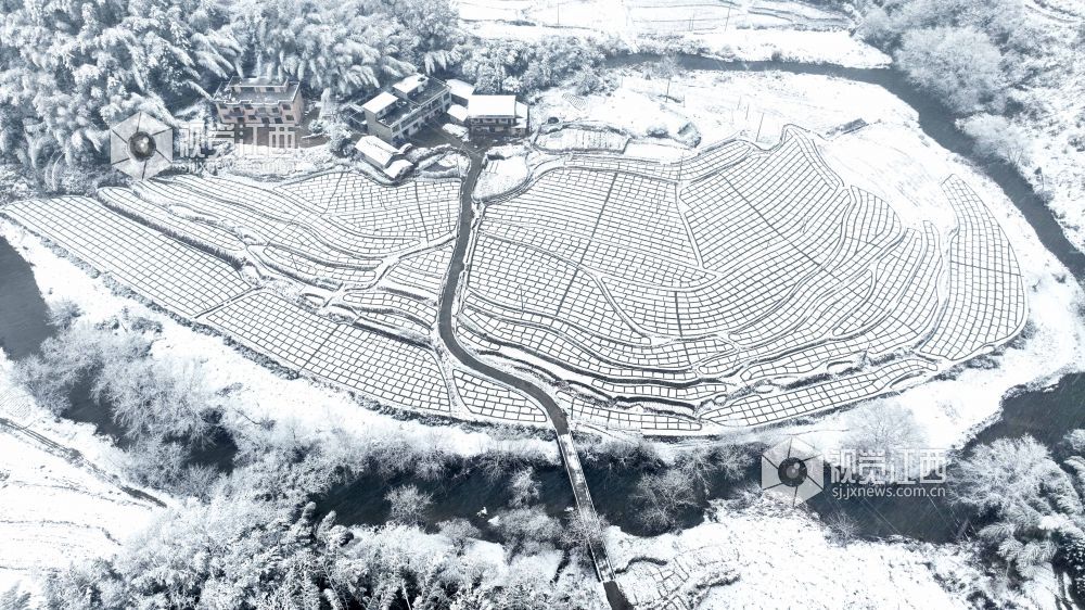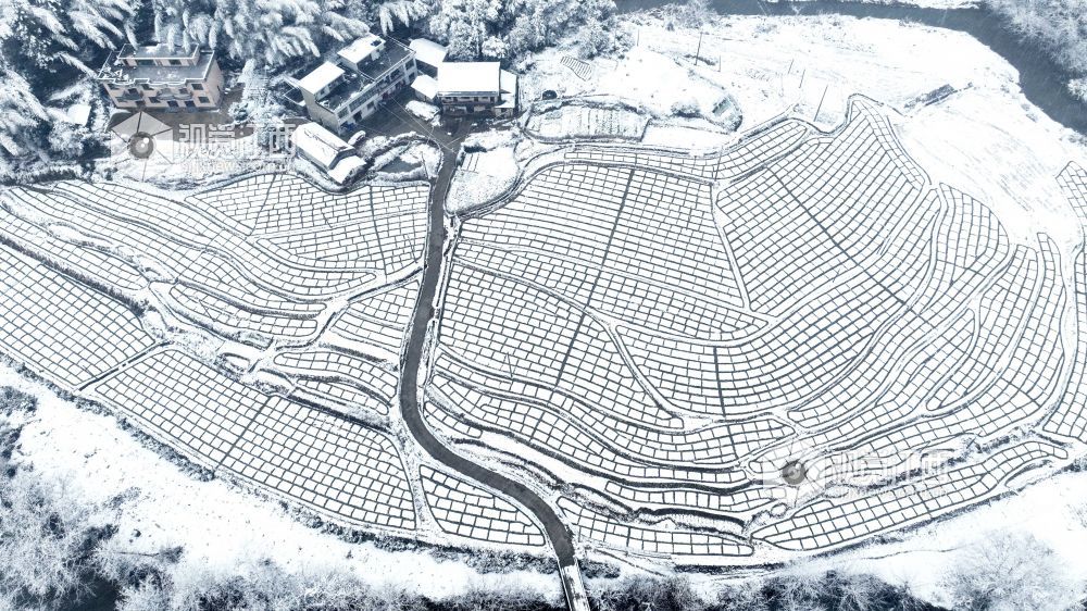 2024年1月22日,江西省宜春市万载县白水乡文义村迎来了今冬第一场雪。薄薄的积雪将山乡田园百合基地妆扮的如水墨画,格子线条、散落的村庄、远处的山峦构成了一幅幅山村冬雪图。