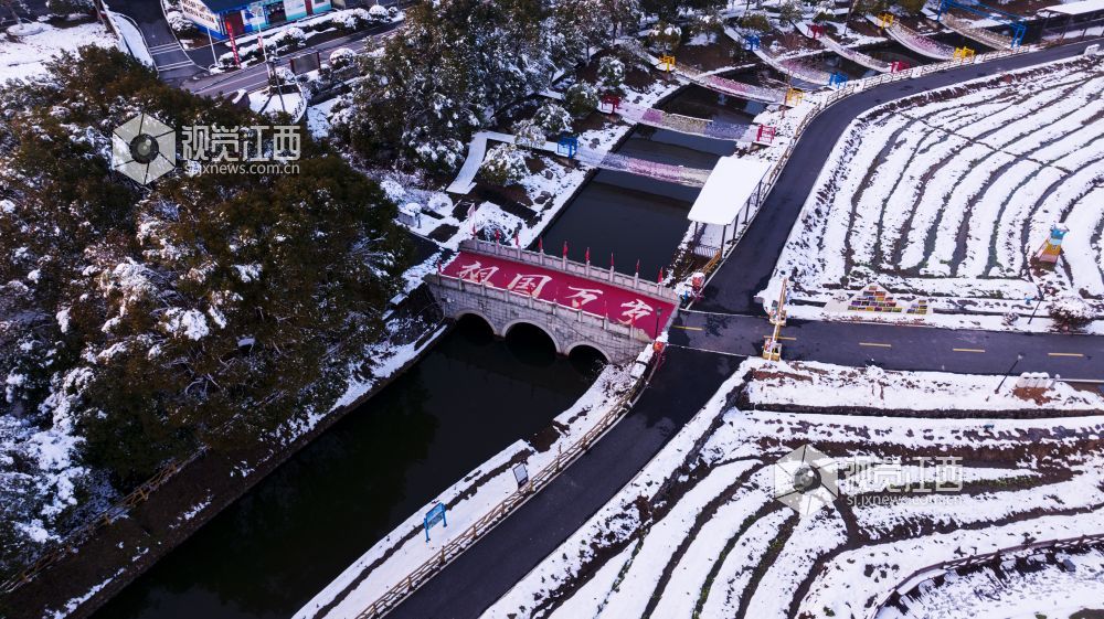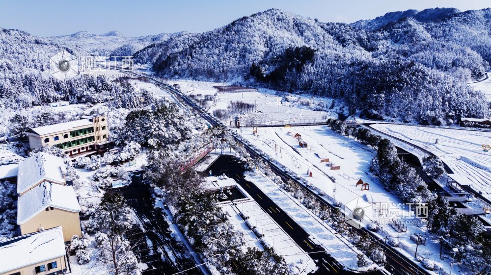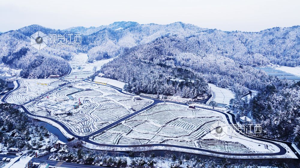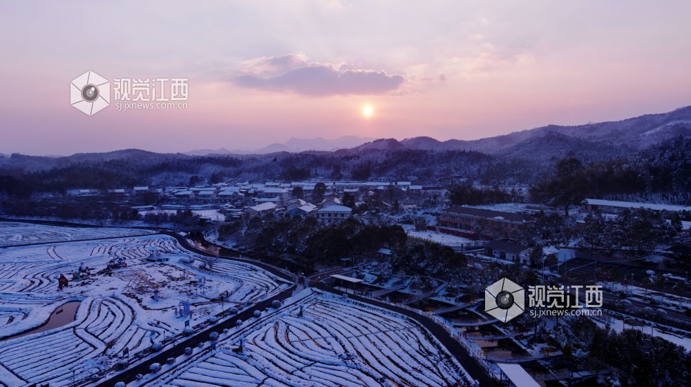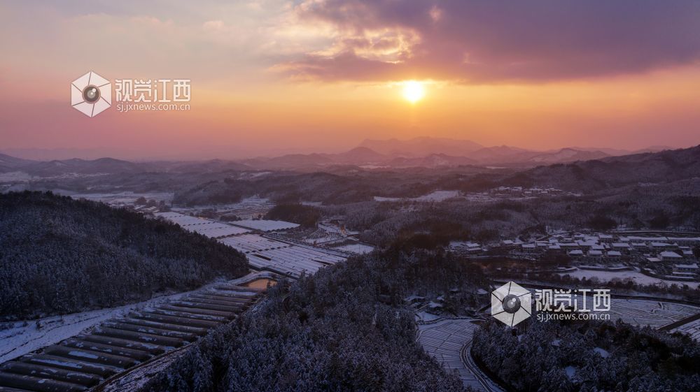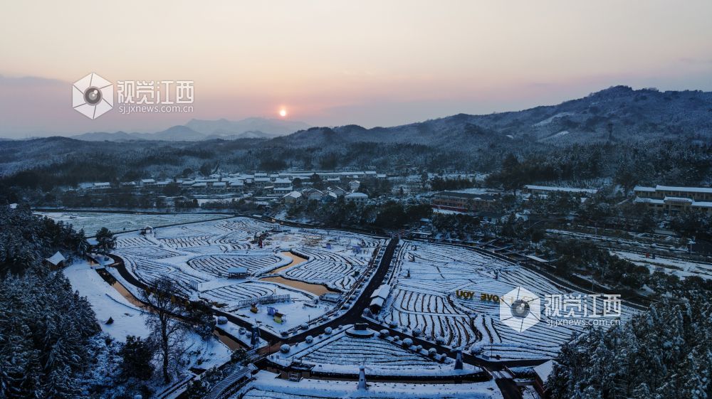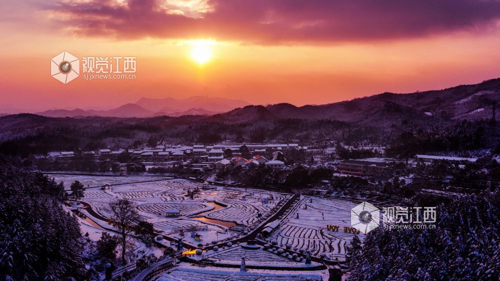 1月23日,大雪后的江西新余渝水区良山镇下保村银装素裹,在晚霞的映照下,青山、道路、田园、民宿、河流组成一幅美丽的乡村画卷。