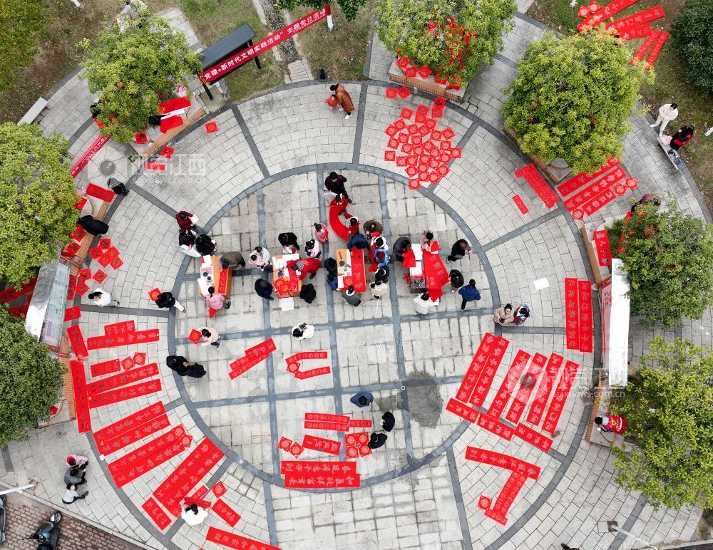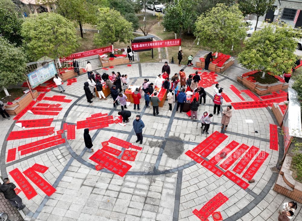 2023年1月26日,在江西省上饶市铅山县河口镇城东社区信江龙庭小区,书法爱好者正在挥毫泼墨,为居民书写心仪的春联和福字。