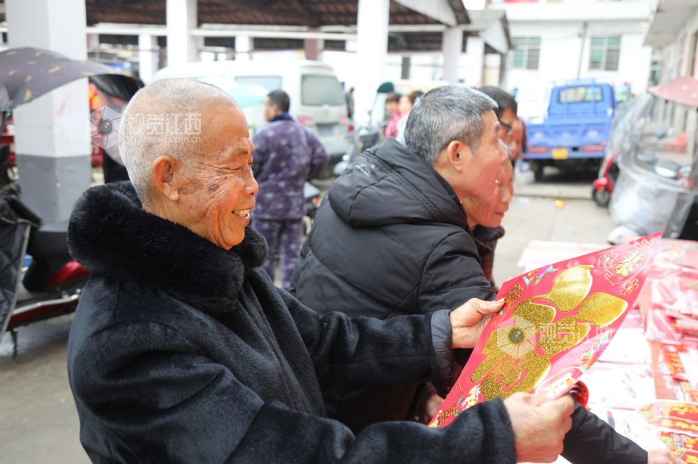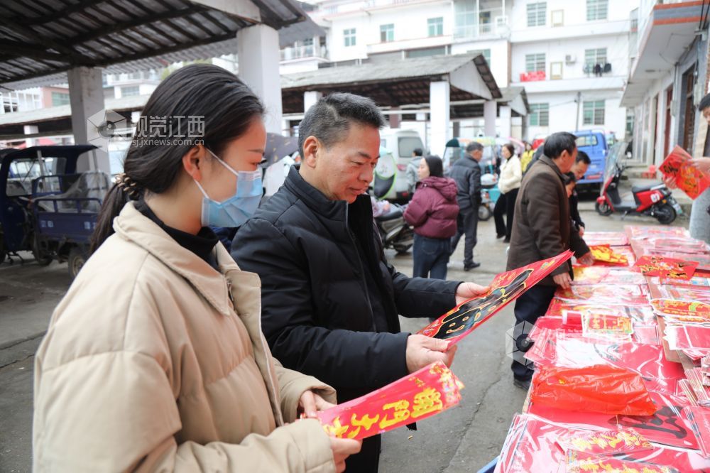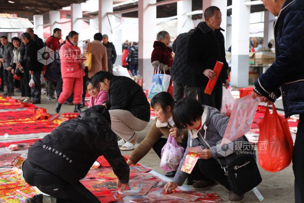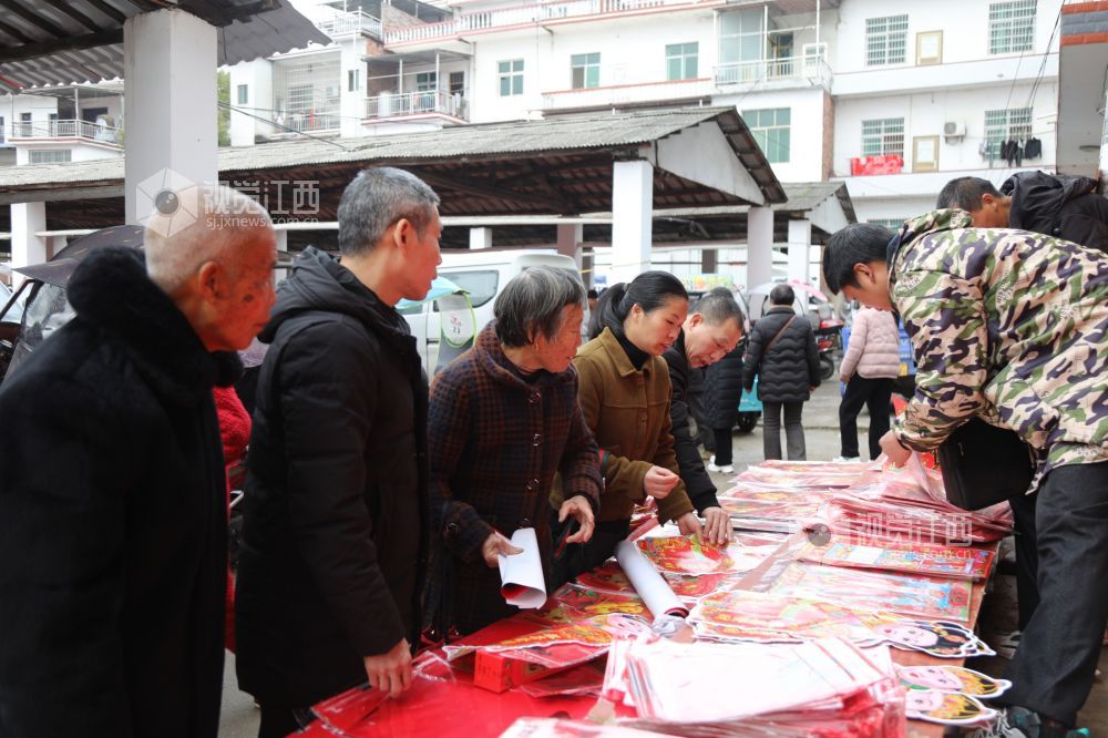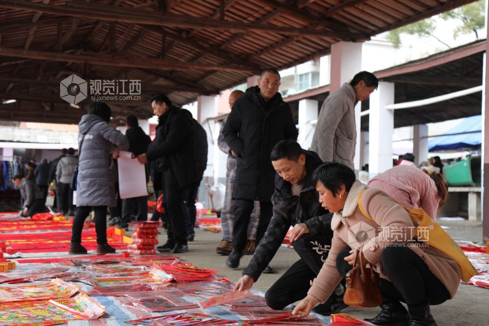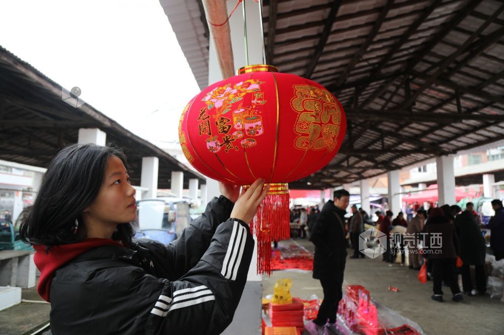 1月31日,春节临近,在江西省莲花县良坊镇集贸市场,售卖对联等春节饰品的摊子前人来人往,他们正在这里挑选采购春节装饰家庭的对联、灯笼等装饰品,迎接春节的到来。