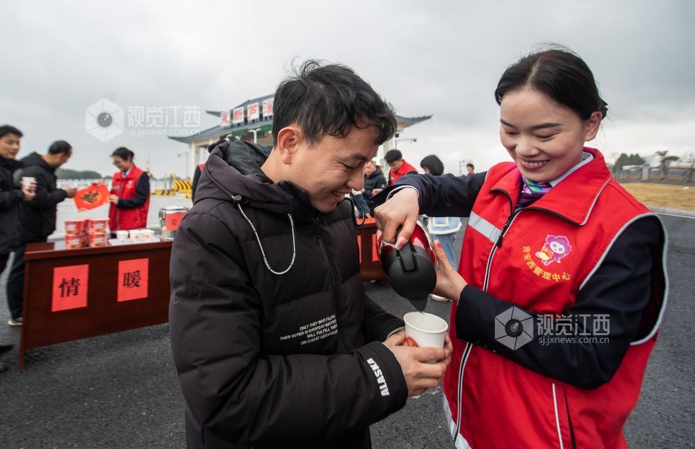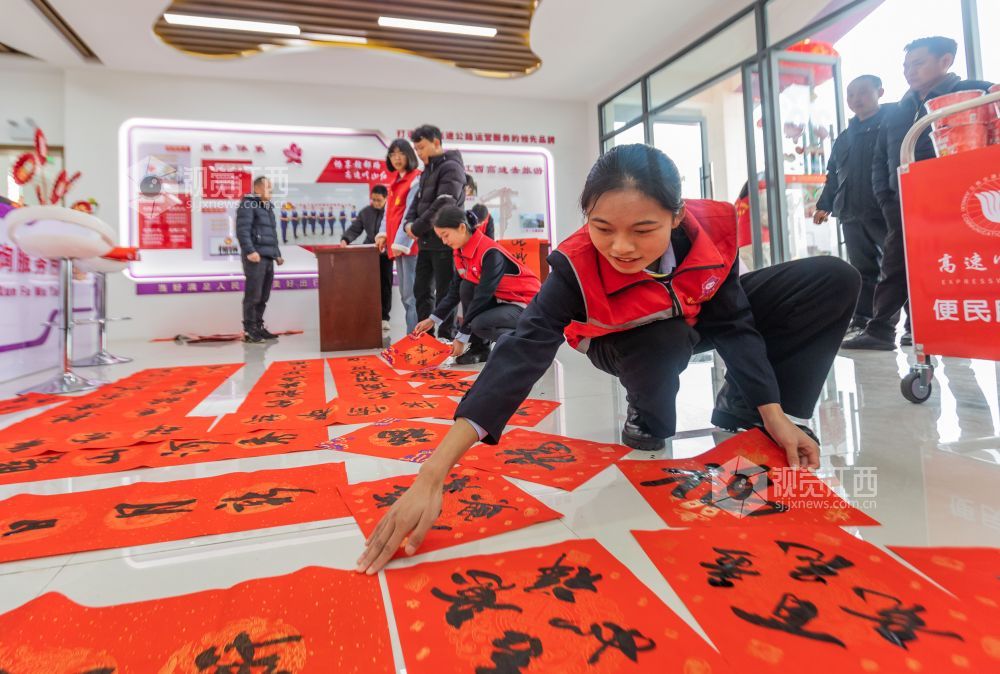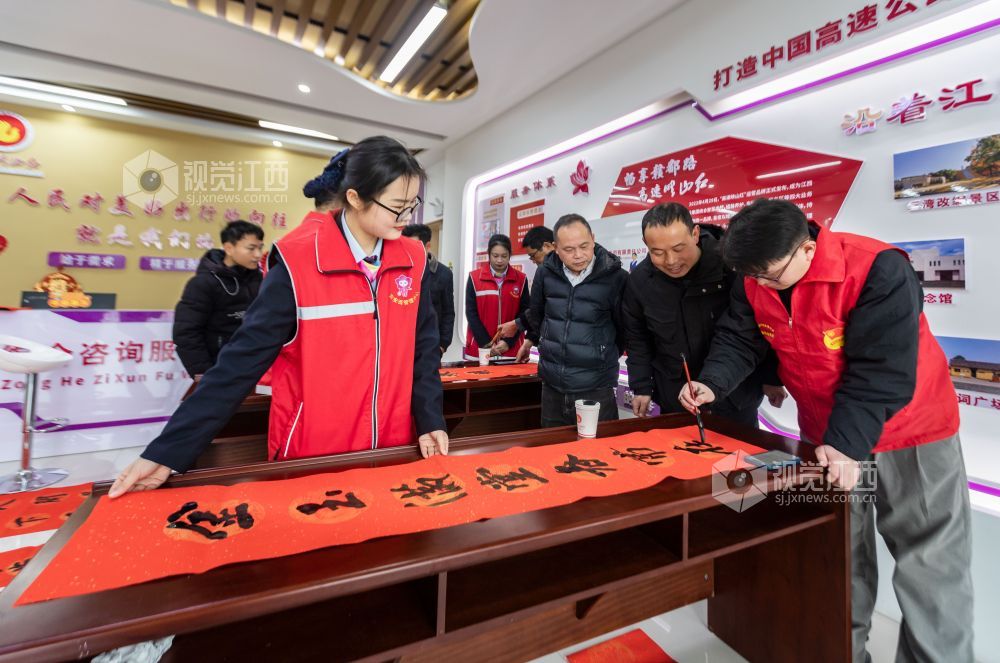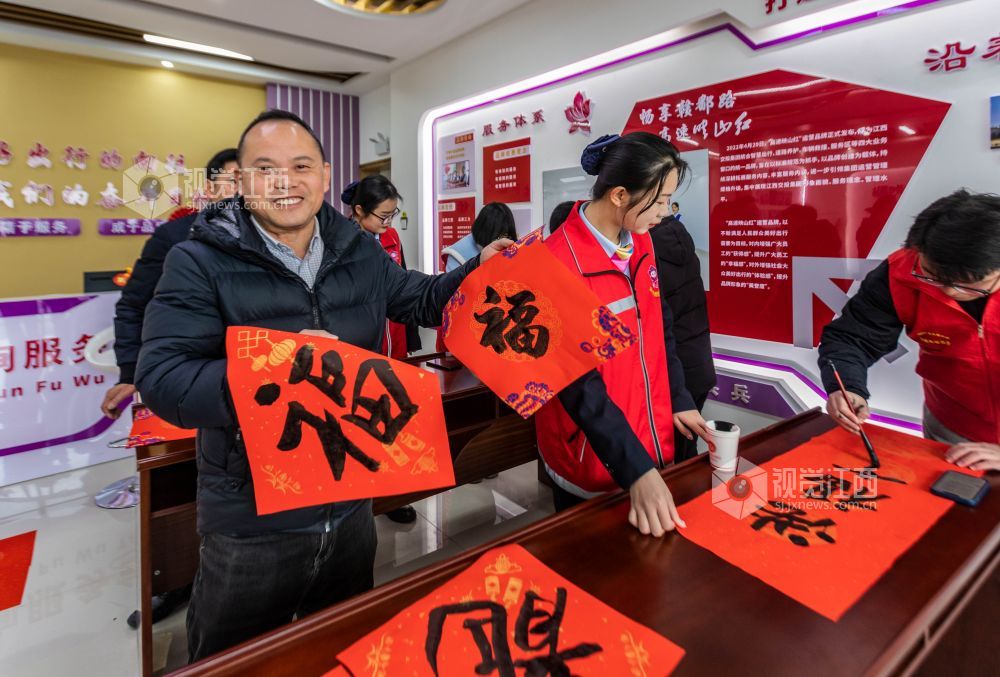 活动中,志愿者们现场挥毫泼墨,为过往司乘写春联、送“福”字,并提供暖意融融的姜茶,向广大司乘朋友致以新春的祝福,让春运回家路更加温暖。