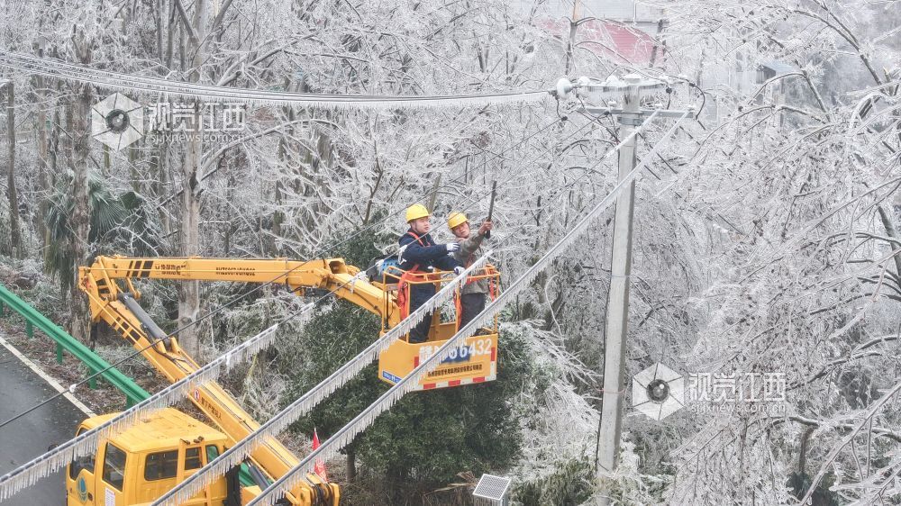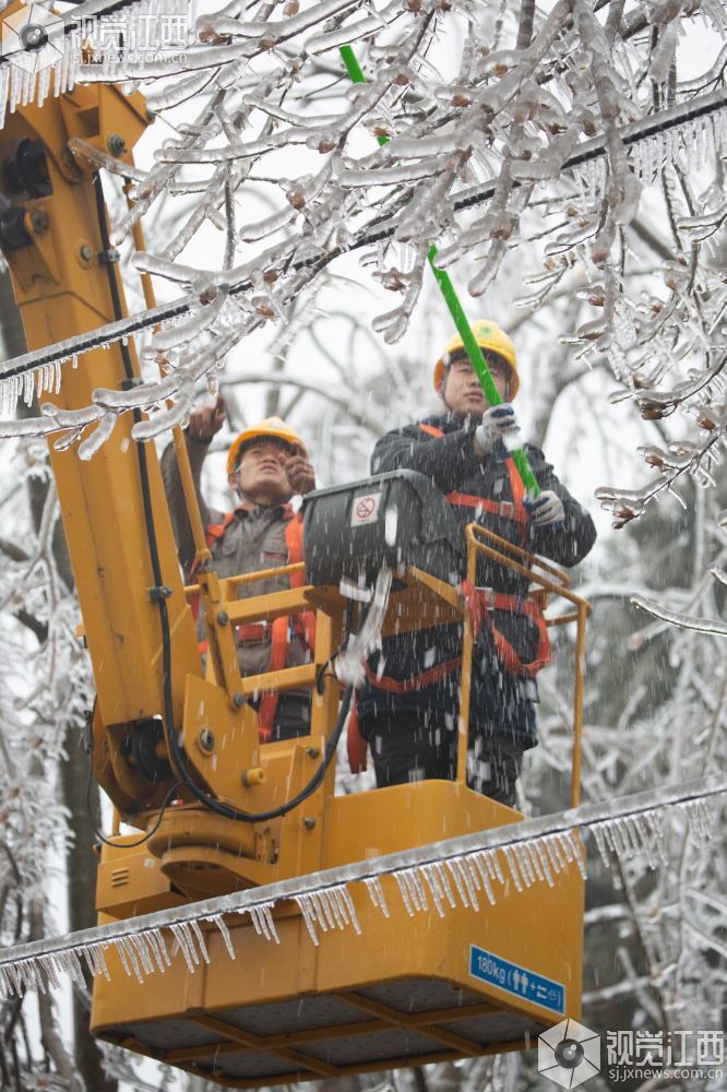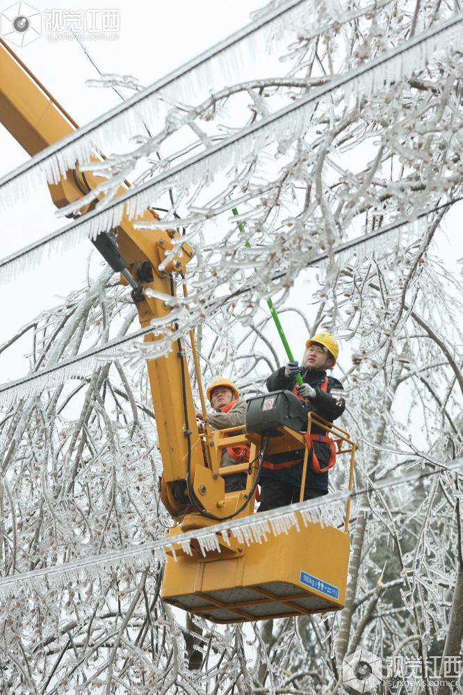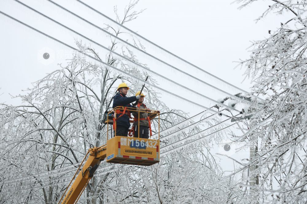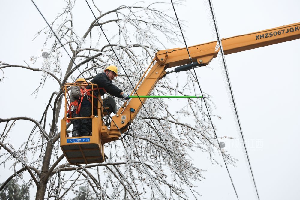 2024年2月6日,江西省瑞昌市青山林场,国网瑞昌市供电公司工作人员在对线路设备进行除冰,以尽快恢复该片区线路设备的正常运行。