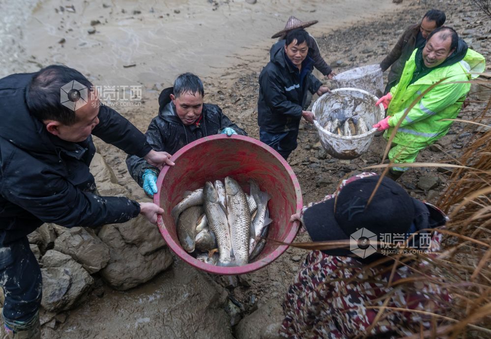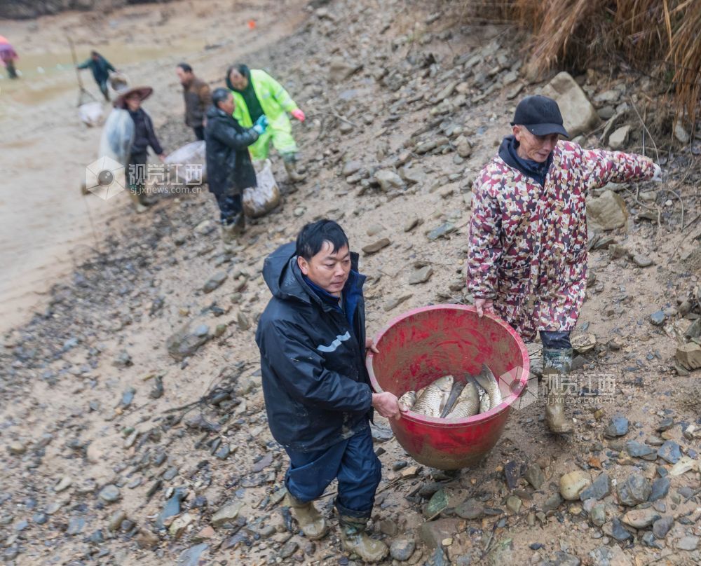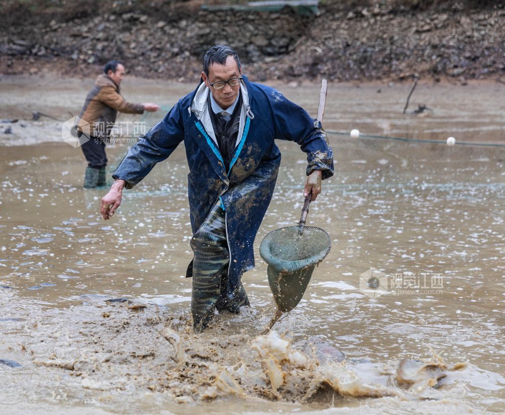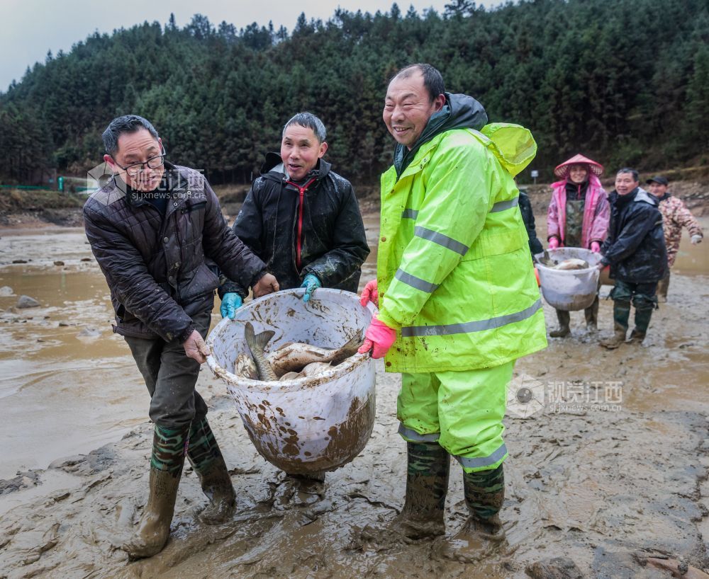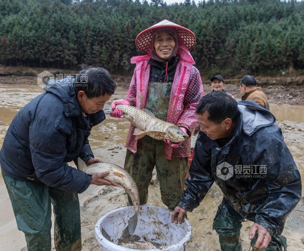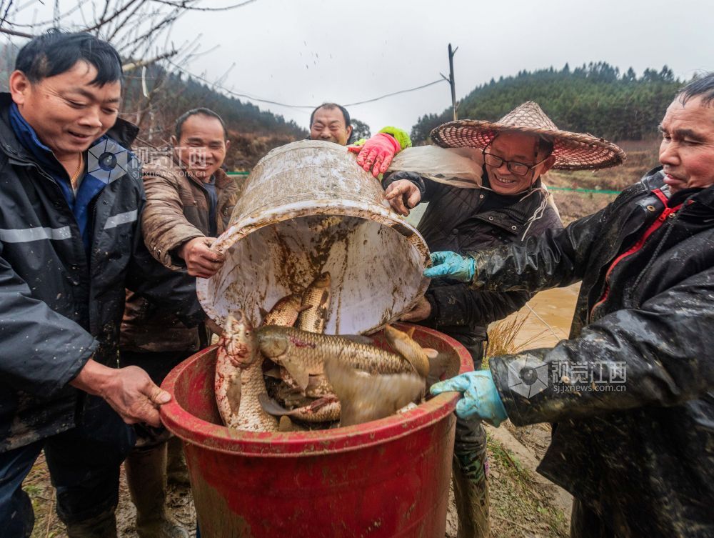 春节将至,年味渐浓。2月7日,江西省吉安市永新县曲白乡小枧村集体鱼塘喜获丰收,村民们聚在一起抽水干塘,捉鱼分鱼,共享丰收成果,欢度龙年春节。