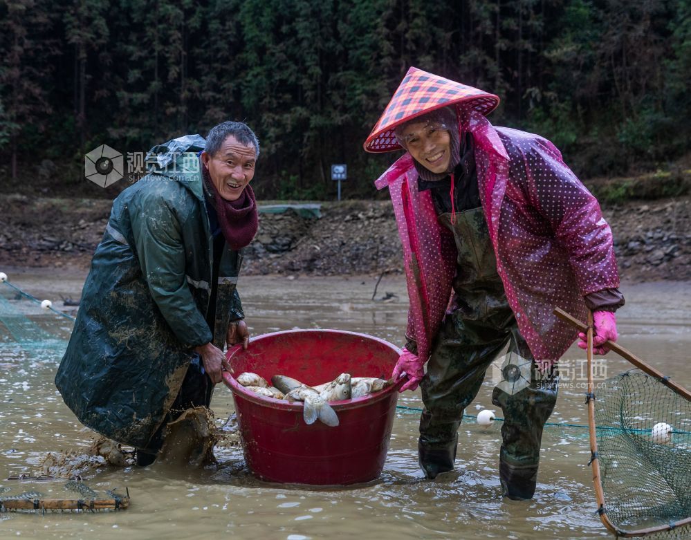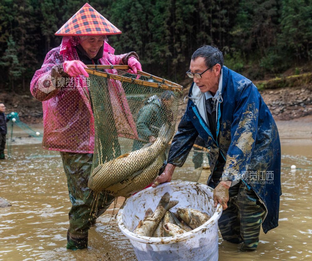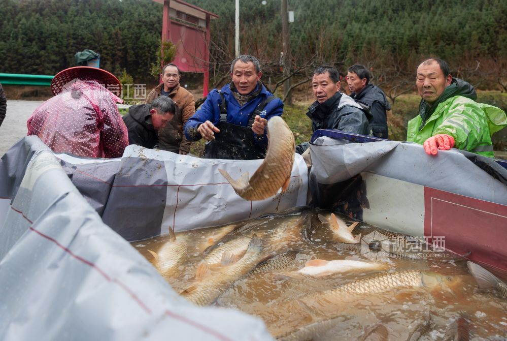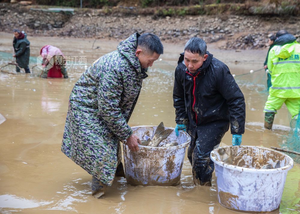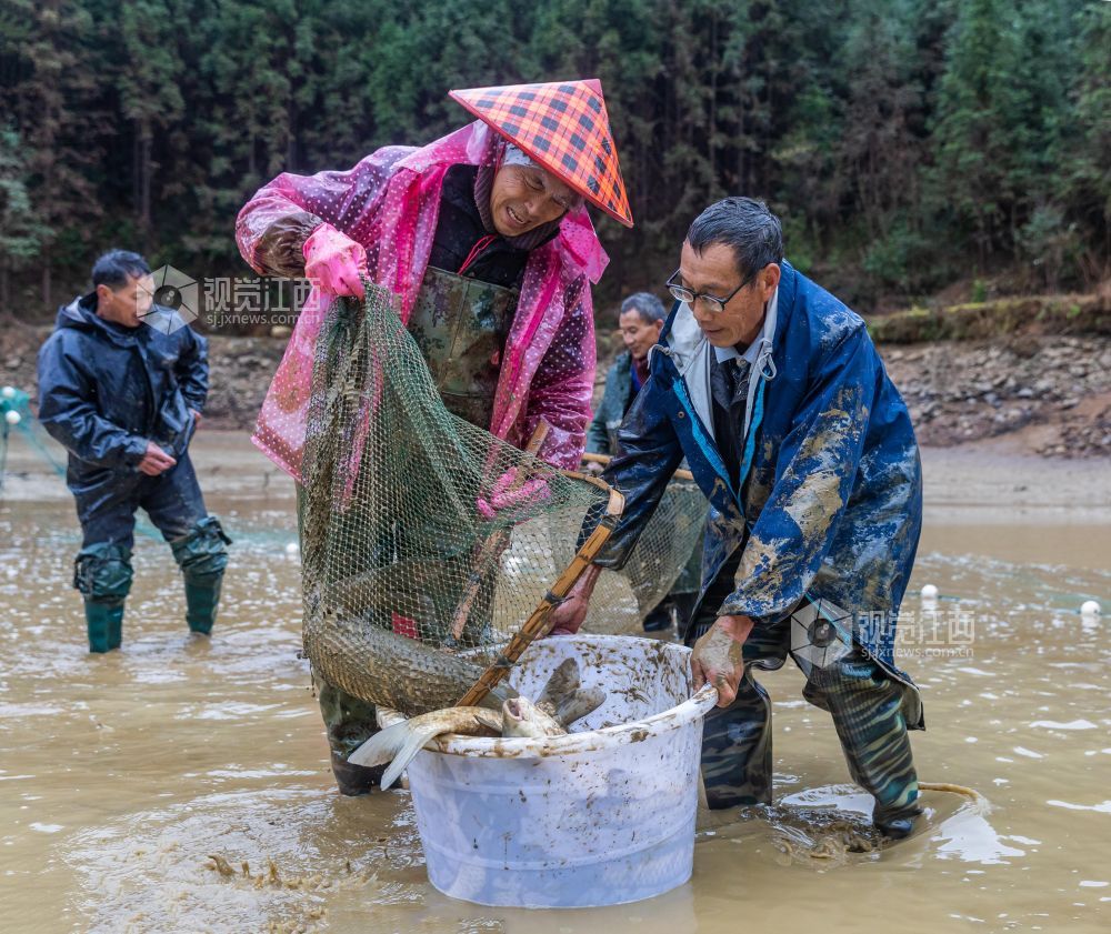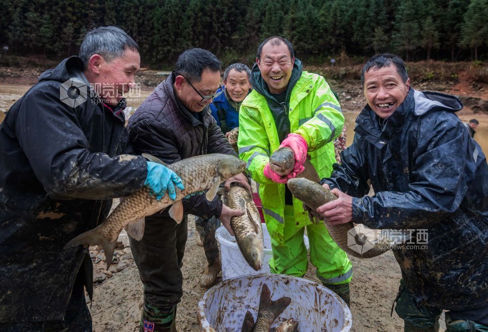 春节将至,年味渐浓。2月7日,江西省吉安市永新县曲白乡小枧村集体鱼塘喜获丰收,村民们聚在一起抽水干塘,捉鱼分鱼,共享丰收成果,欢度龙年春节。