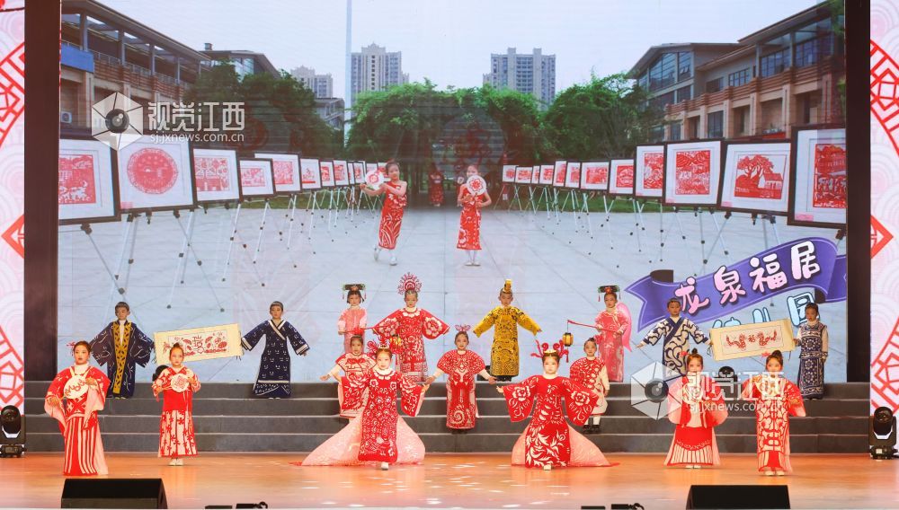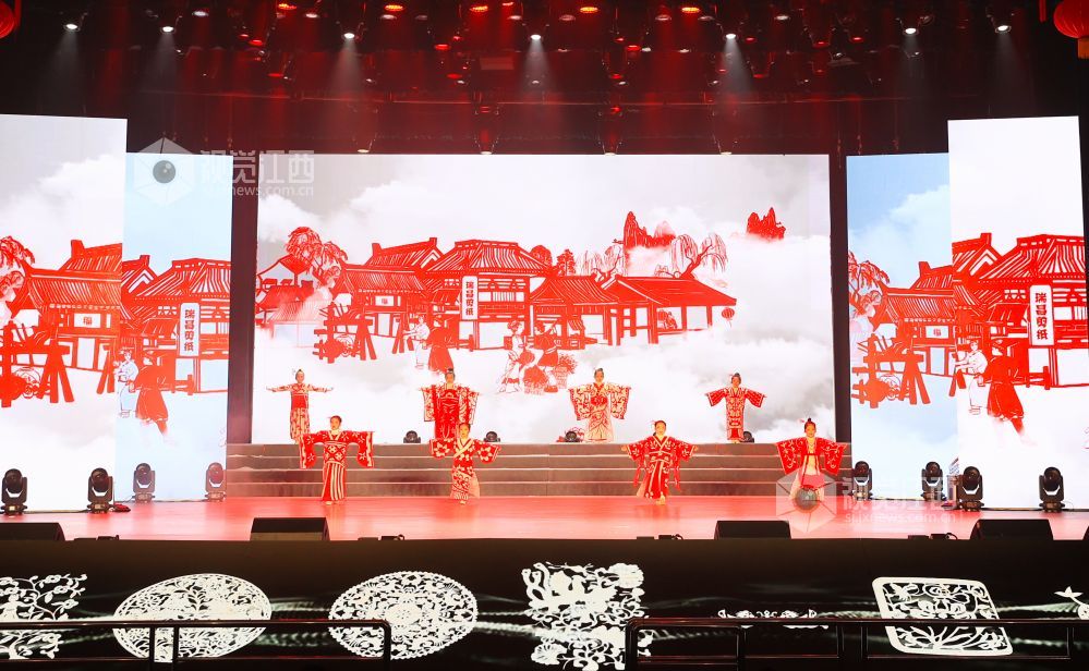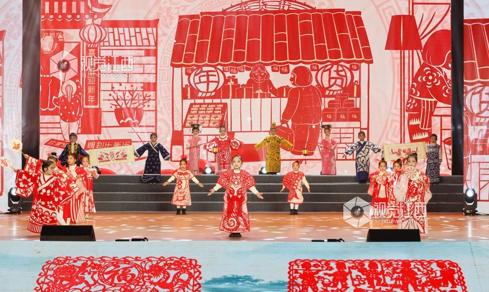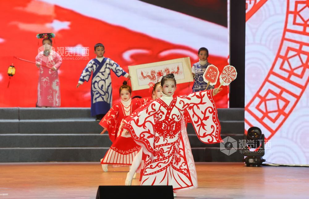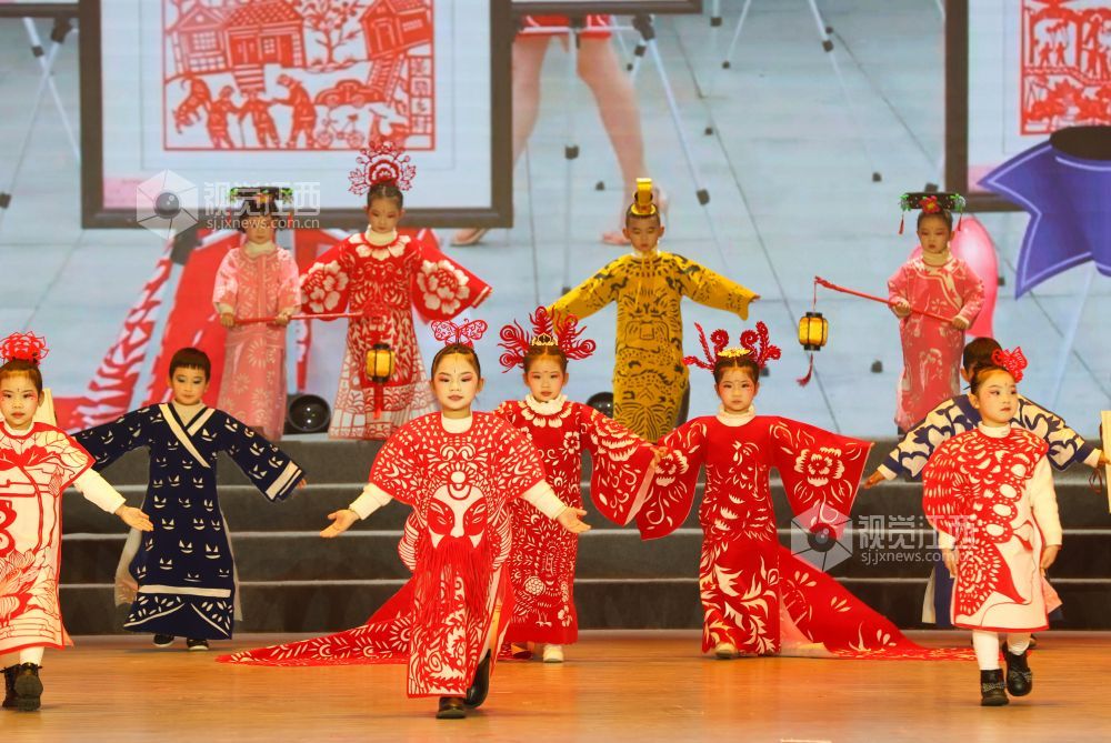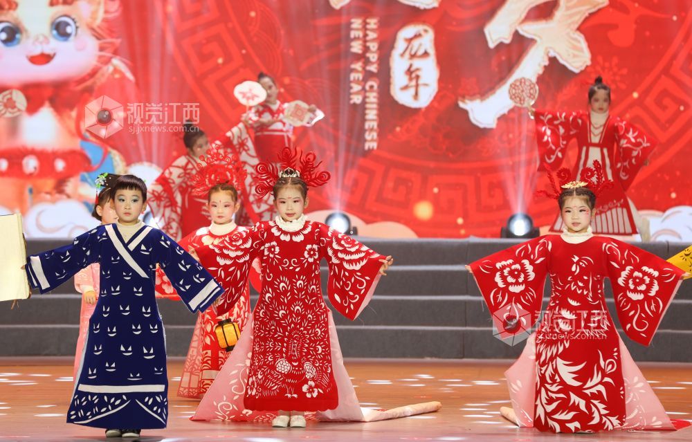 晚会现场,孩子们身着各式各样的剪纸服装,将国家级非遗“瑞昌剪纸”与古典服装相结合,展示非遗产品的文化魅力,让非遗文化为春节增添年味。