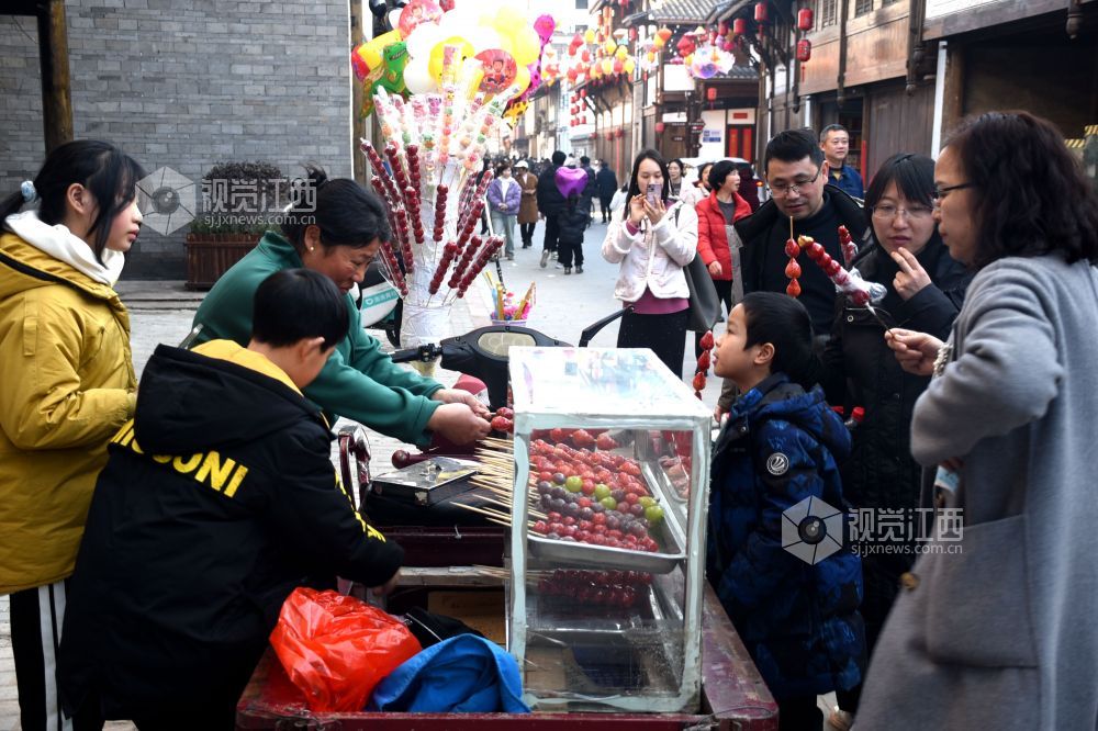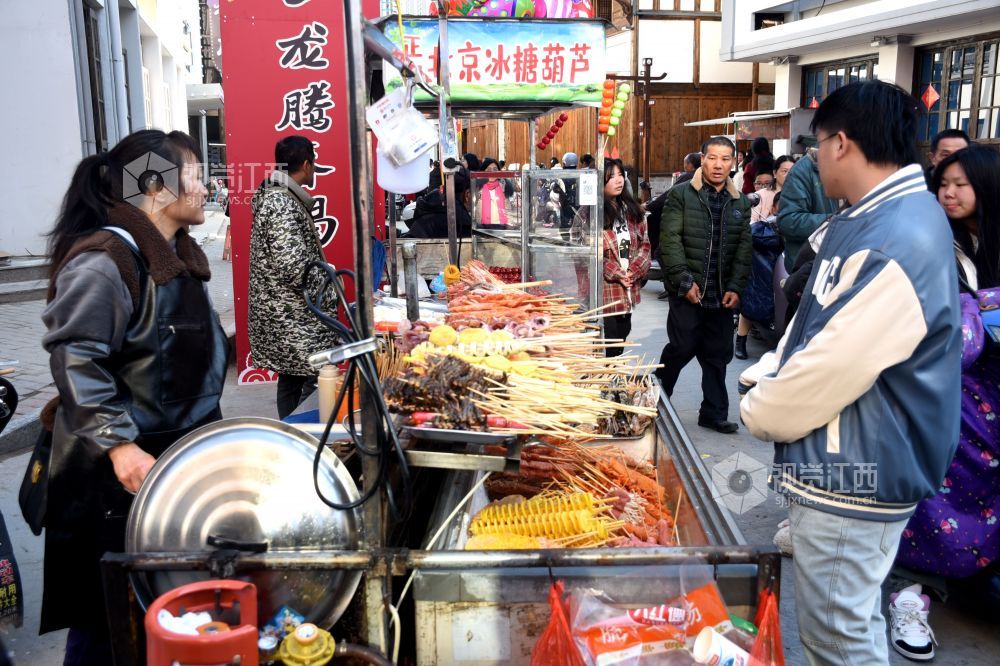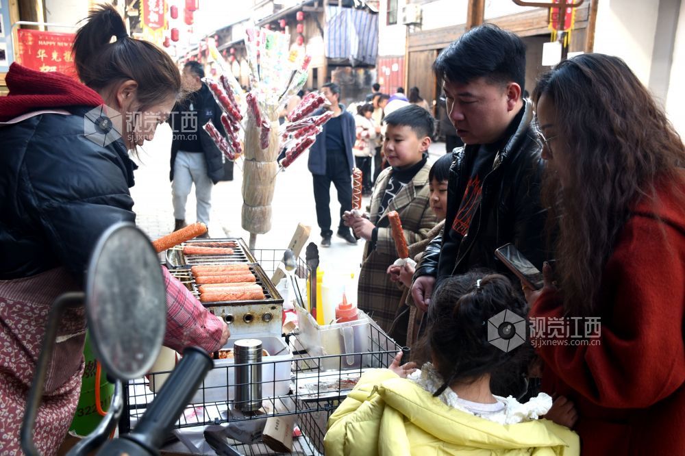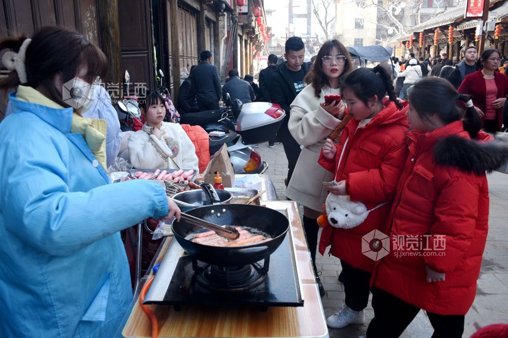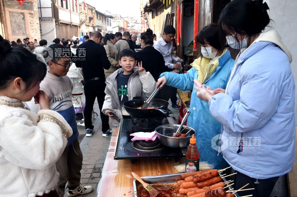 2024年2月11日,在江西省抚州市南丰县南门古城,游客和市民们一边逛古街、游古城,一边品尝特色美食,寻往昔乡愁,度过一个不一样的春节。