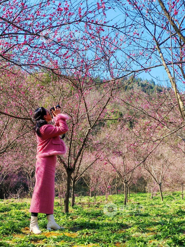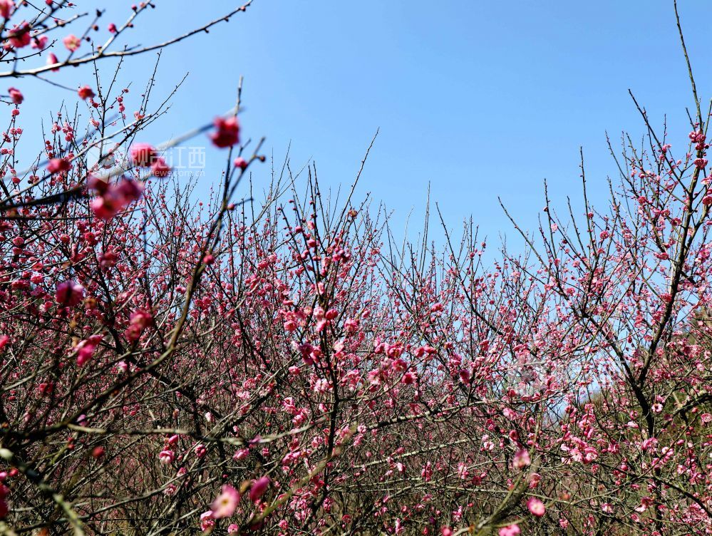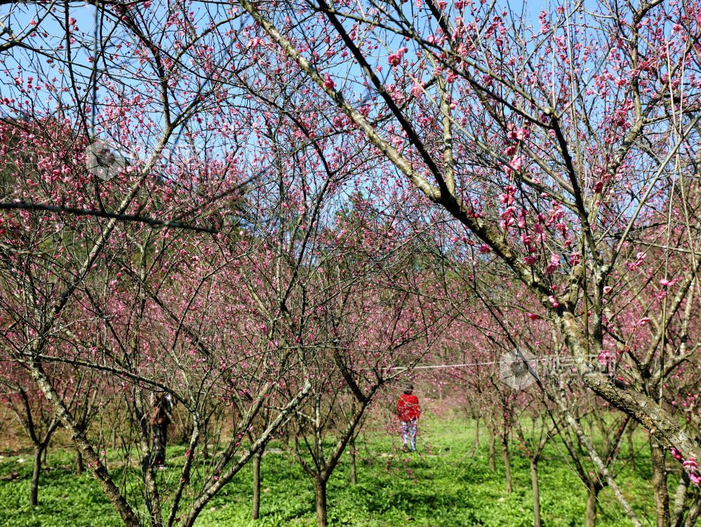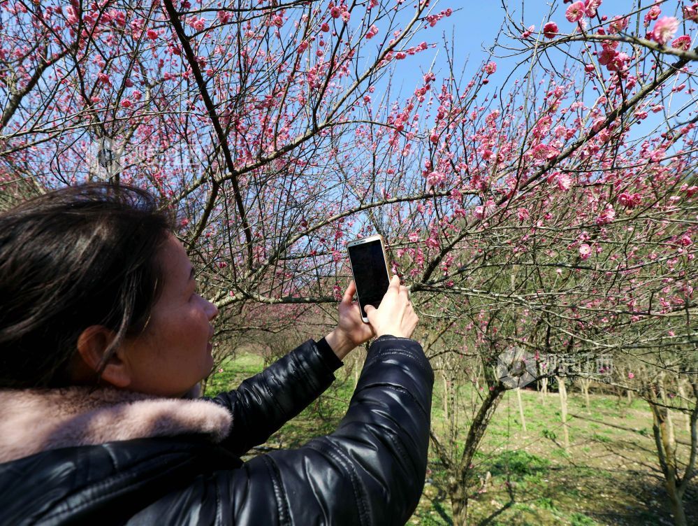2024年2月11日,游客在江西省分宜县圆梦园的梅花林里赏花拍照。连日来,随着气温回升,圆梦园里的梅花竞相盛开。朵朵梅花如霞似火,幽香扑鼻,吸引市民前来探梅闻香,感受春日的美好。