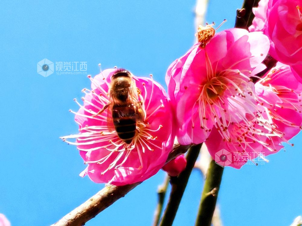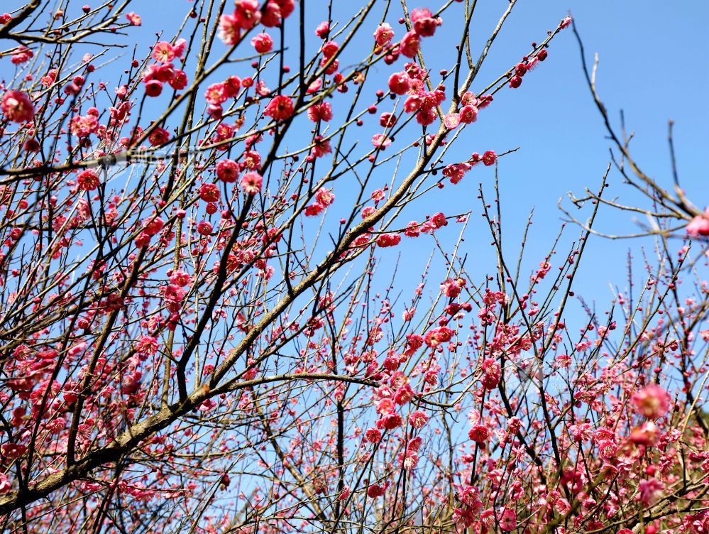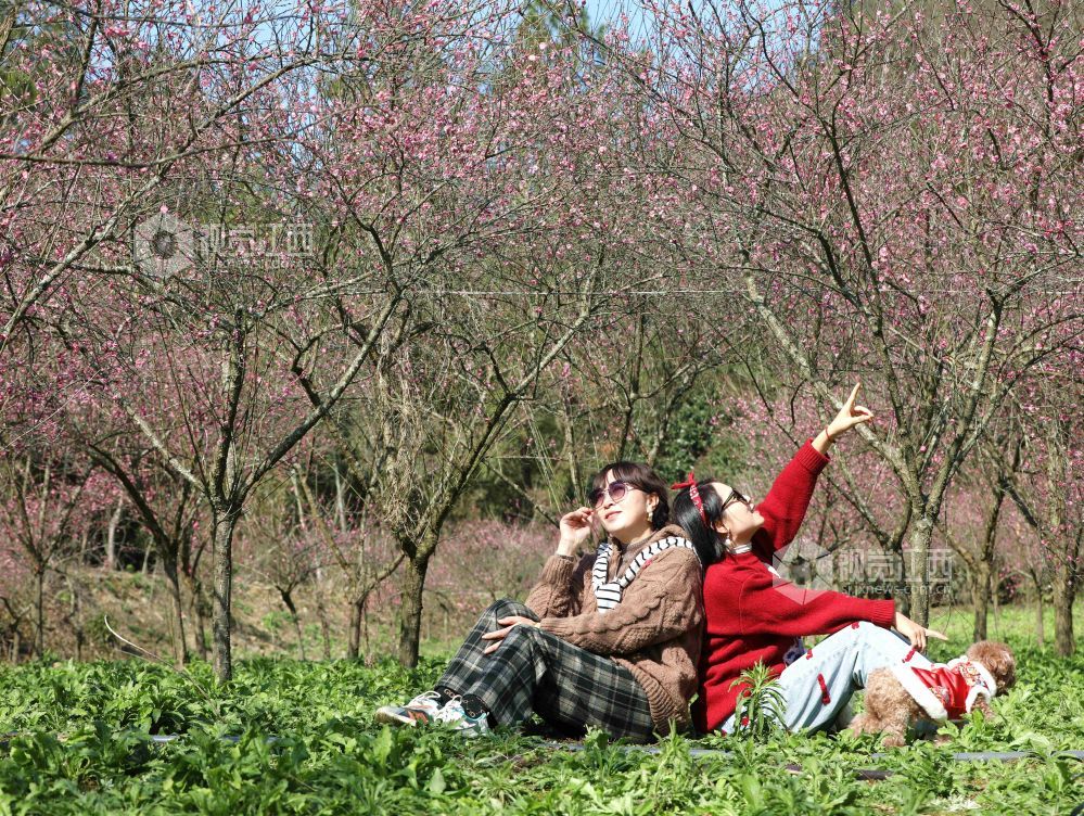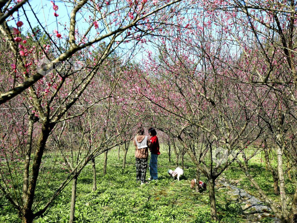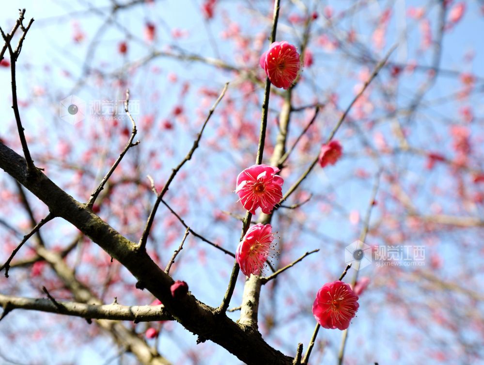 2024年2月11日,游客在江西省分宜县圆梦园的梅花林里赏花拍照。连日来,随着气温回升,圆梦园里的梅花竞相盛开。朵朵梅花如霞似火,幽香扑鼻,吸引市民前来探梅闻香,感受春日的美好。