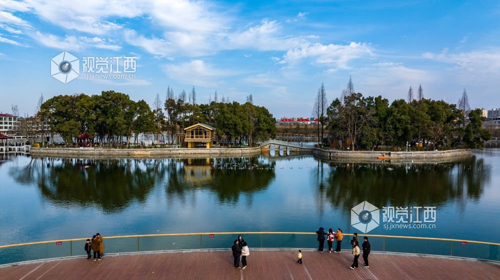 2024年2月12日,提升改造后在春节期间重新开放的江西省瑞昌市柳湖公园水清岸绿、风景如画,吸引了不少市民在此休闲游玩。