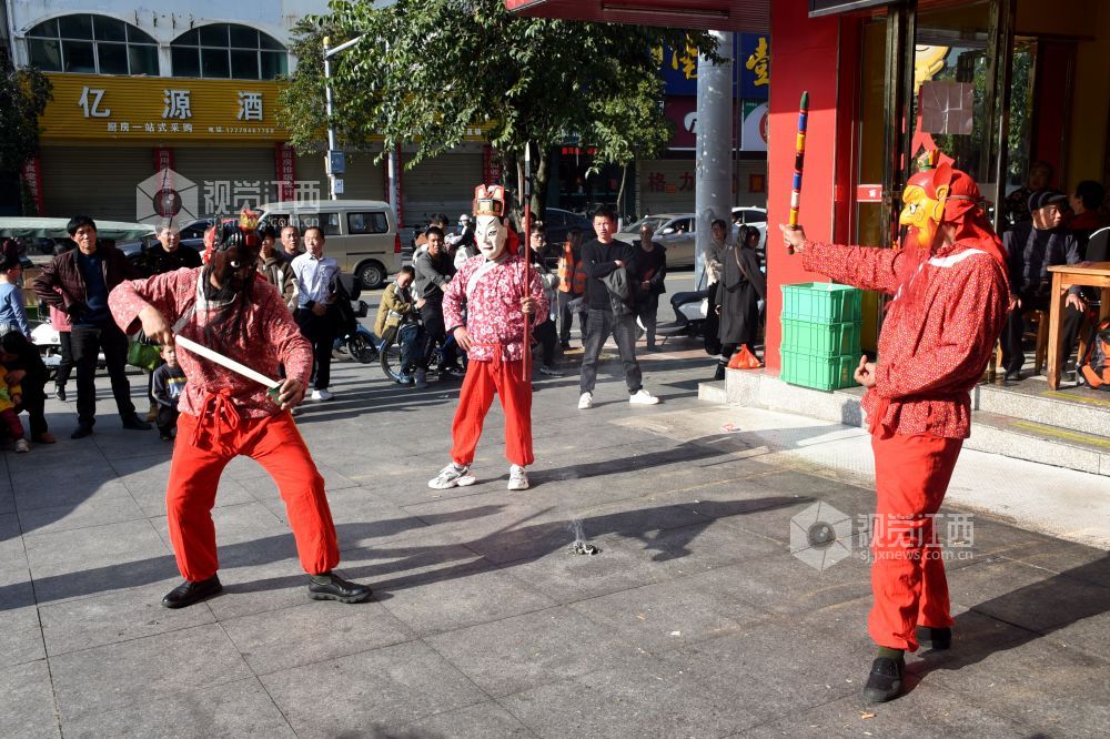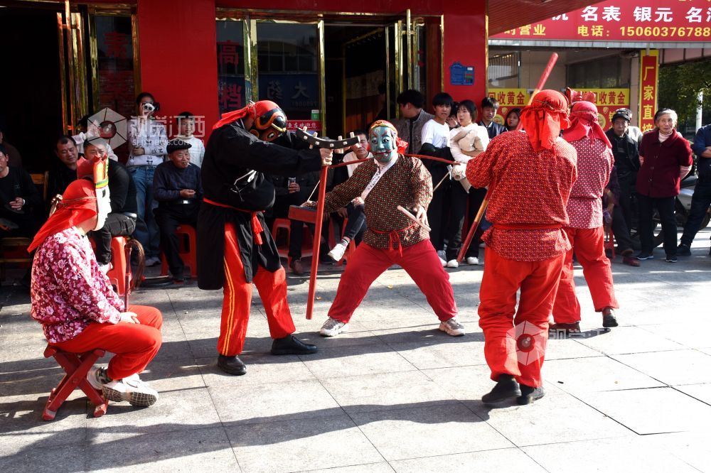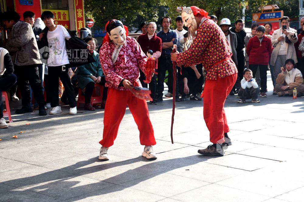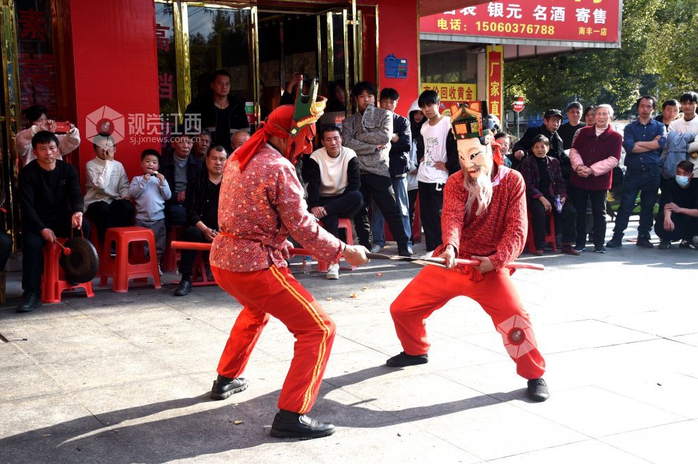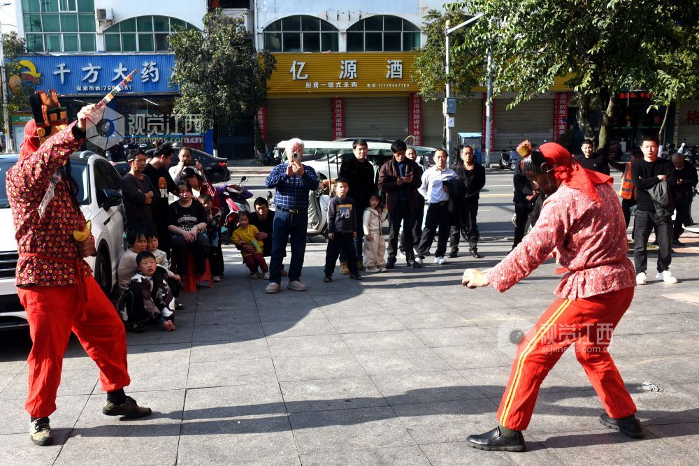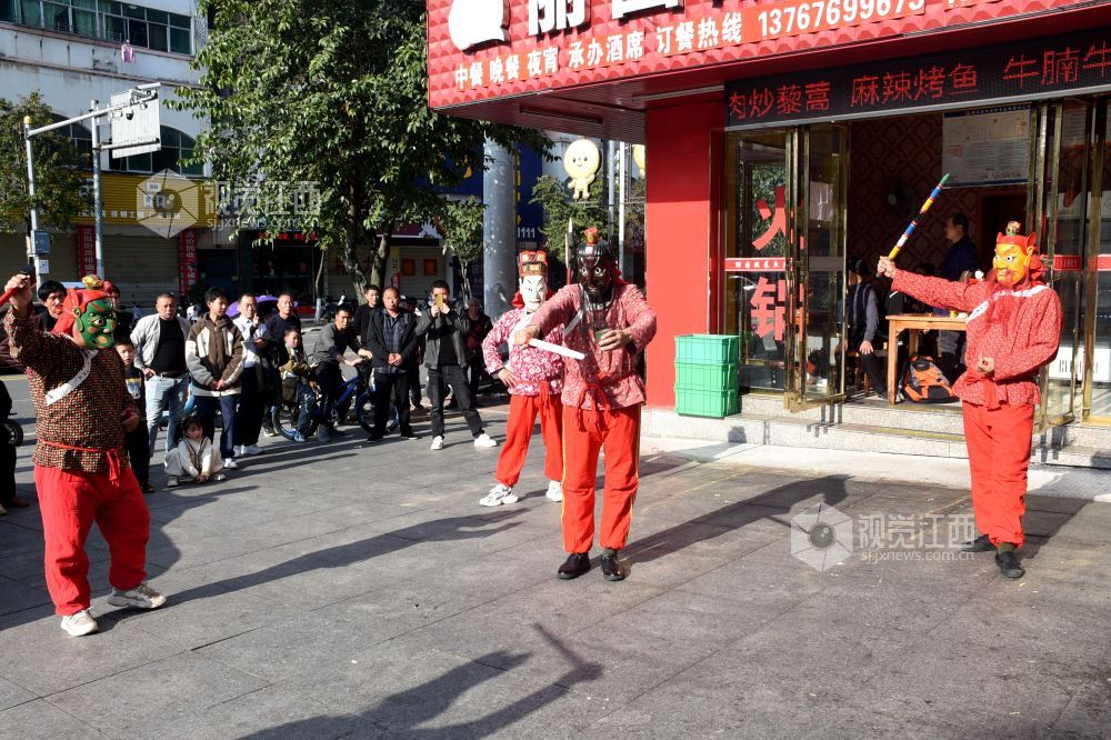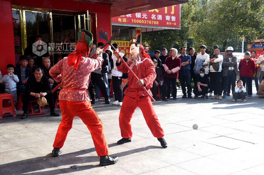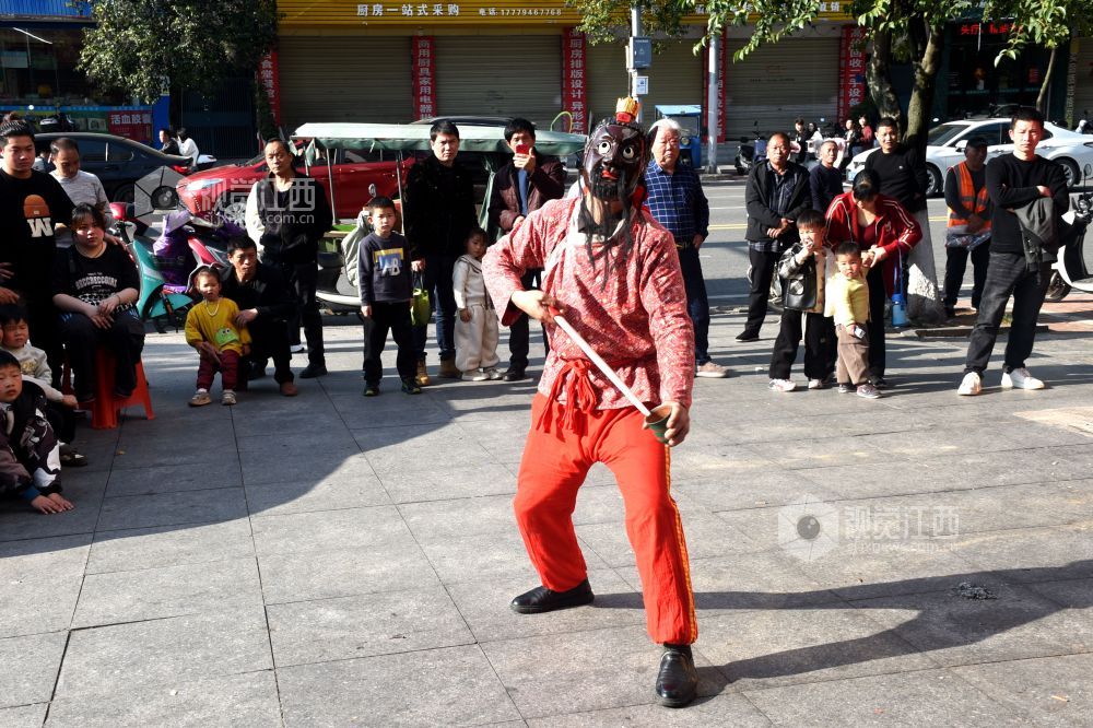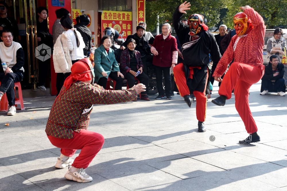 2024年2月14日,江西省抚州市南丰县桔都东路社区,傩班的傩师们在跳傩,吸引小区居民和过往游客驻足观看、拍照。