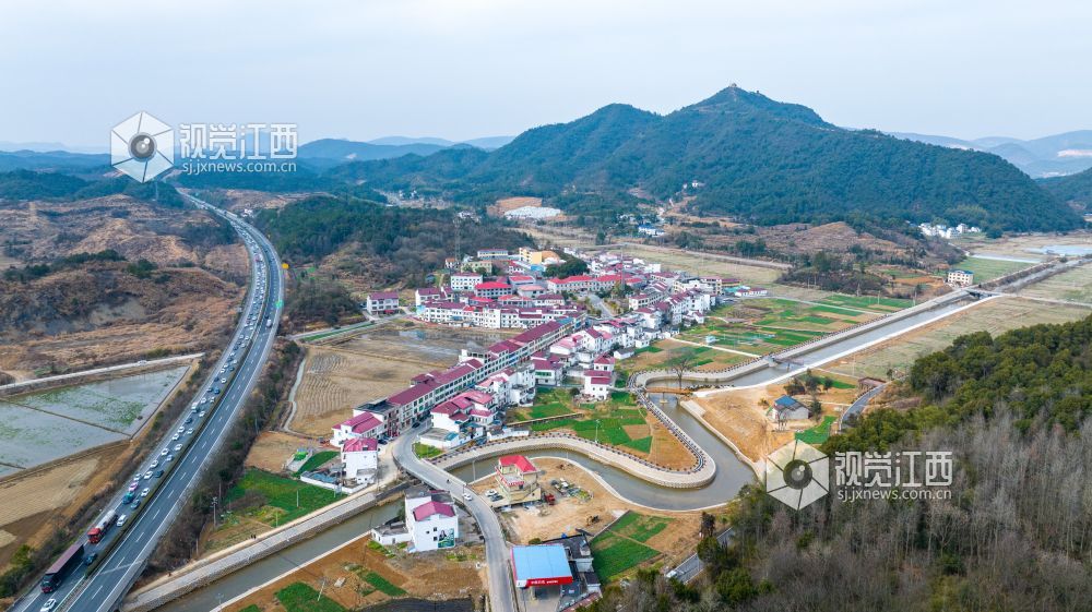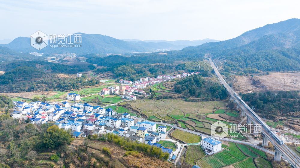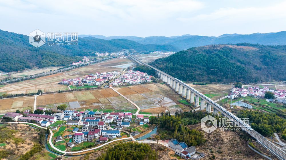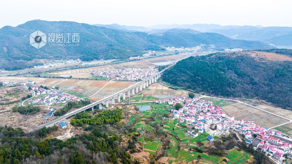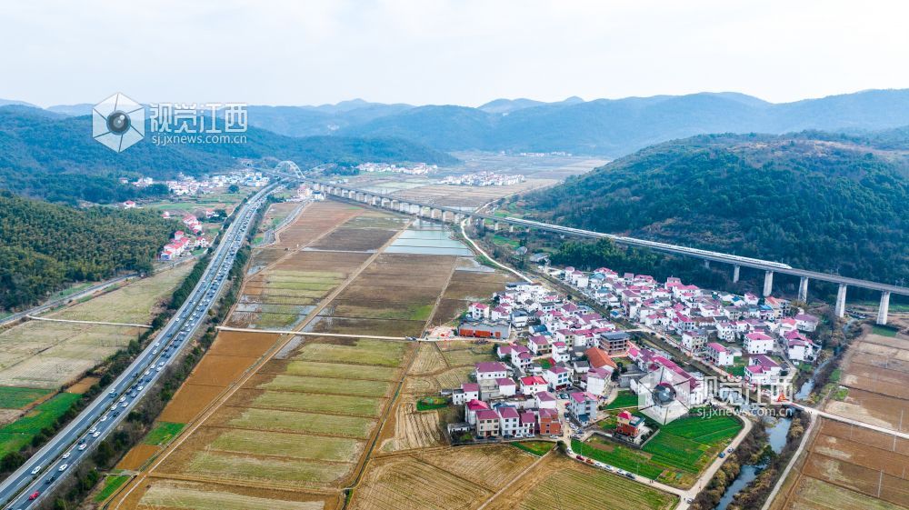 2024年2月14日,江西省瑞昌市南阳乡,穿境而过的武九客运专线、杭瑞高速公路宛如玉带,与村庄、田园和青山等构成了一幅充满希望的乡村春景图。