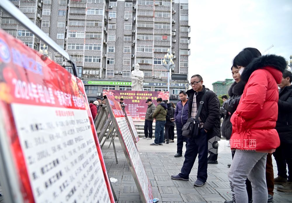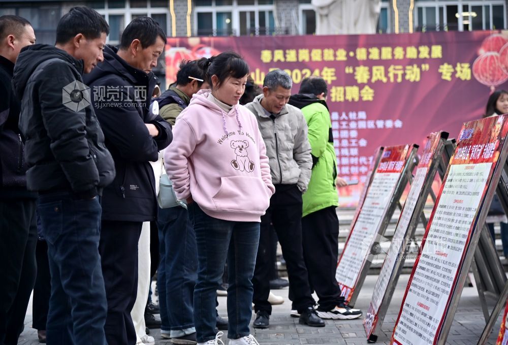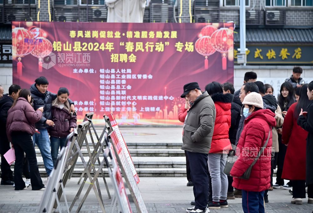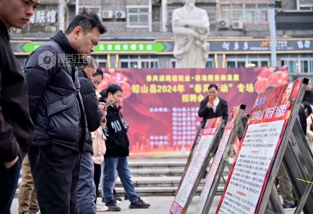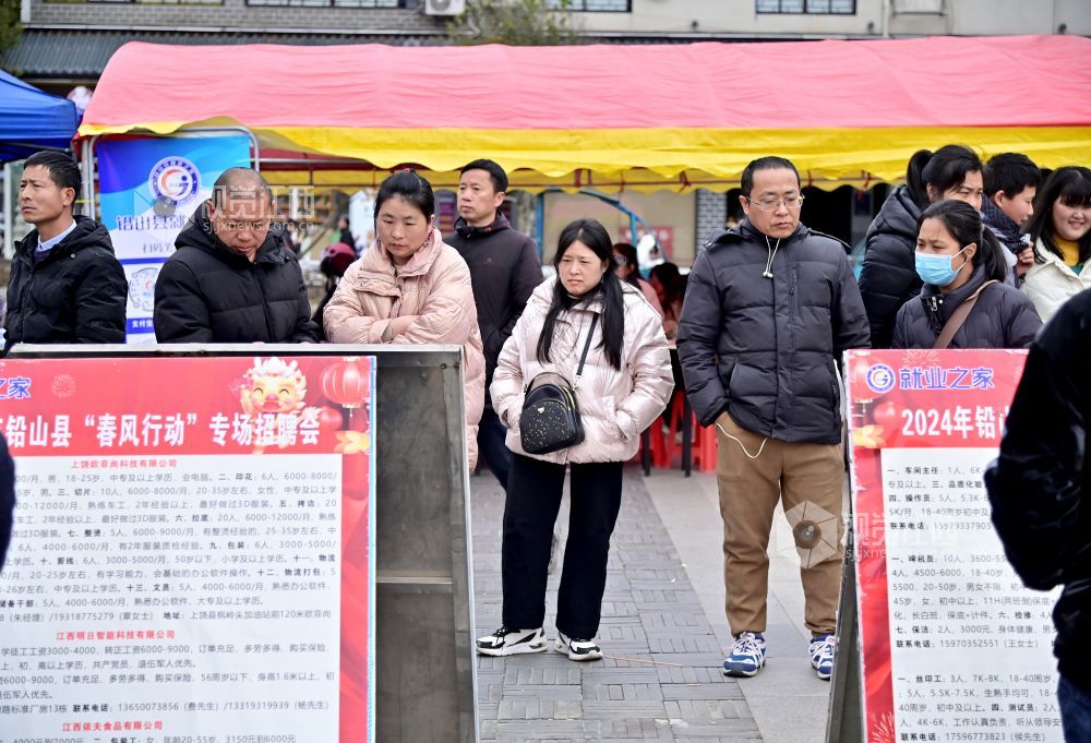 2024年2月16日,在江西省上饶市铅山县河口镇辛弃疾广场,市民正在寻找适合自己岗位。由铅山县人力资源和社会保障局、铅山县工业园区、铅山县残联、铅山县新时代文明实践促进中心等单位主办,铅山县就业创业服务中心承办的2024年“春风行动”系列招聘会正式启动,招聘会从2月15起至2月23日,将陆续深入乡镇举行招聘会。此次招聘以“春风送岗促就业,精准服务助发展”为主题,抓住春节前后劳动者换岗流动高峰期和外地务工人员集中返乡的关键期,为企业和求职者提供双向沟通、精准就业的服务,现场共有49家重点企业现场招聘,累计提供就业岗位数2000余个。