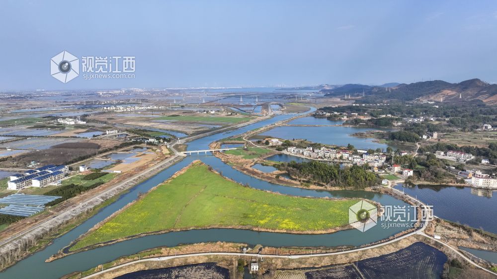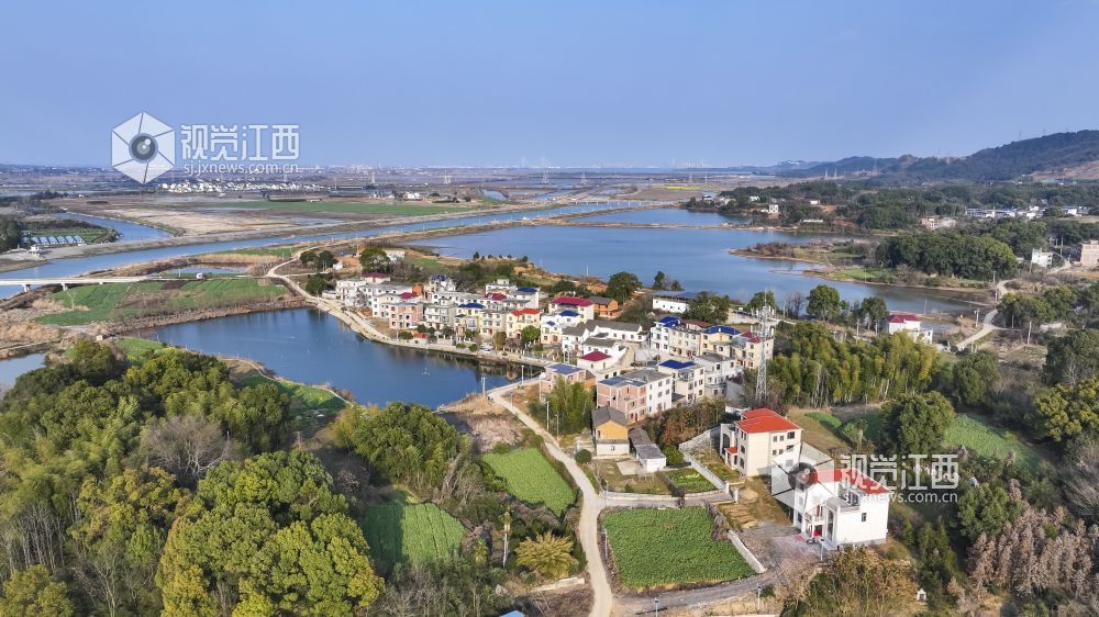 2024年2月17日,江西省九江市柴桑区新塘乡四华村,错落有致的村庄与青山、河流、田园等构成一幅多姿多彩的春日乡村画卷。