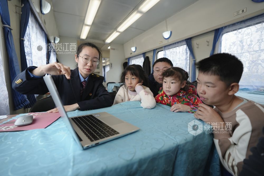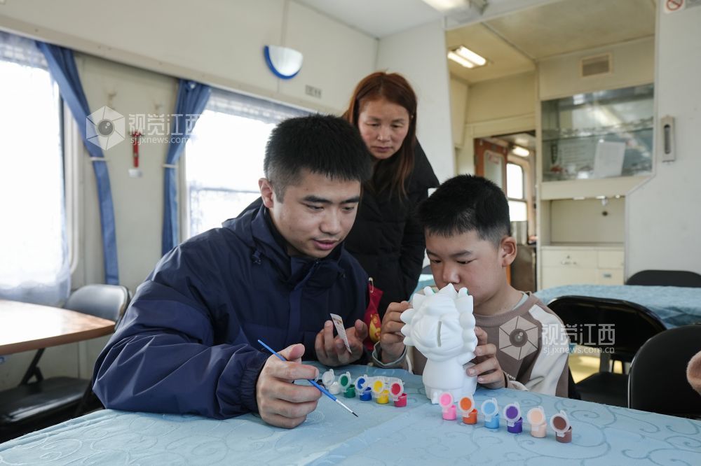 春运期间,由中国铁路南昌局集团有限公司值乘的列车上,团员青年们在做好日常工作的基础上,组织开展“快乐课堂”,通过“涂鸦DIY体验”和讲解铁路小知识,让旅途充满了欢笑。