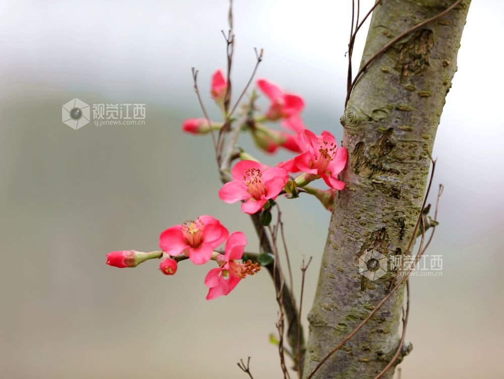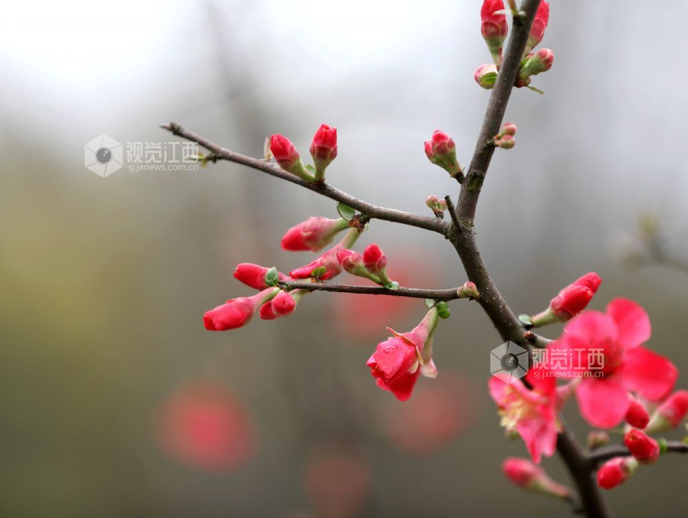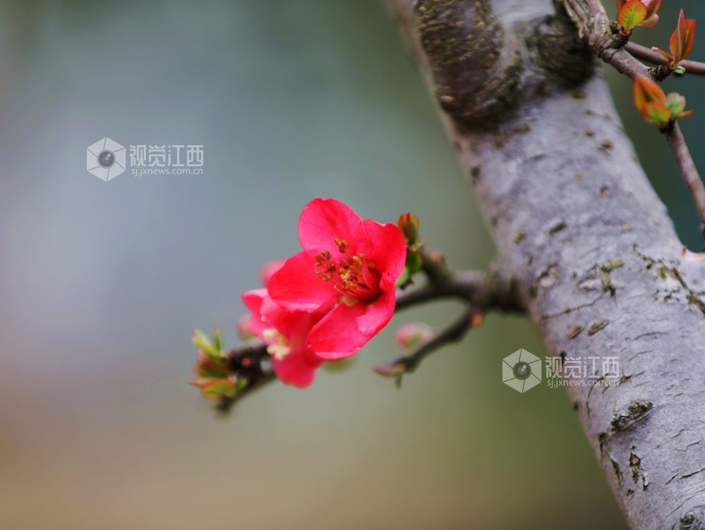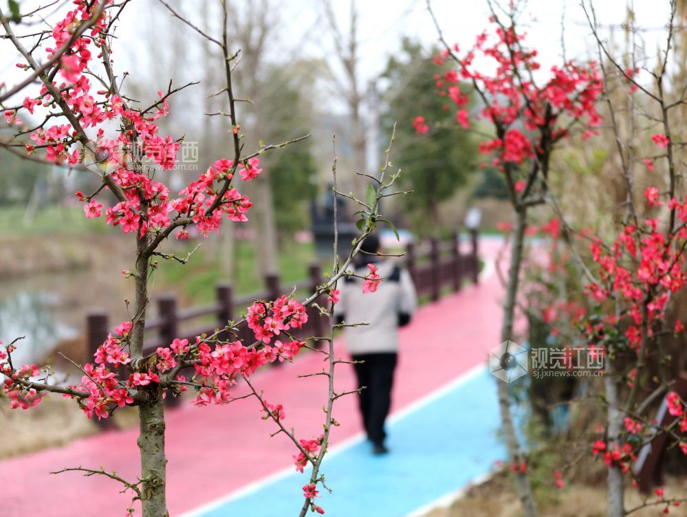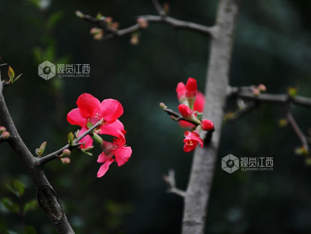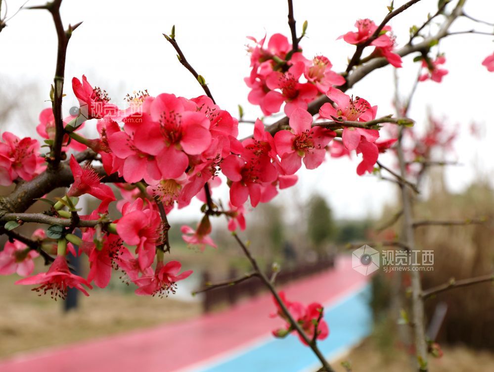 春雨凝寒冷未消,贴梗海棠竞妖娆。2024年2月26日,在江西省分宜县钤山湖生态湿地公园里,数十株贴梗海棠绽放出绚烂的“中国红”。贴梗海棠花梗极短,花朵紧贴在枝干上,火红色的海棠花鲜润丰腴、绚烂耀目。那一簇簇、红彤彤的花朵,美不胜收,吸引着市民的目光。